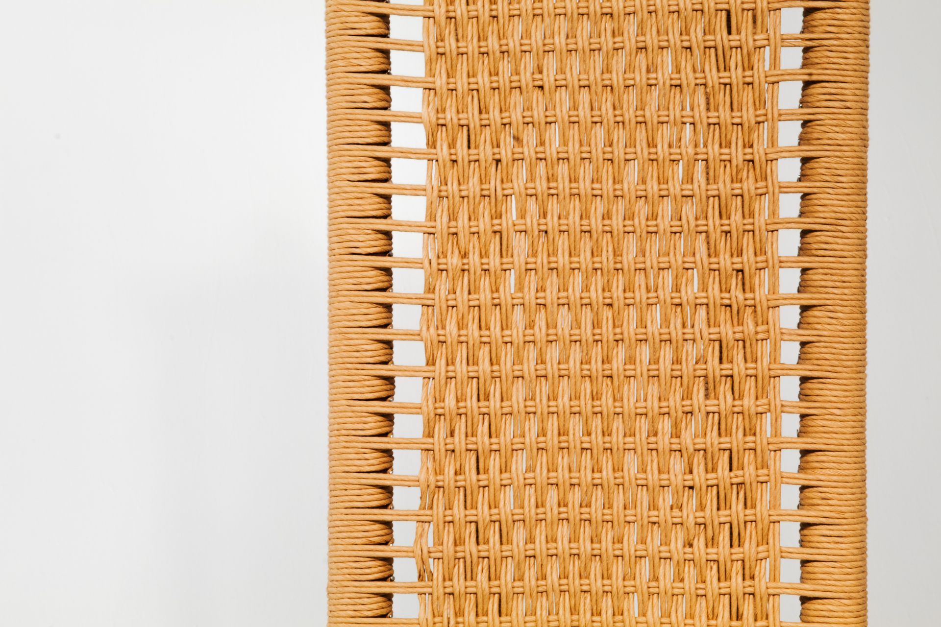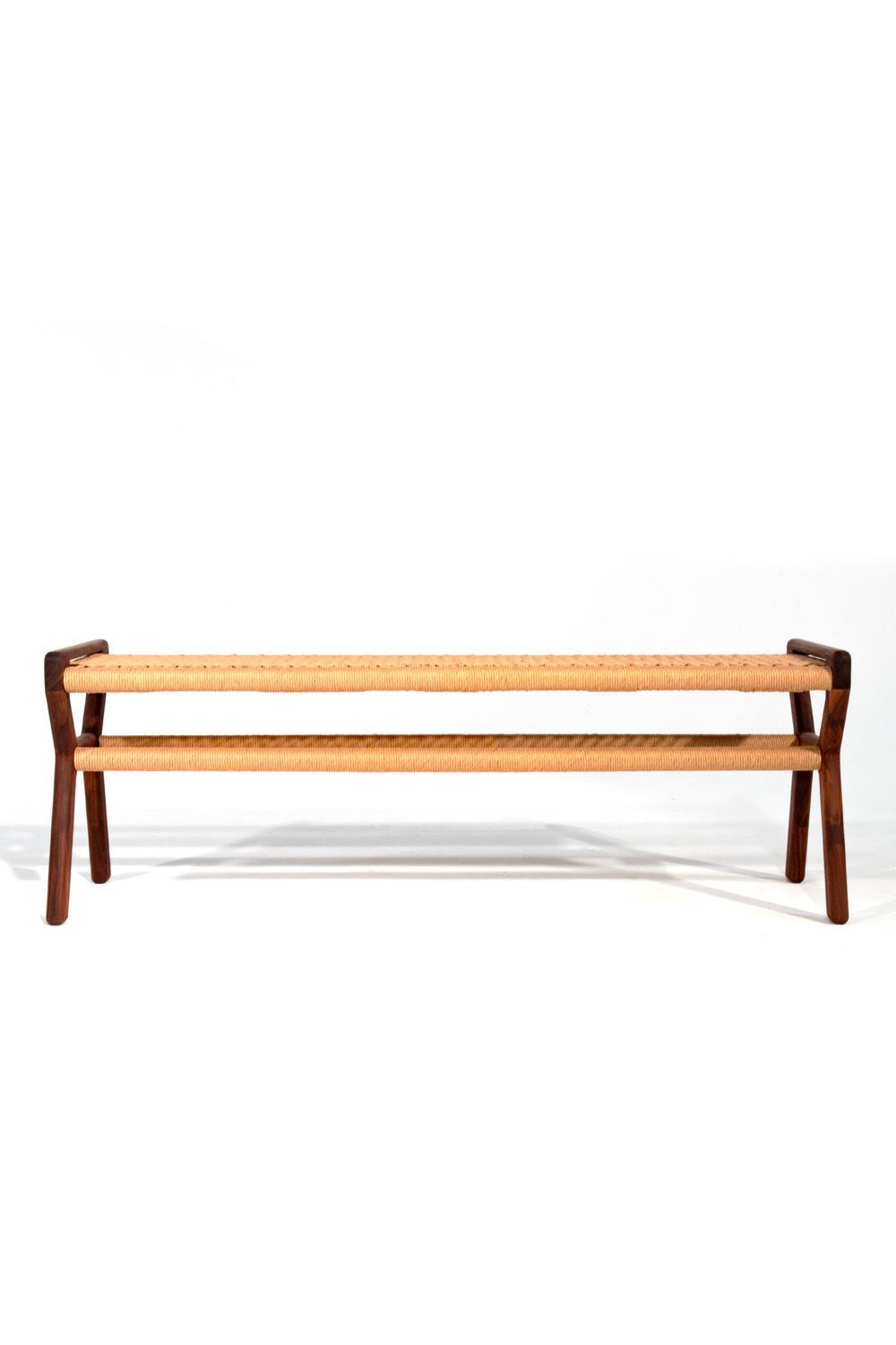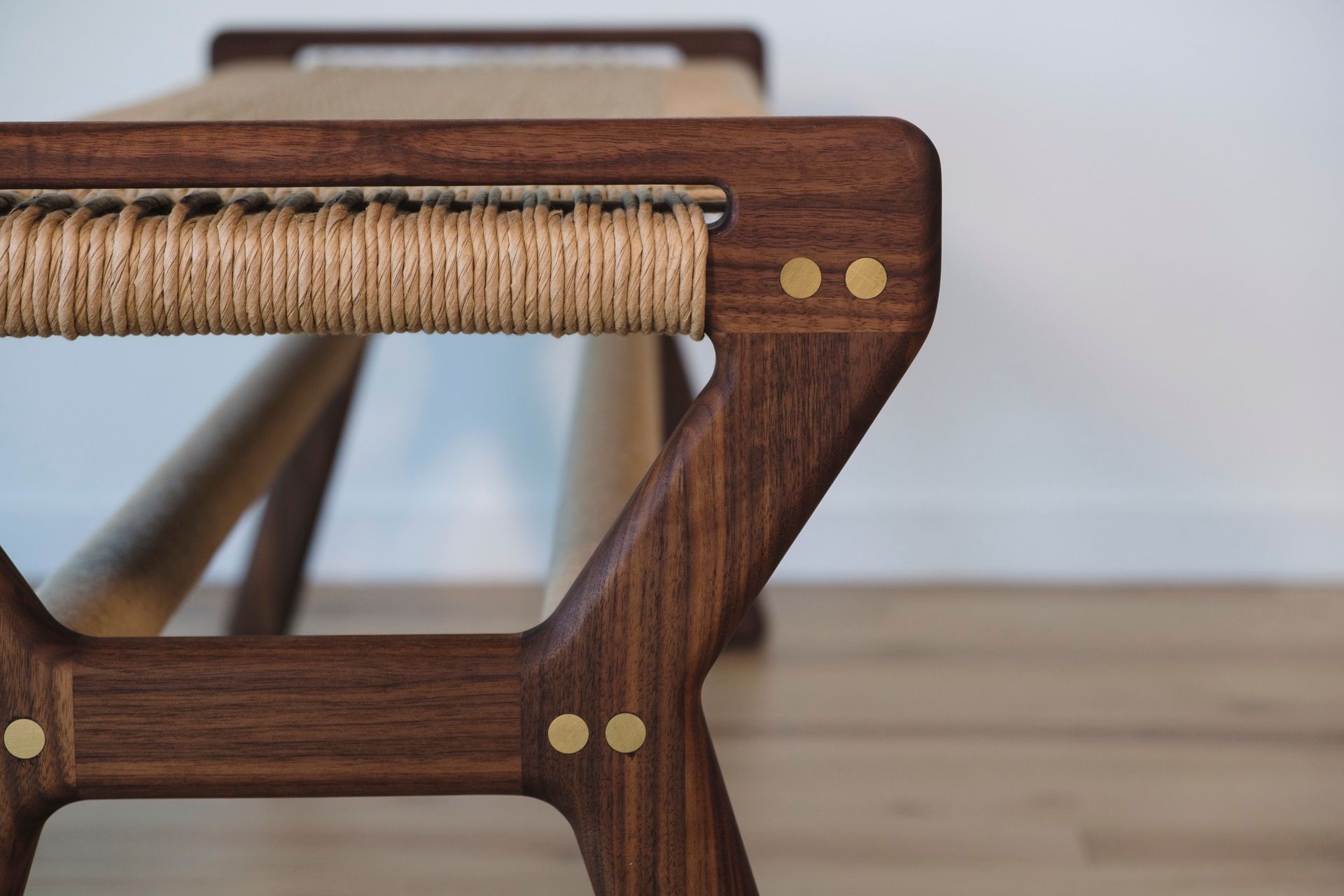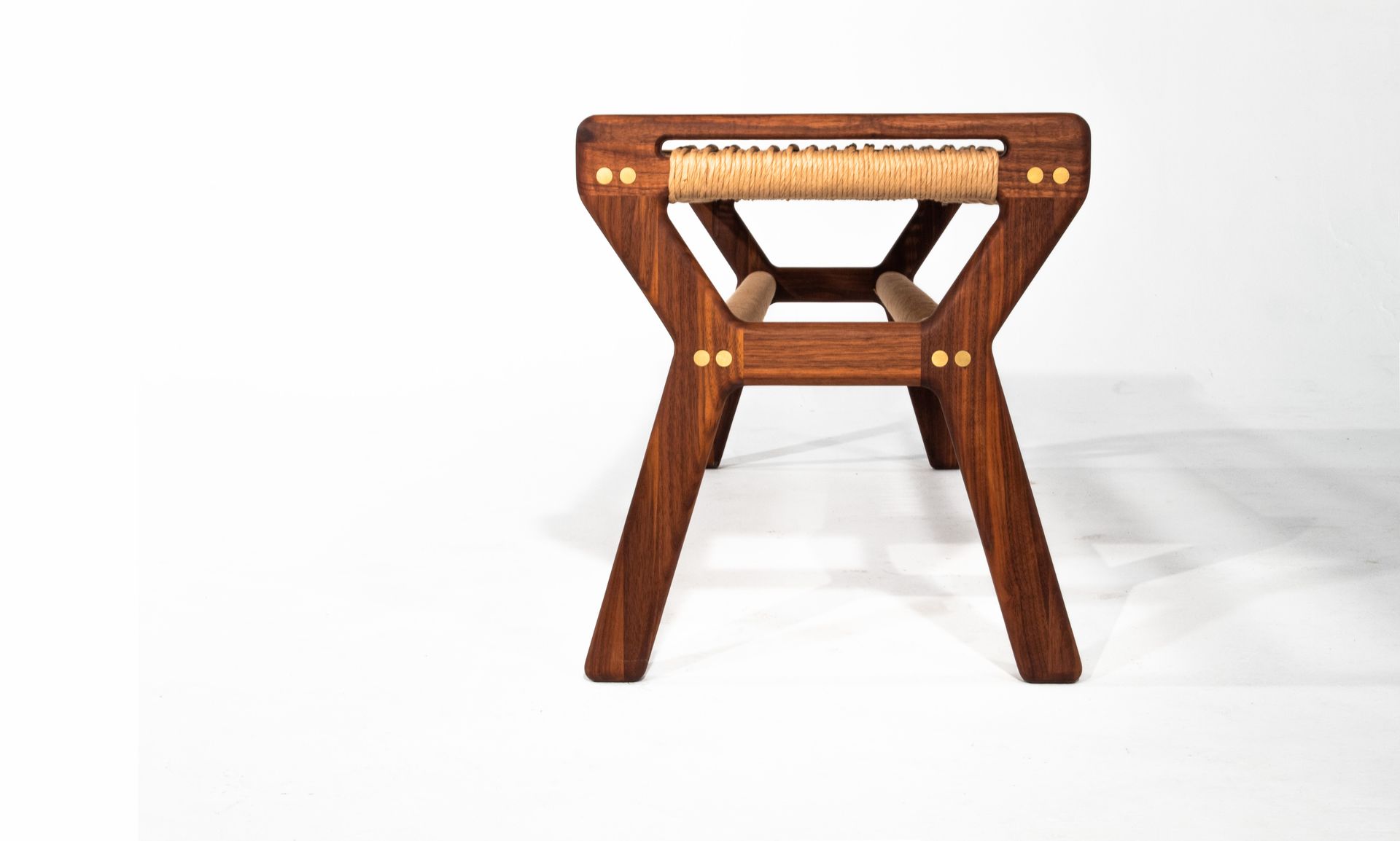 The Insignia Bench was a subtle approach at representing worn rank, badges, and medals in the military. Weaving paper Jute through the wall profile and stretchers to fashion the seat, the top rails create low “shoulder” boards. The cross supports are mortised into the sides and secured with brass dowels to abstractly reflect insignia from service uniforms.