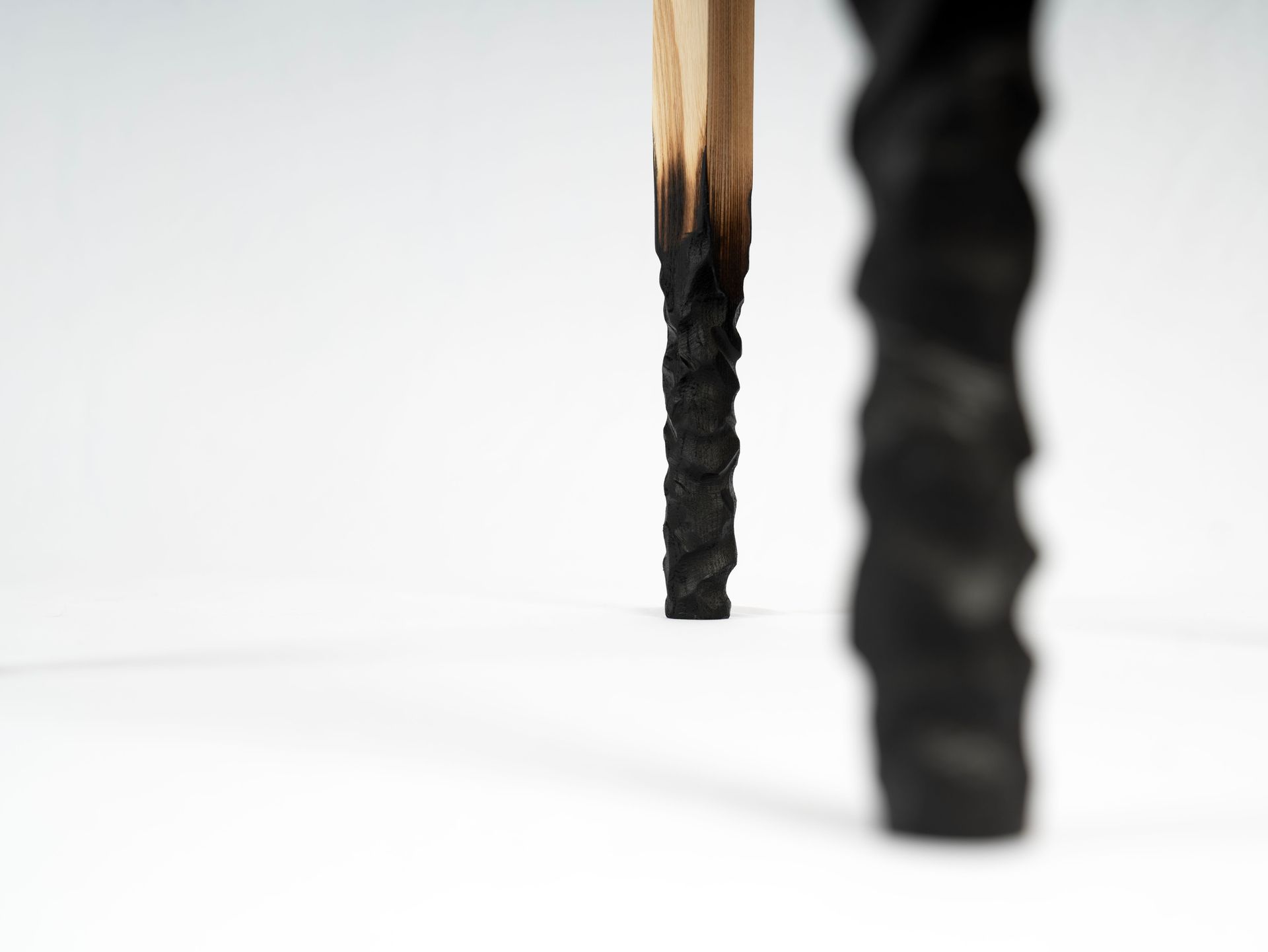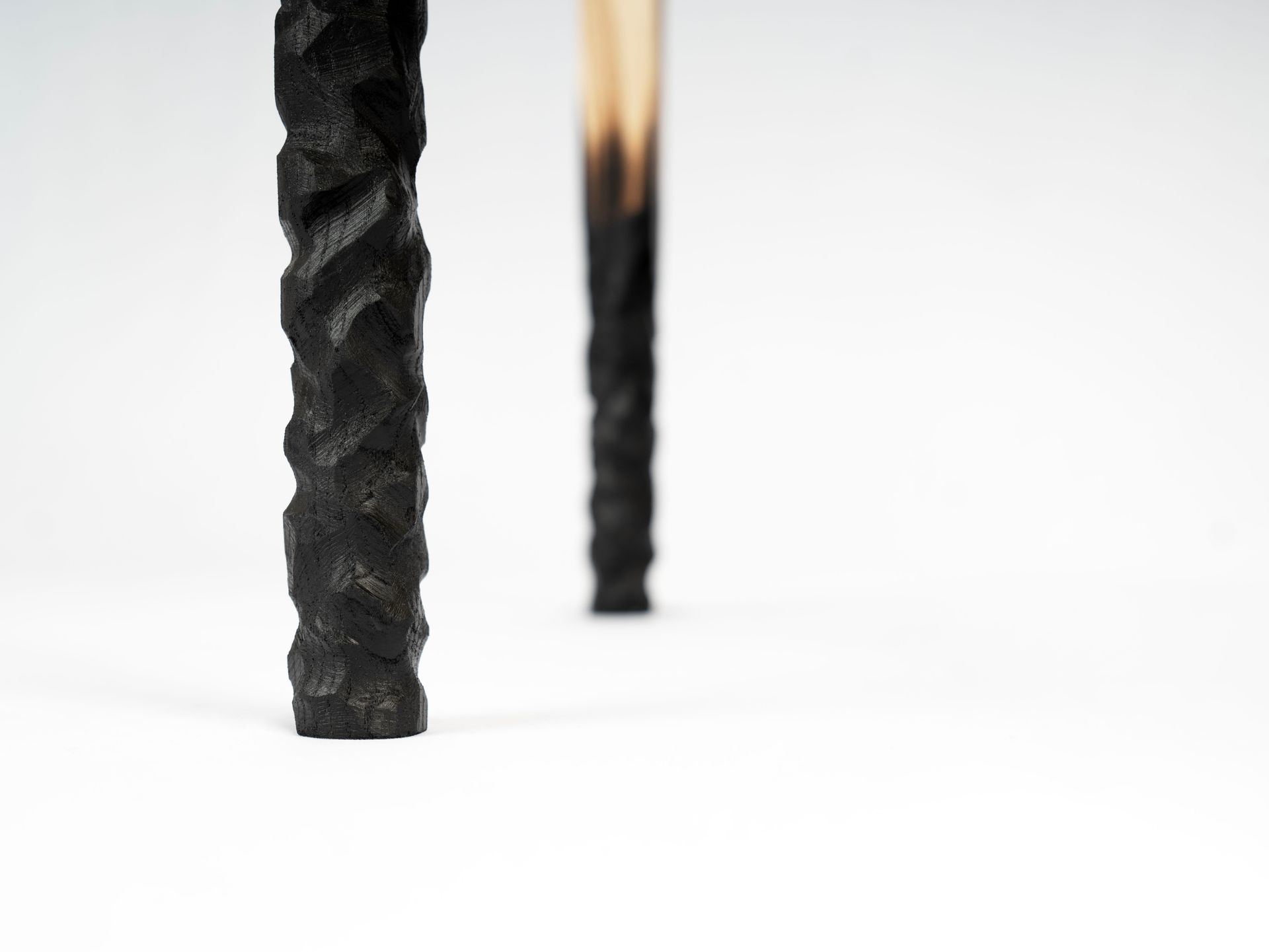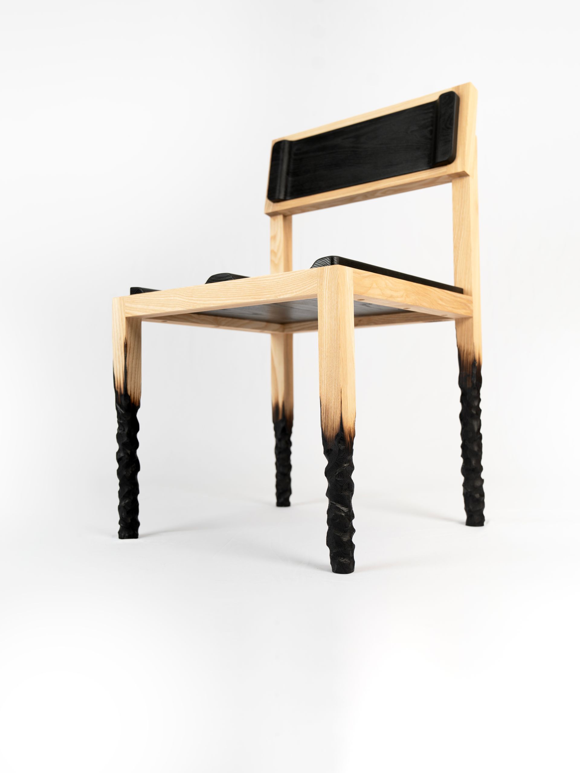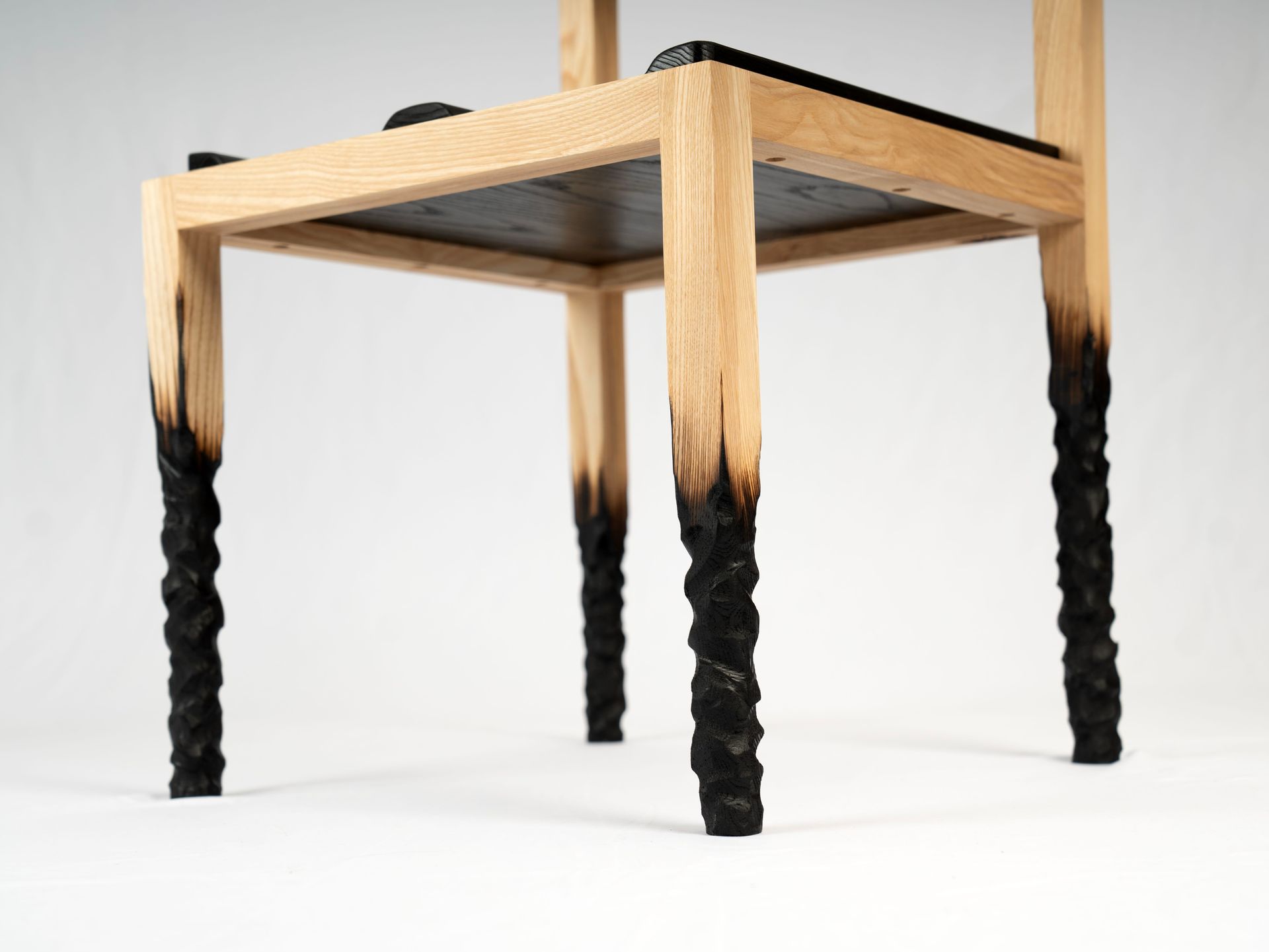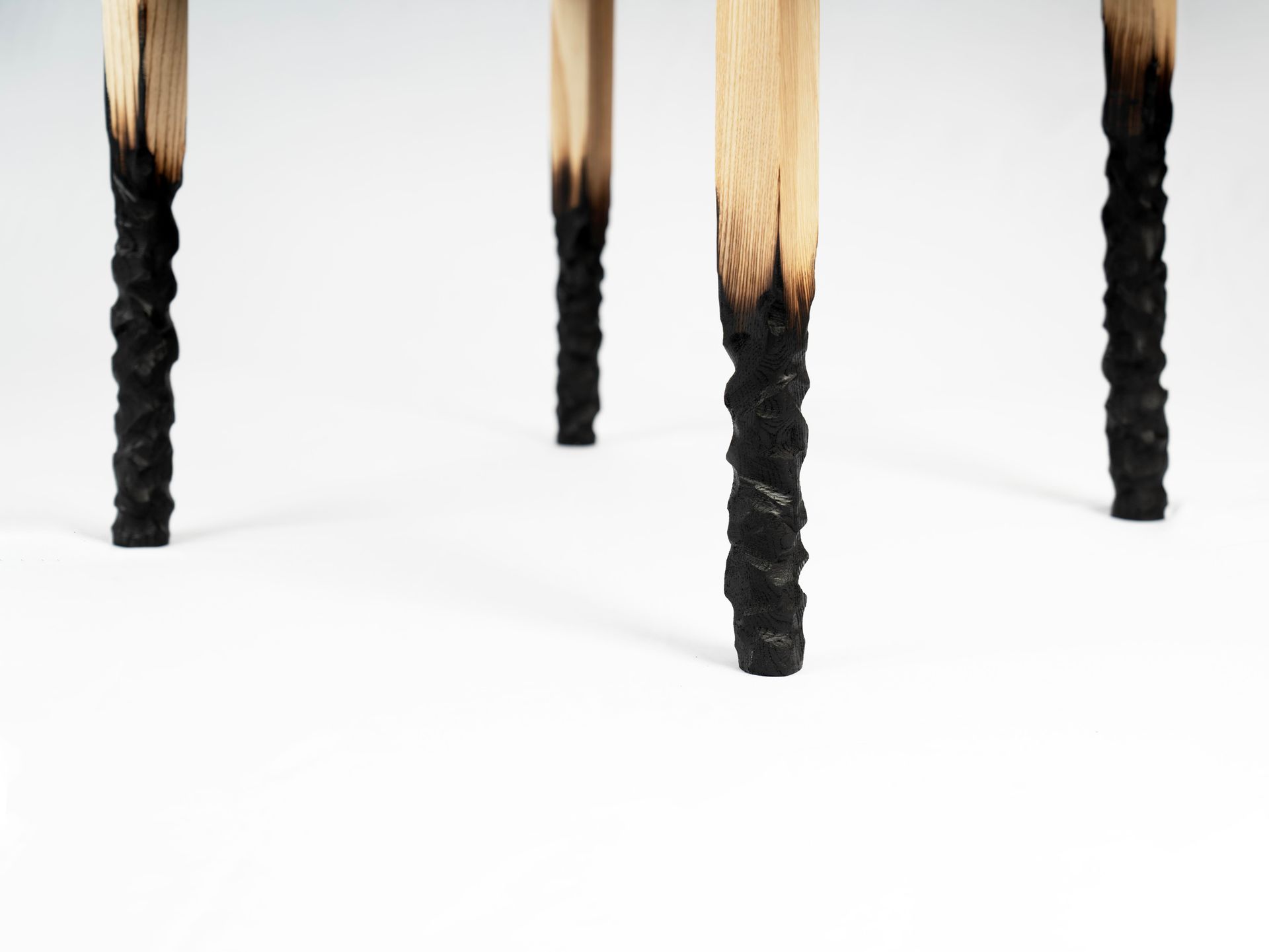 This dining chair is the predecessor to the Kindle table. Instead of a literal burnt matchstick form, I went with more simplified charred ends on each leg. Continuing with the theme of the Kindle series, it symbolize vulnerability, highlighting how easily the piece could collapse under pressure. Each charred stick represents the remnants of past hardships, reminding us that even seemingly feeble structures can rely on vulnerable foundations. Despite their burnt state, the legs still provide stability, demonstrating that even fragile elements can contribute to a greater strength.