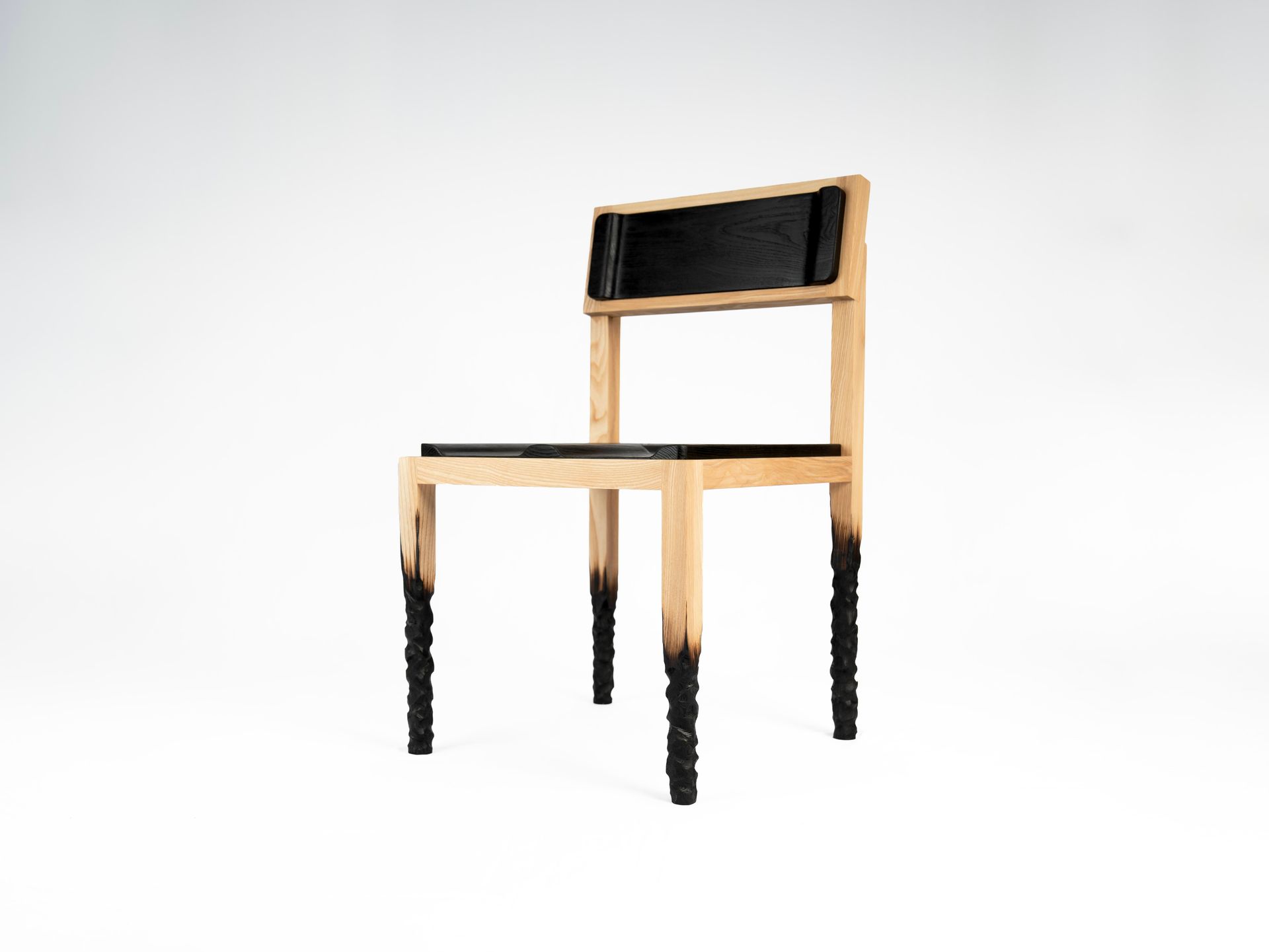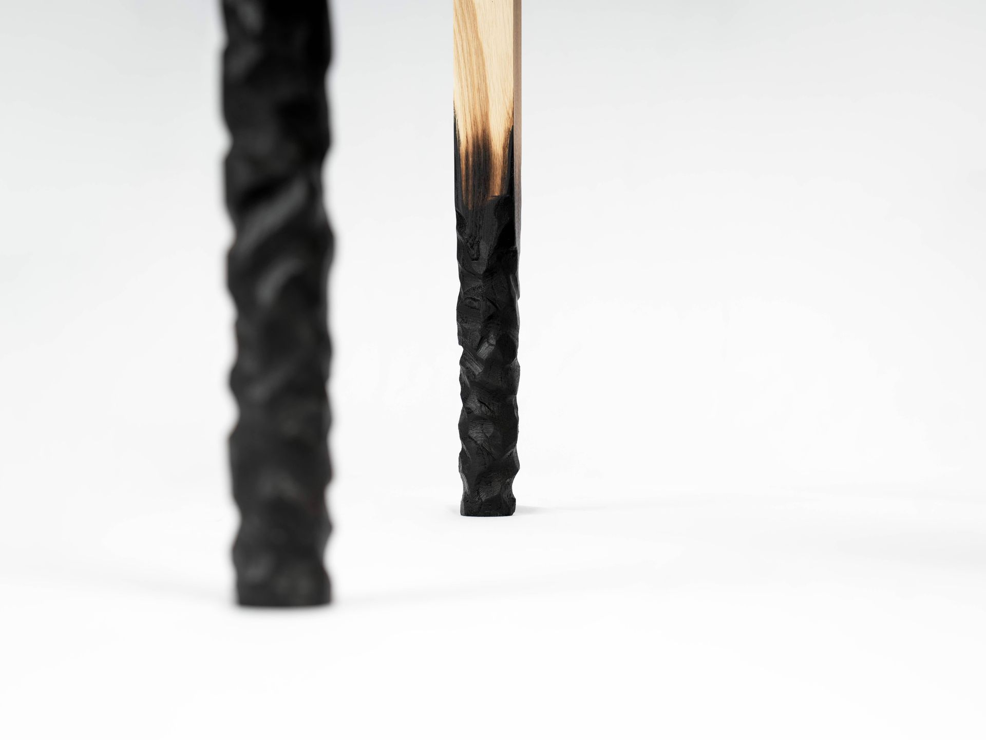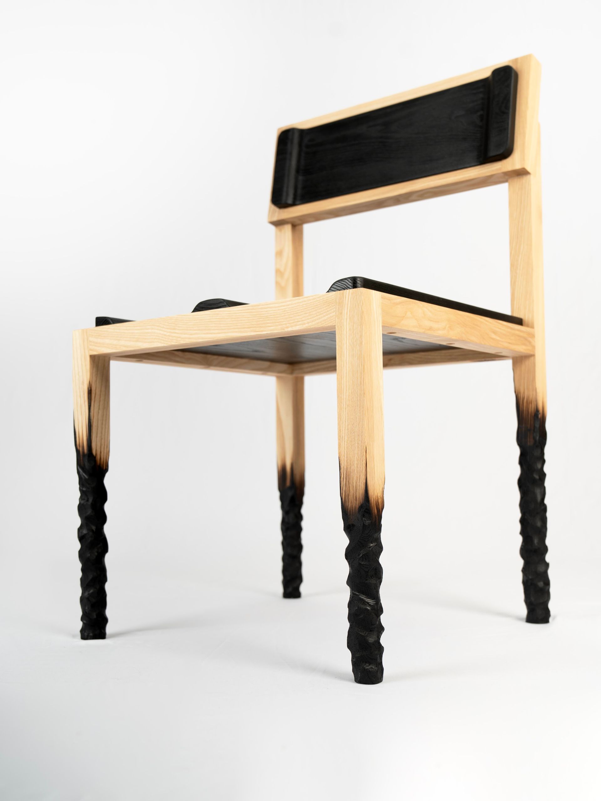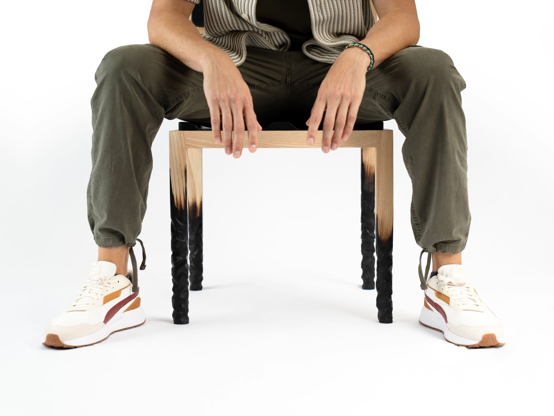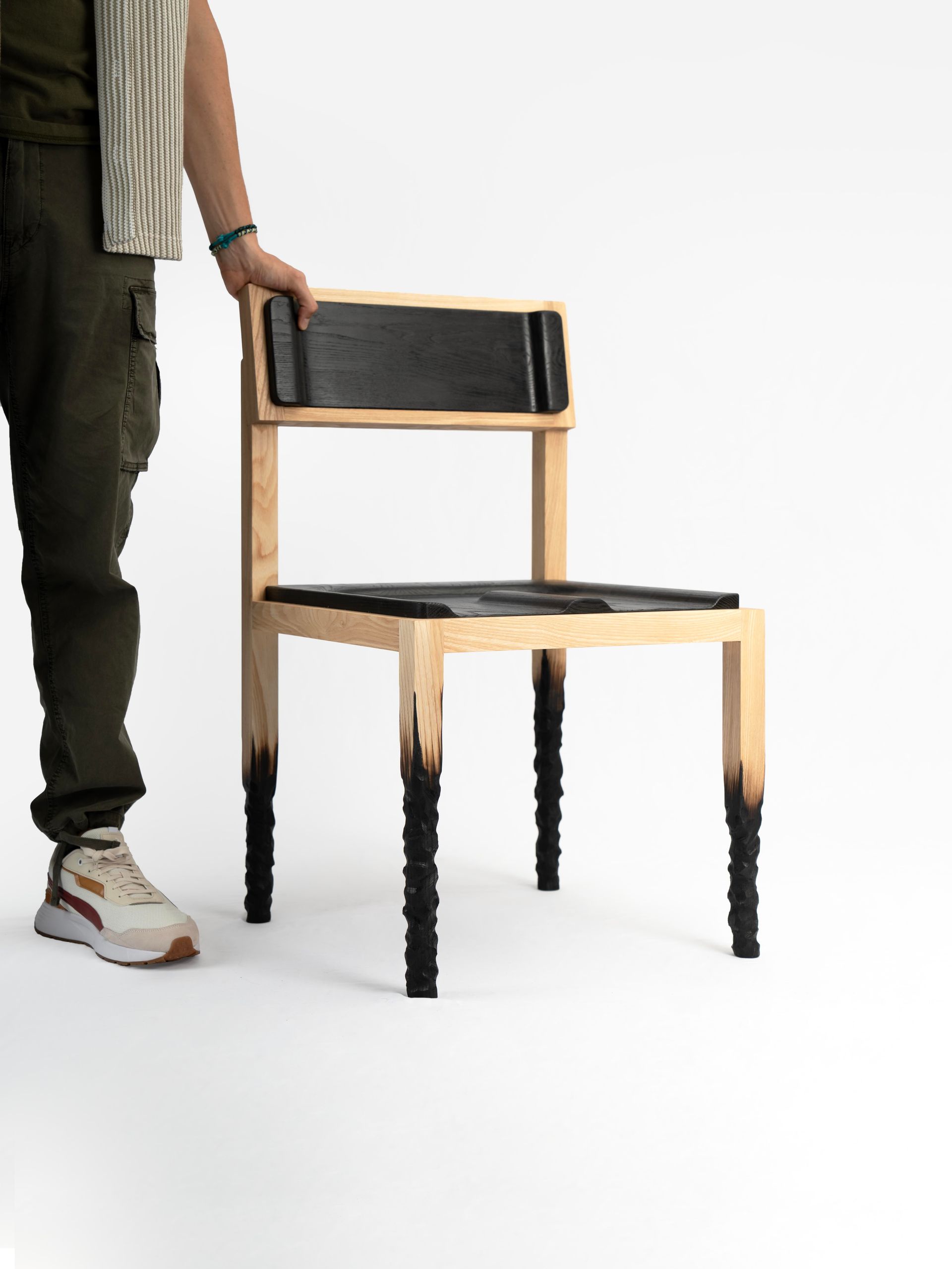 This dining chair is the predecessor to the Kindle table. Instead of a literal burnt matchstick form, I went with more simplified charred ends on each leg. Continuing with the theme of the Kindle series, it symbolize vulnerability, highlighting how easily the piece could collapse under pressure. Each charred stick represents the remnants of past hardships, reminding us that even seemingly feeble structures can rely on vulnerable foundations. Despite their burnt state, the legs still provide stability, demonstrating that even fragile elements can contribute to a greater strength.