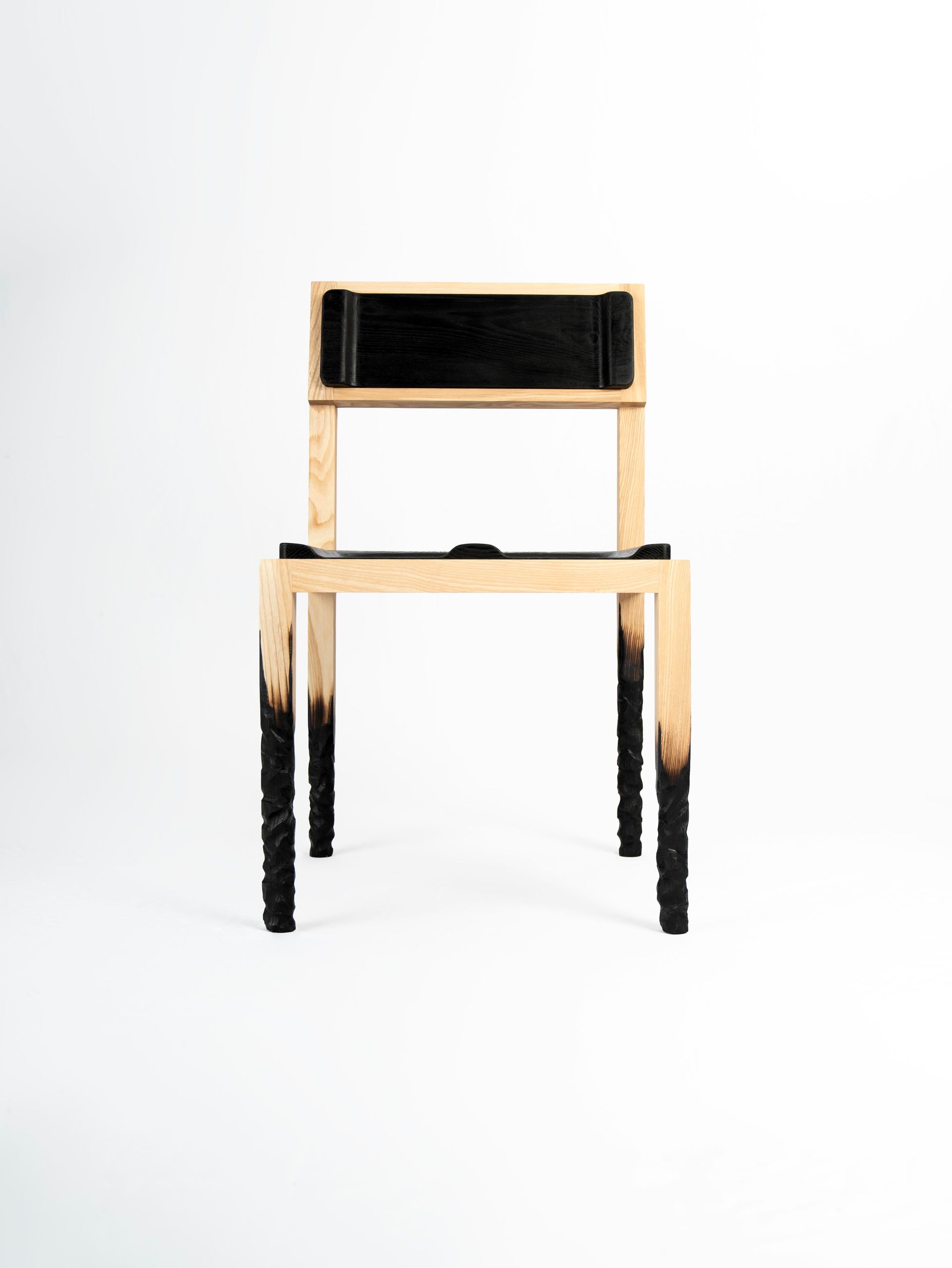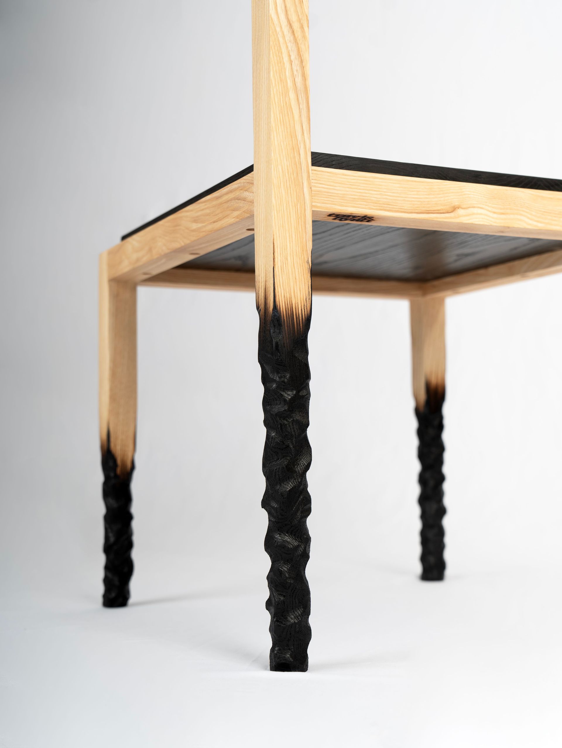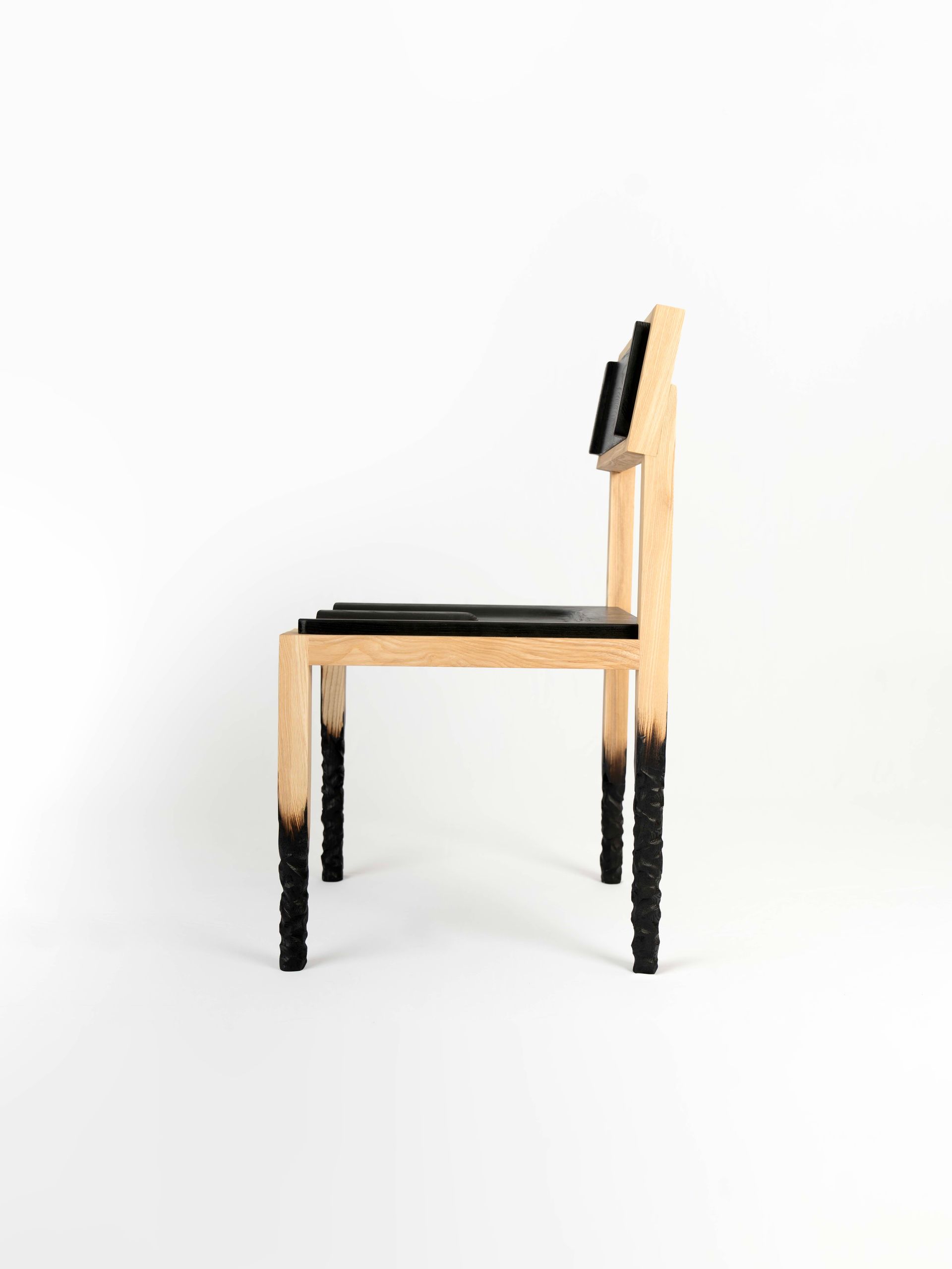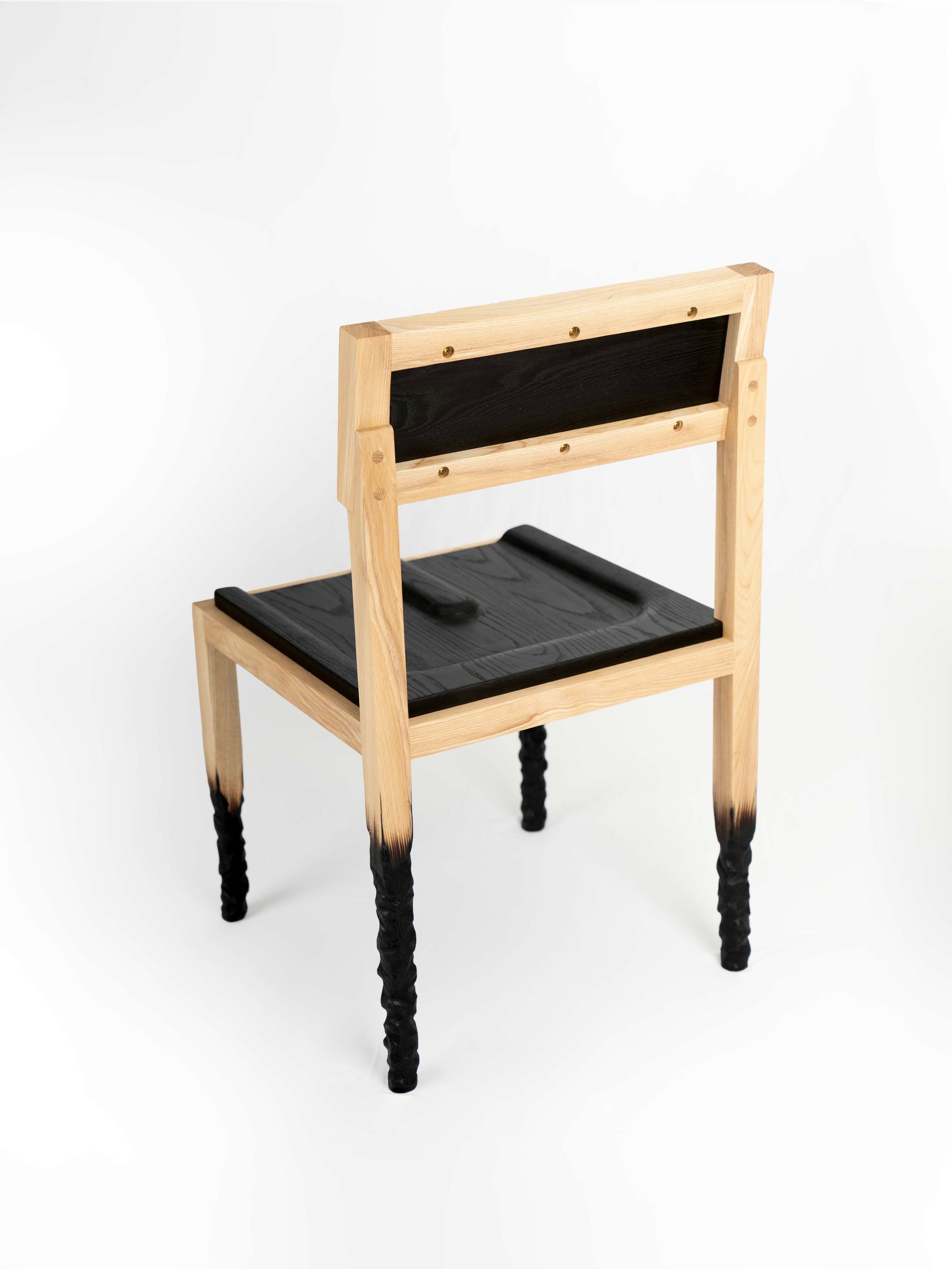 This dining chair is the predecessor to the Kindle table. Instead of a literal burnt matchstick form, I went with more simplified charred ends on each leg. Continuing with the theme of the Kindle series, it symbolize vulnerability, highlighting how easily the piece could collapse under pressure. Each charred stick represents the remnants of past hardships, reminding us that even seemingly feeble structures can rely on vulnerable foundations. Despite their burnt state, the legs still provide stability, demonstrating that even fragile elements can contribute to a greater strength.