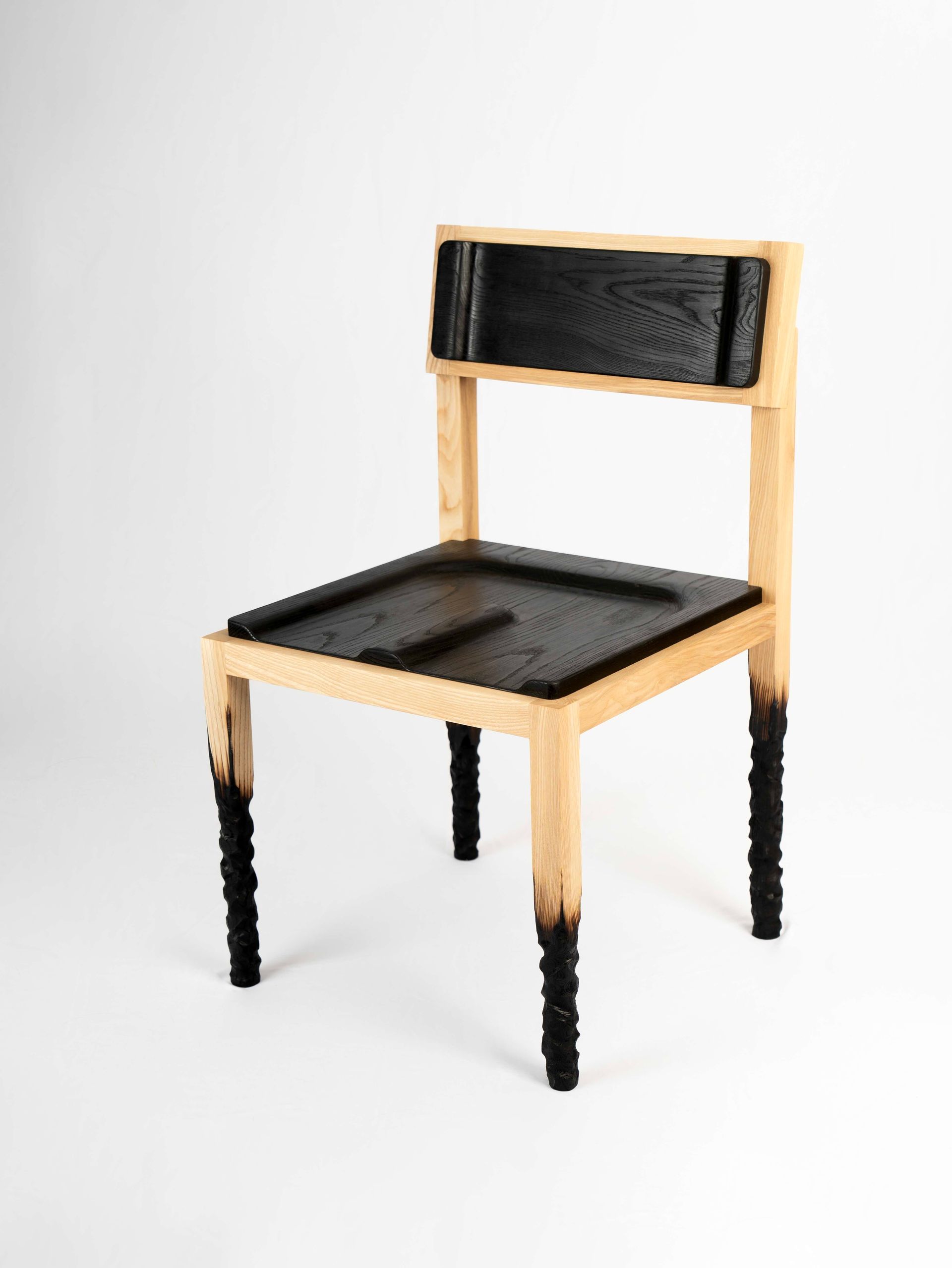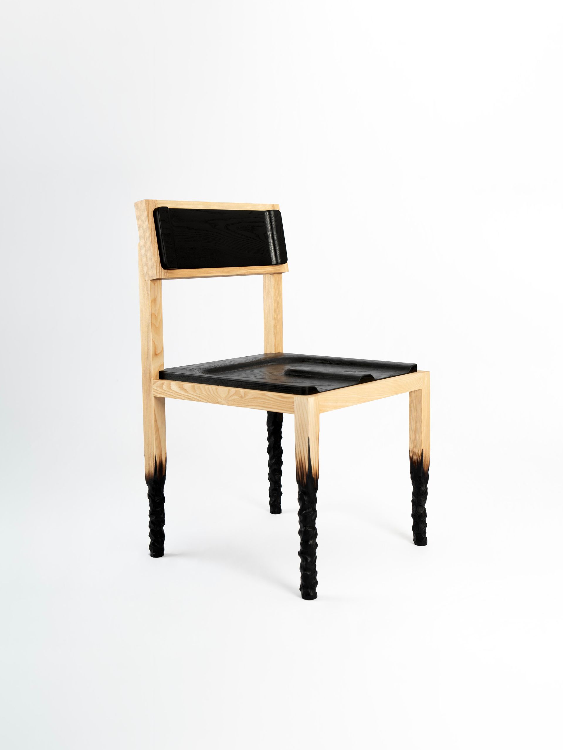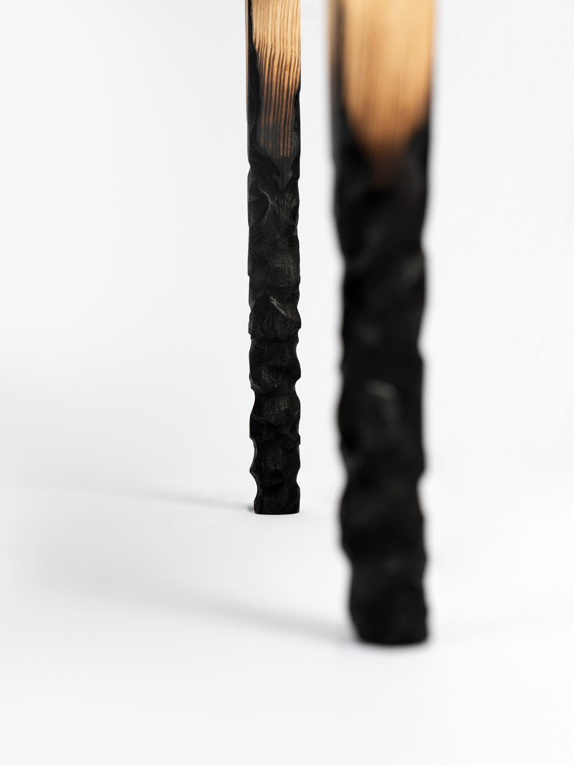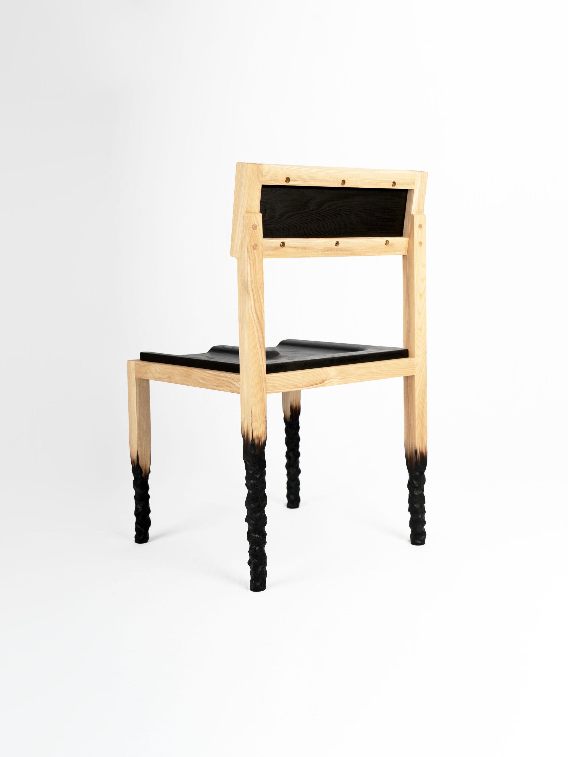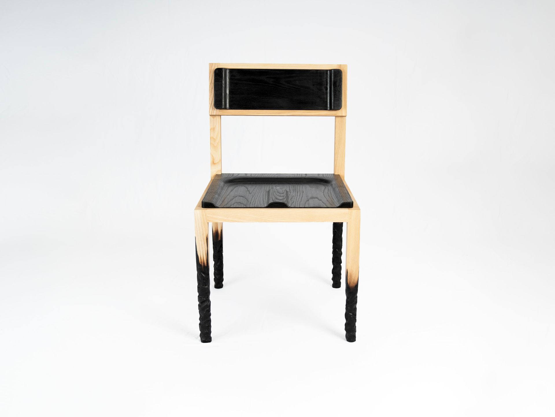 This dining chair is the predecessor to the Kindle table. Instead of a literal burnt matchstick form, I went with more simplified charred ends on each leg. Continuing with the theme of the Kindle series, it symbolize vulnerability, highlighting how easily the piece could collapse under pressure. Each charred stick represents the remnants of past hardships, reminding us that even seemingly feeble structures can rely on vulnerable foundations. Despite their burnt state, the legs still provide stability, demonstrating that even fragile elements can contribute to a greater strength.