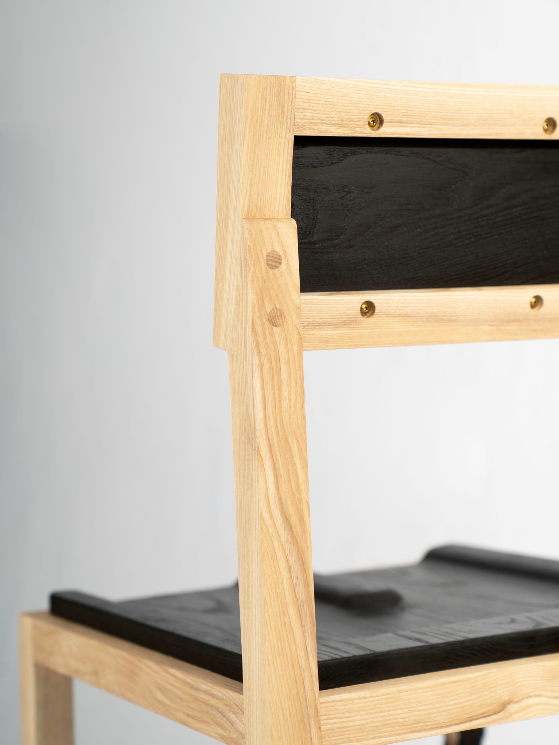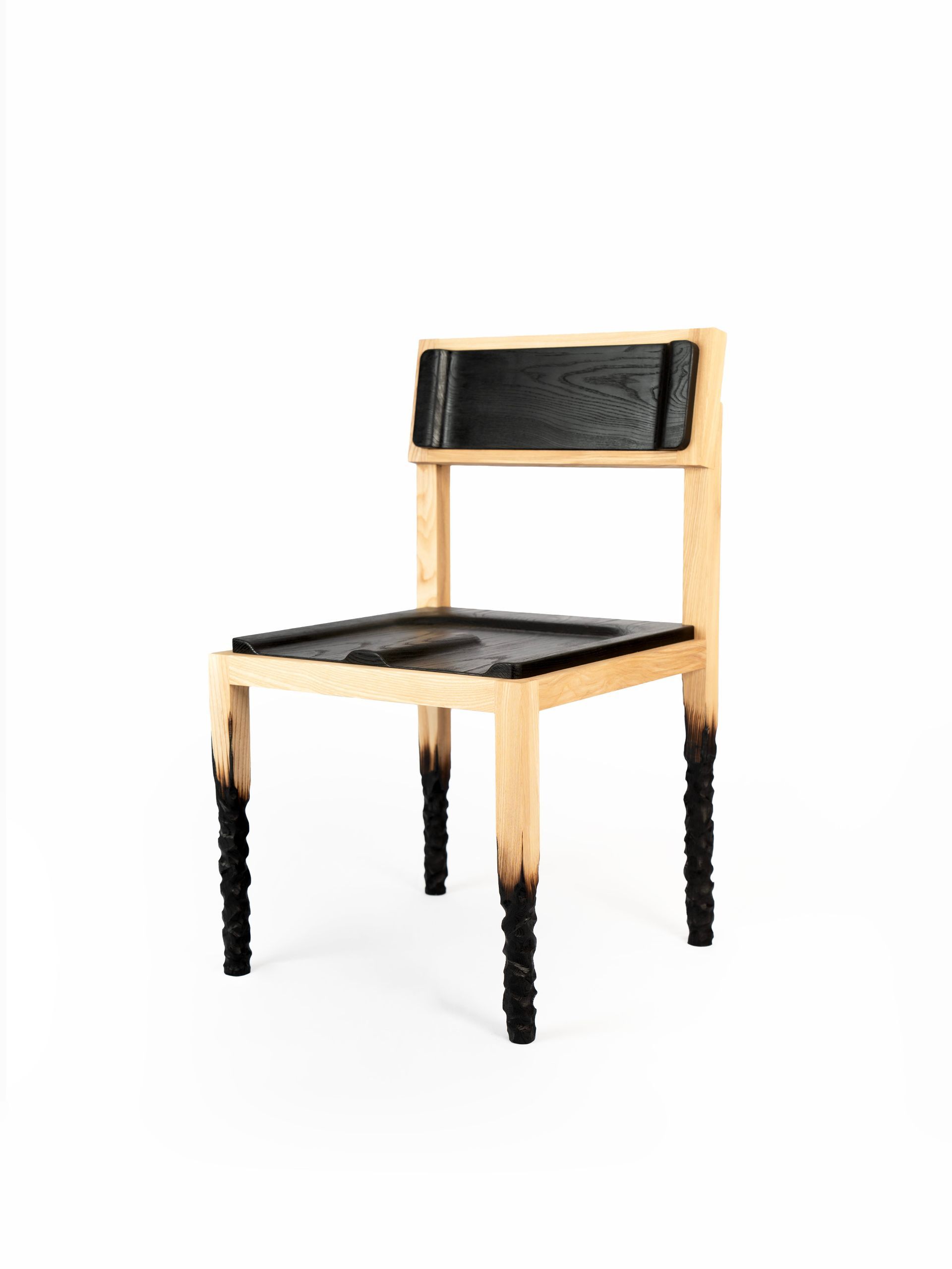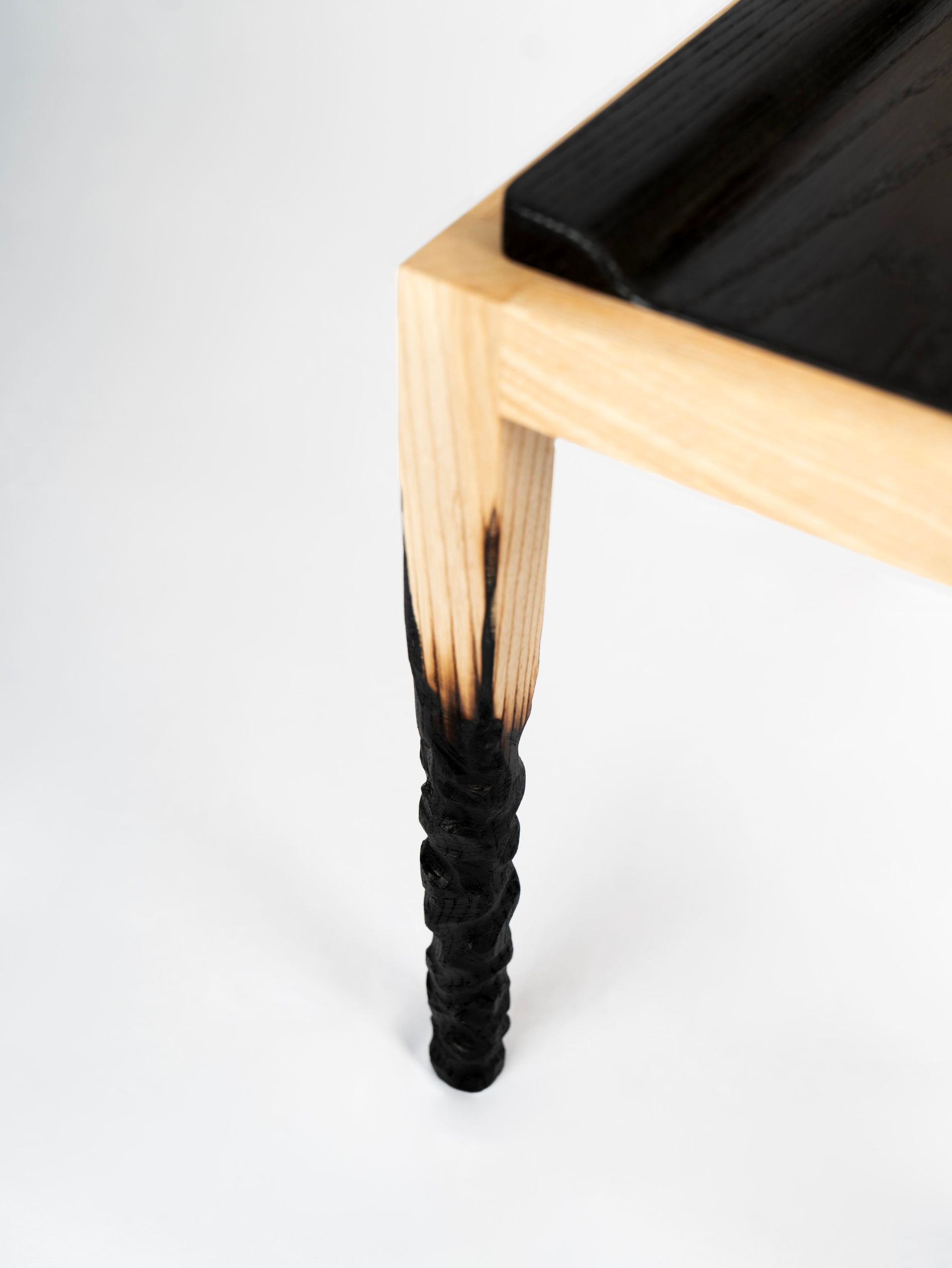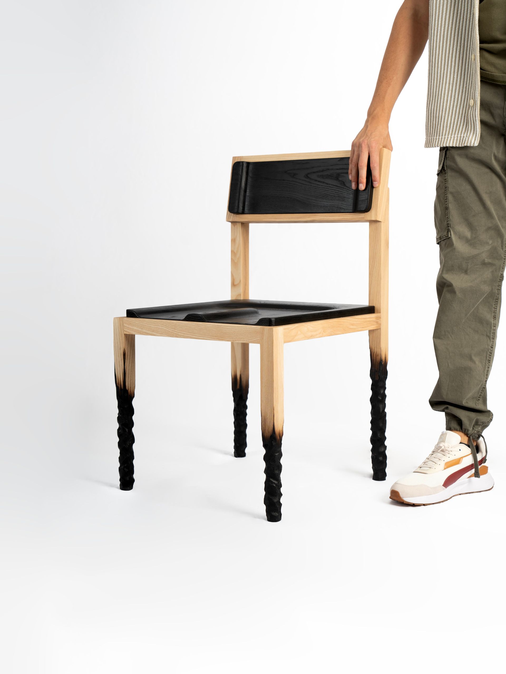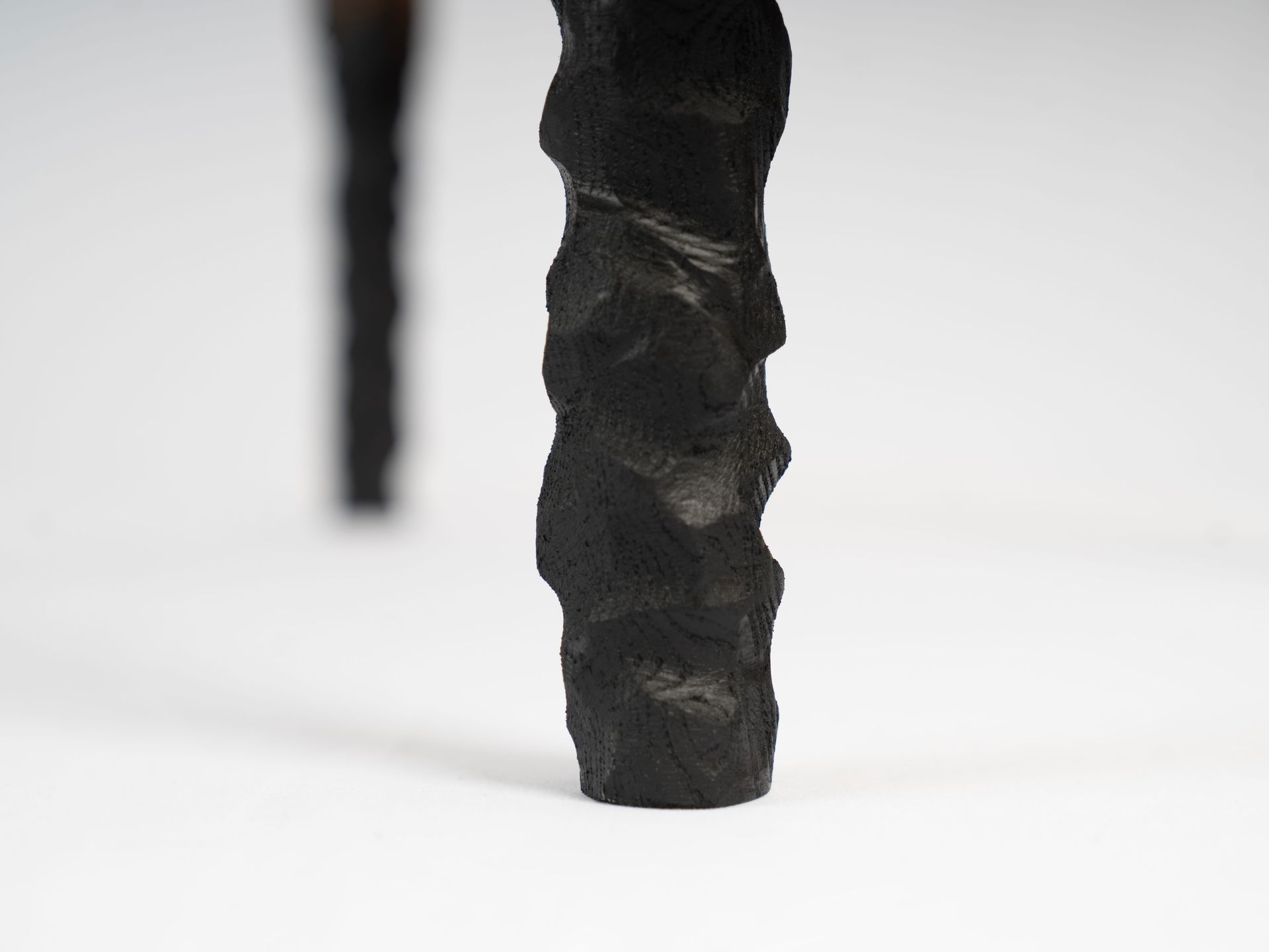 This dining chair is the predecessor to the Kindle table. Instead of a literal burnt matchstick form, I went with more simplified charred ends on each leg. Continuing with the theme of the Kindle series, it symbolize vulnerability, highlighting how easily the piece could collapse under pressure. Each charred stick represents the remnants of past hardships, reminding us that even seemingly feeble structures can rely on vulnerable foundations. Despite their burnt state, the legs still provide stability, demonstrating that even fragile elements can contribute to a greater strength.