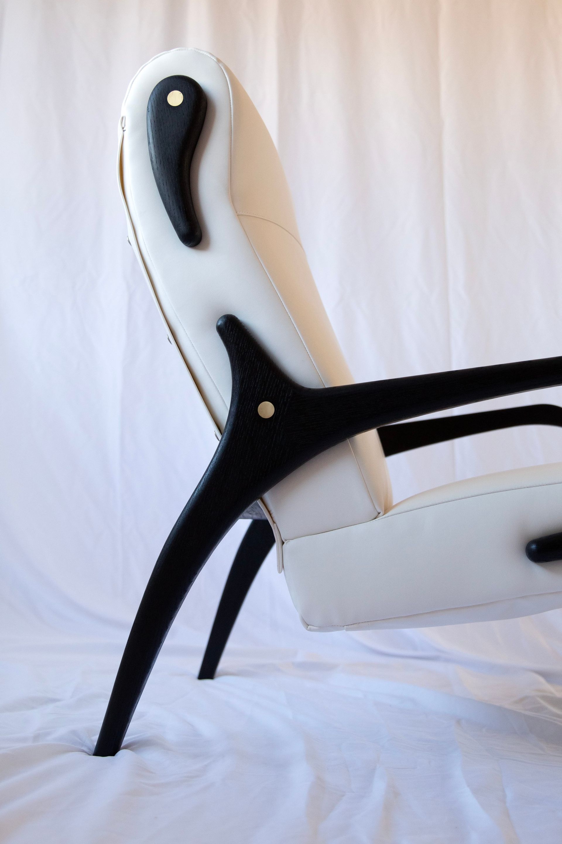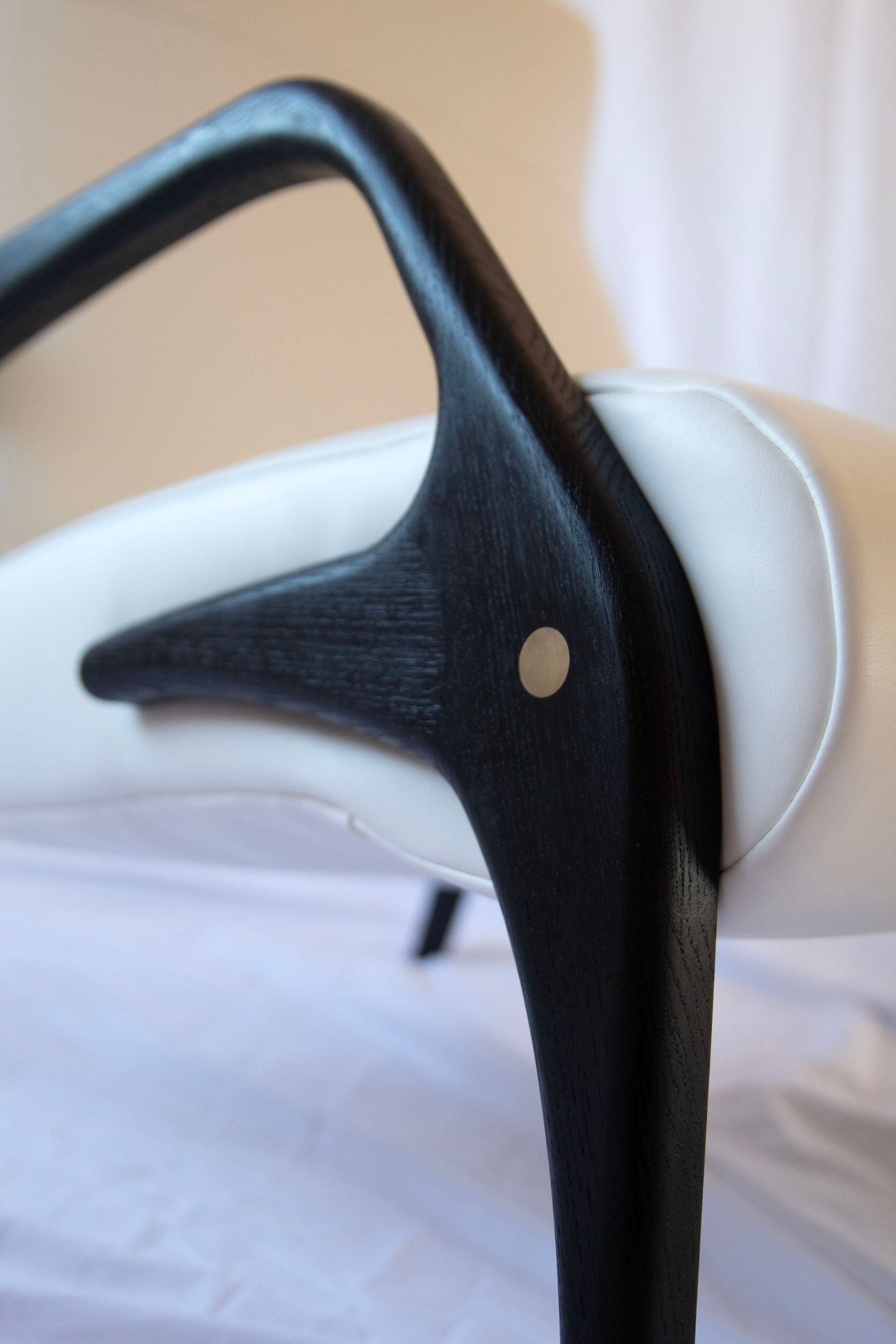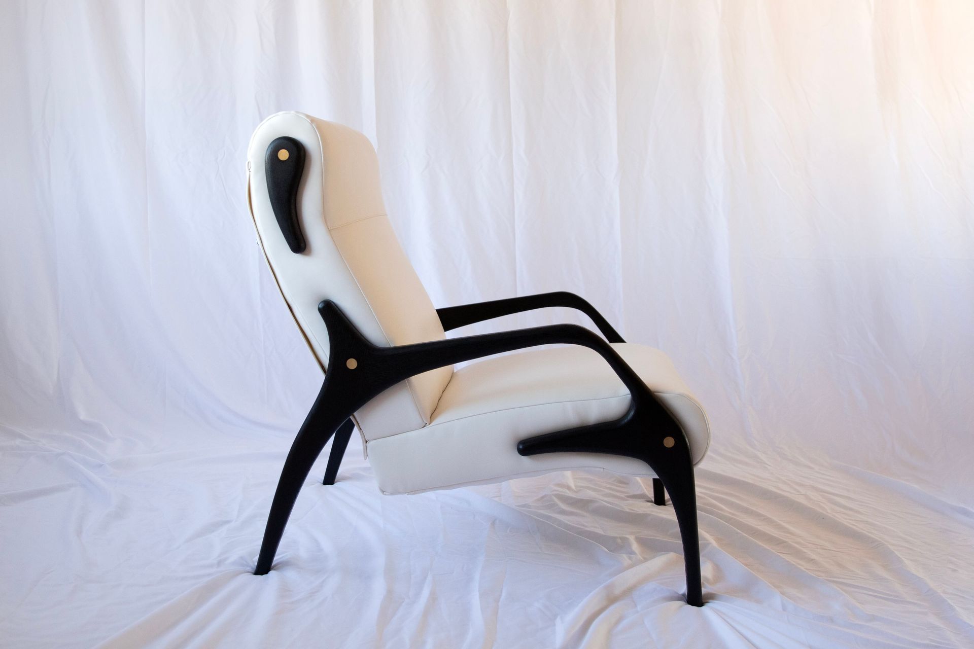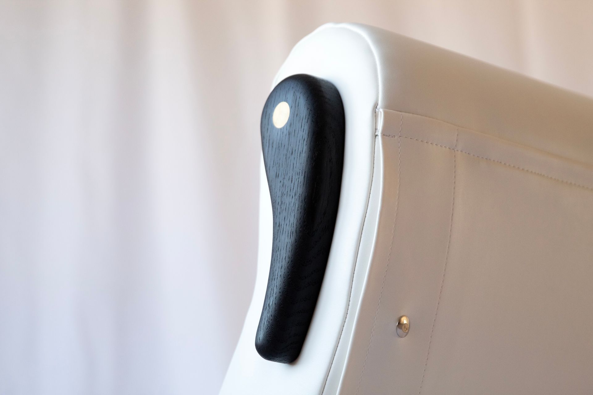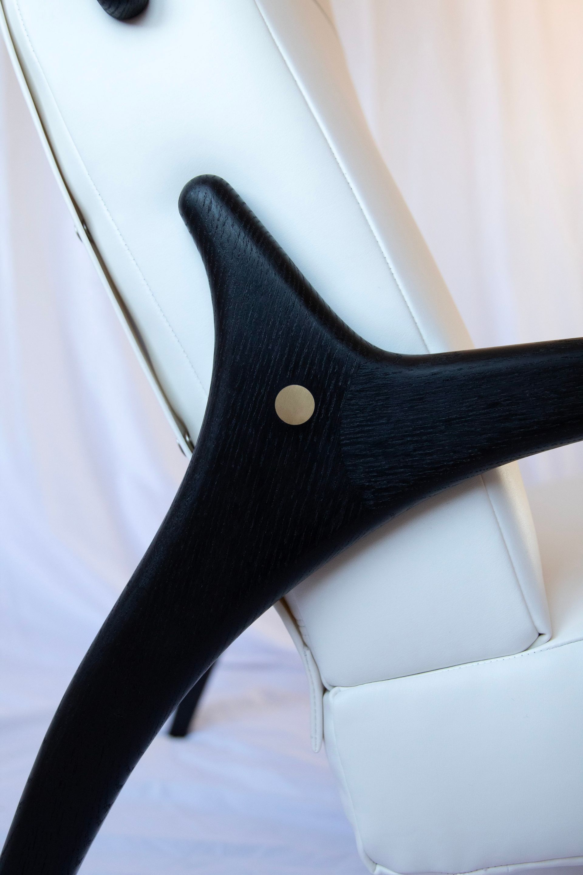the leg & arm parts and softened the profiles to better reflect my own style. This decision creates negative space and allows the silhouette of the upholstery to suspend within the hardwood frame. The brass inlays act as dainty suspension and connect the features in a playful and