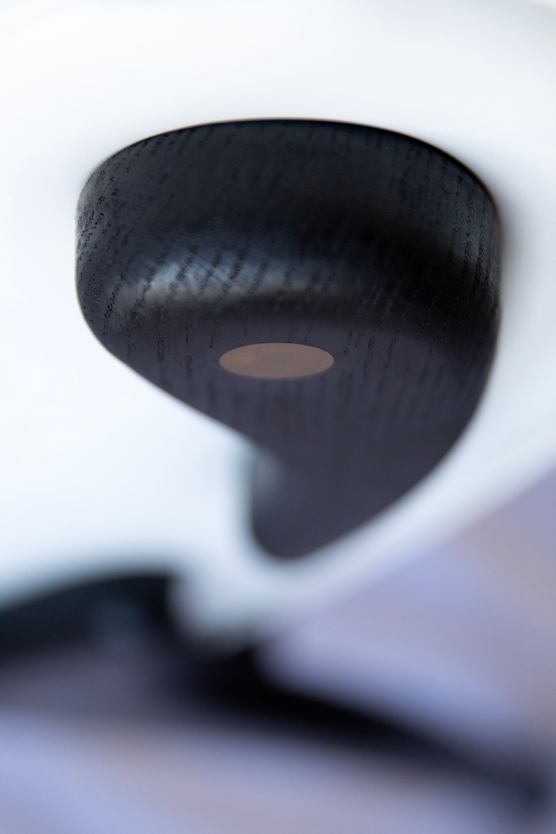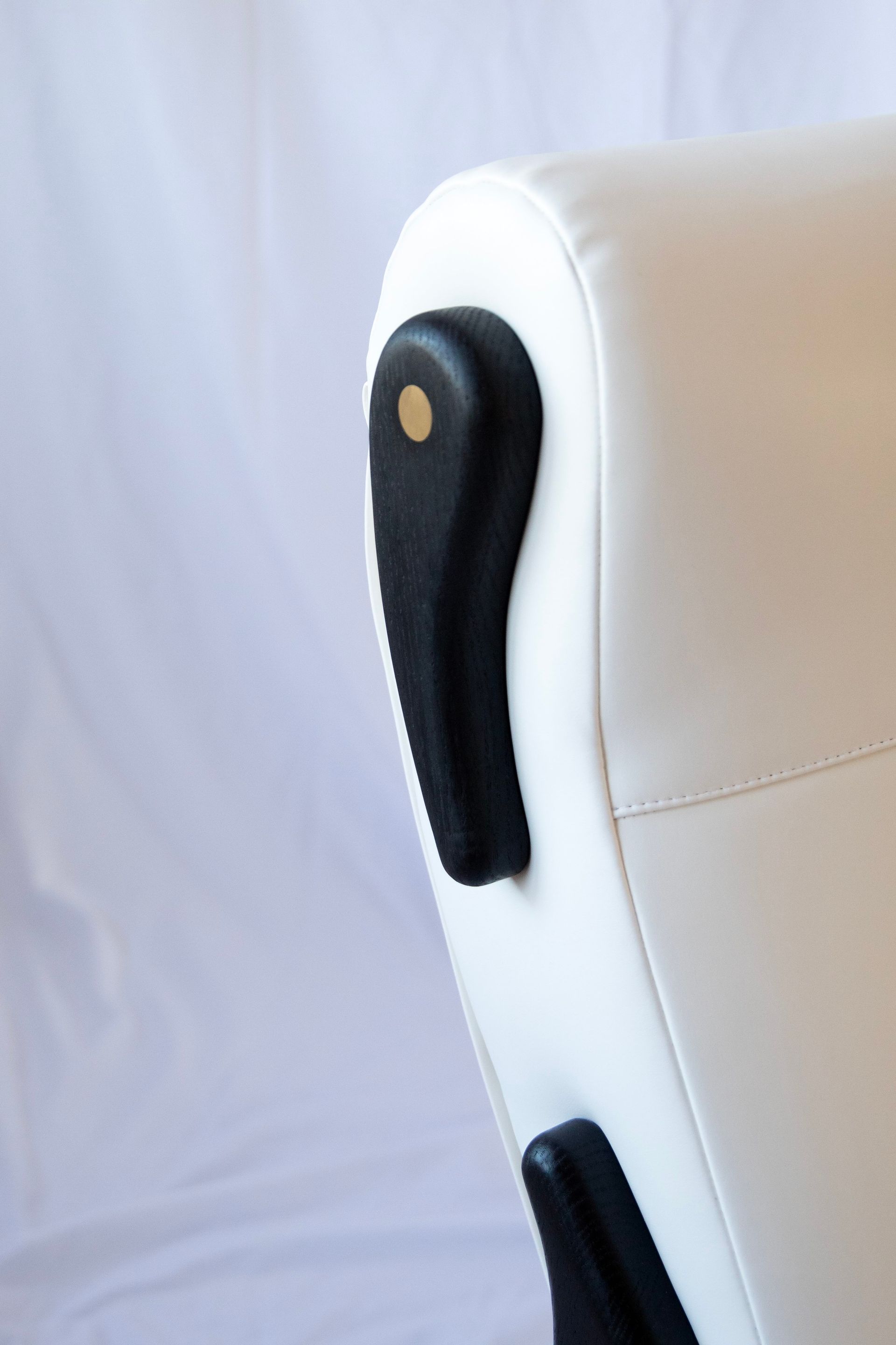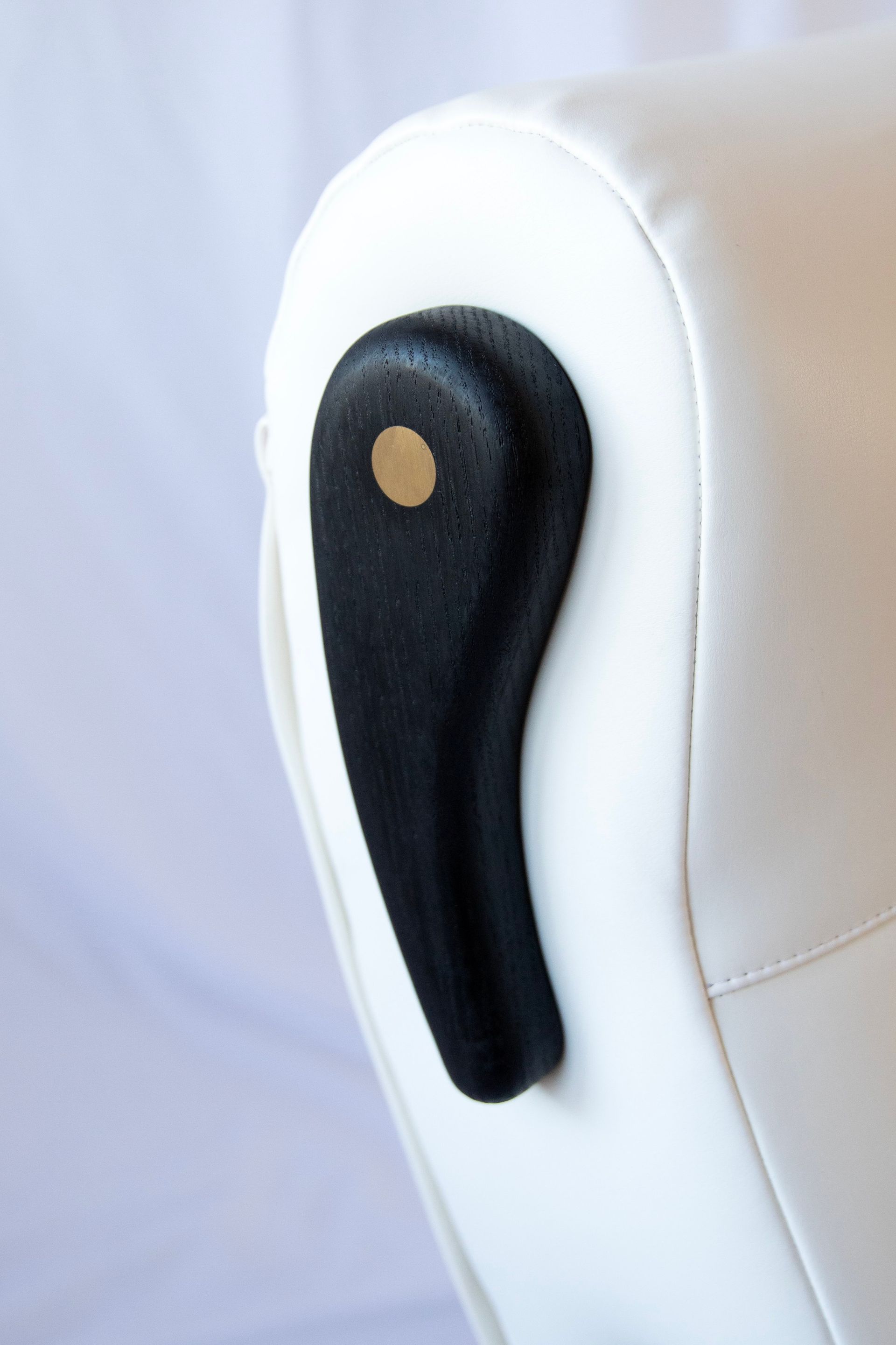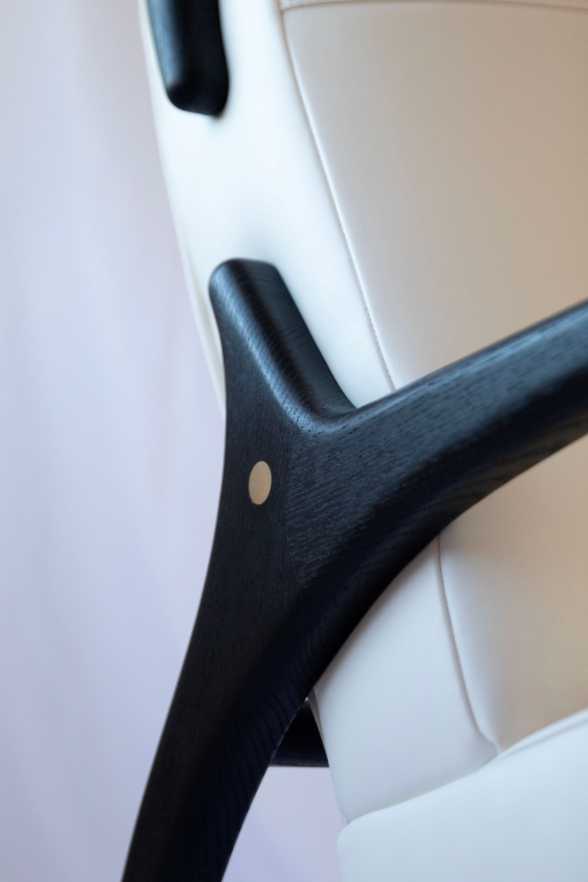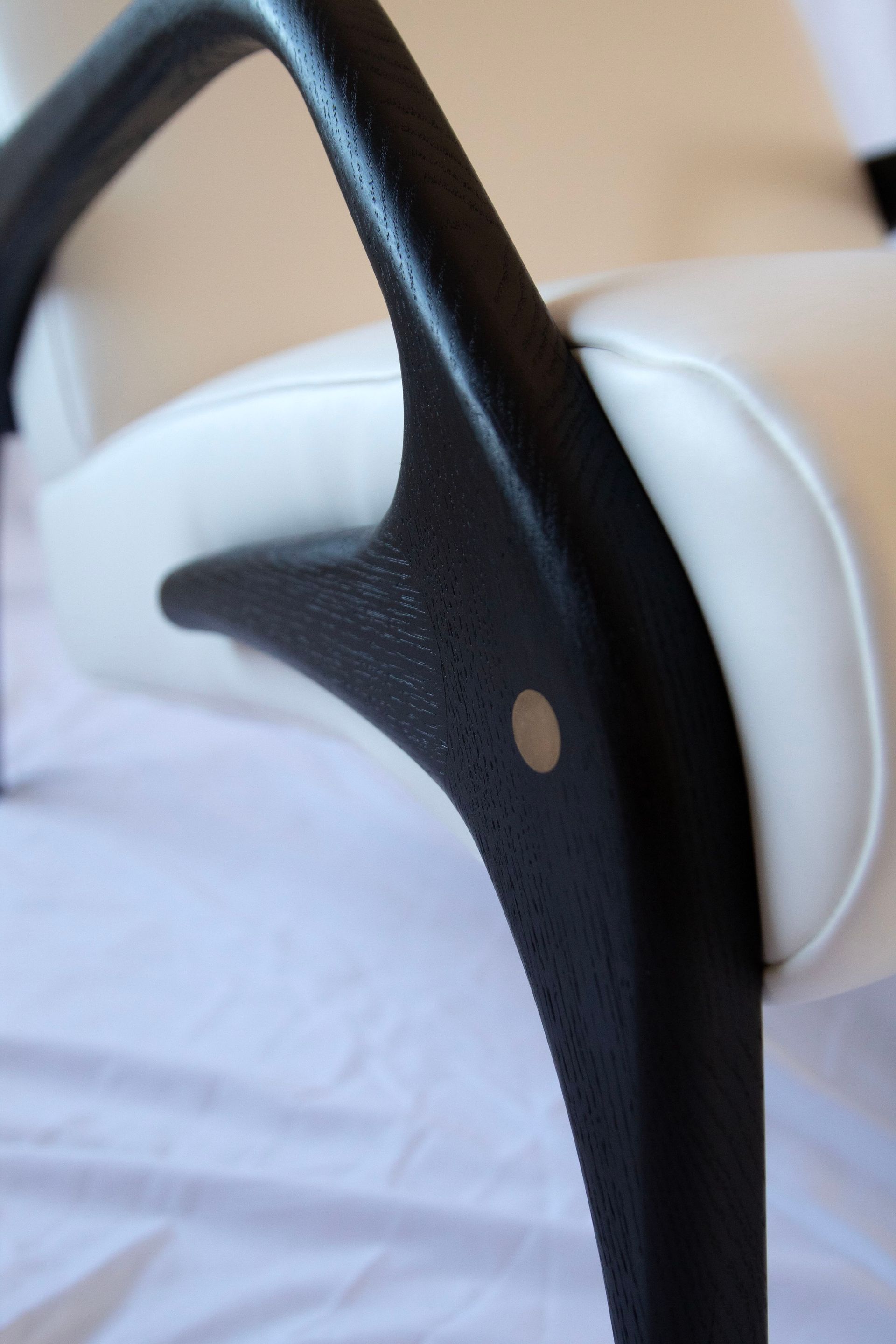 the leg & arm parts and softened the profiles to better reflect my own style. This decision creates negative space and allows the silhouette of the upholstery to suspend within the hardwood frame. The brass inlays act as dainty suspension and connect the features in a playful and