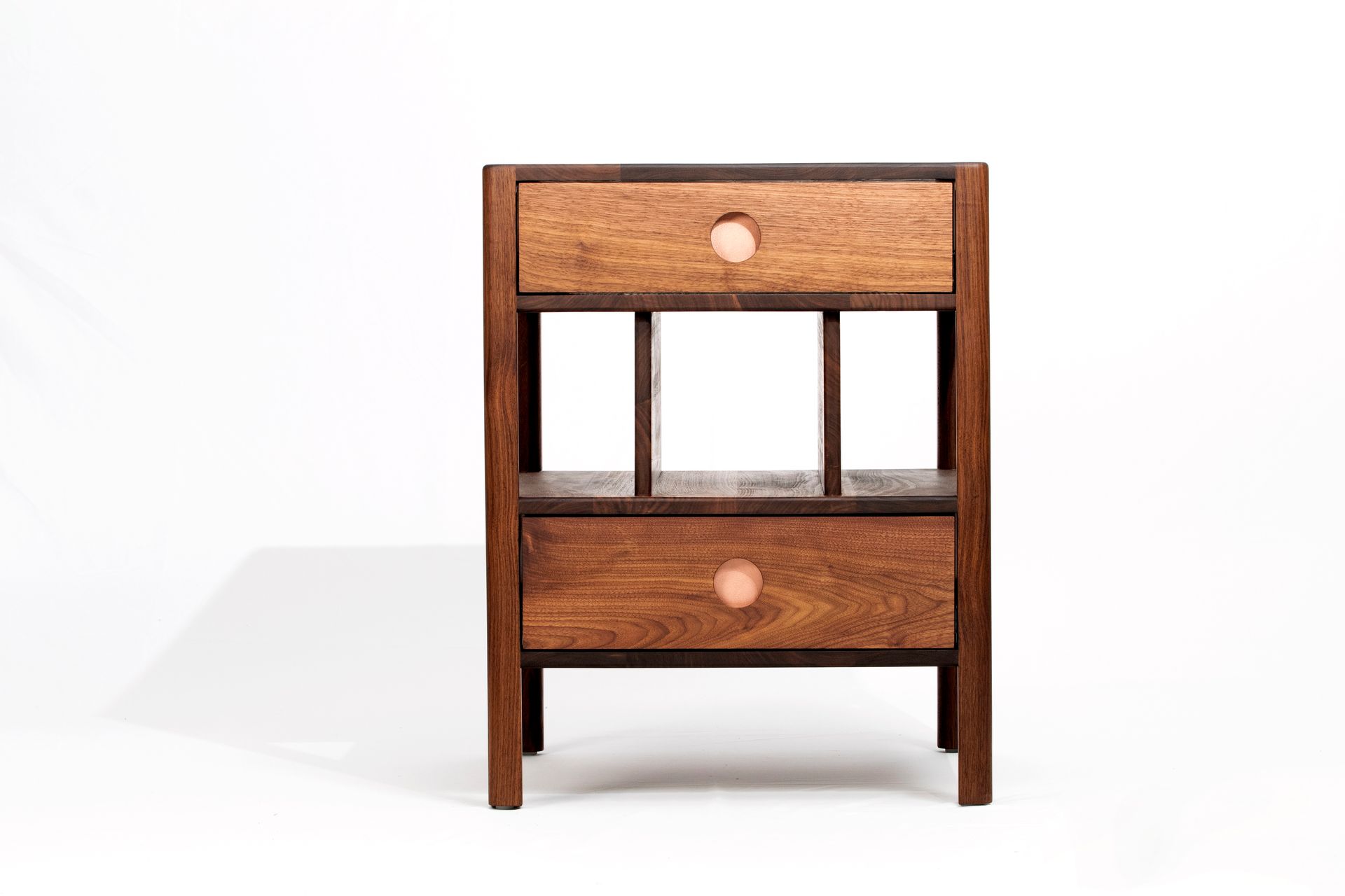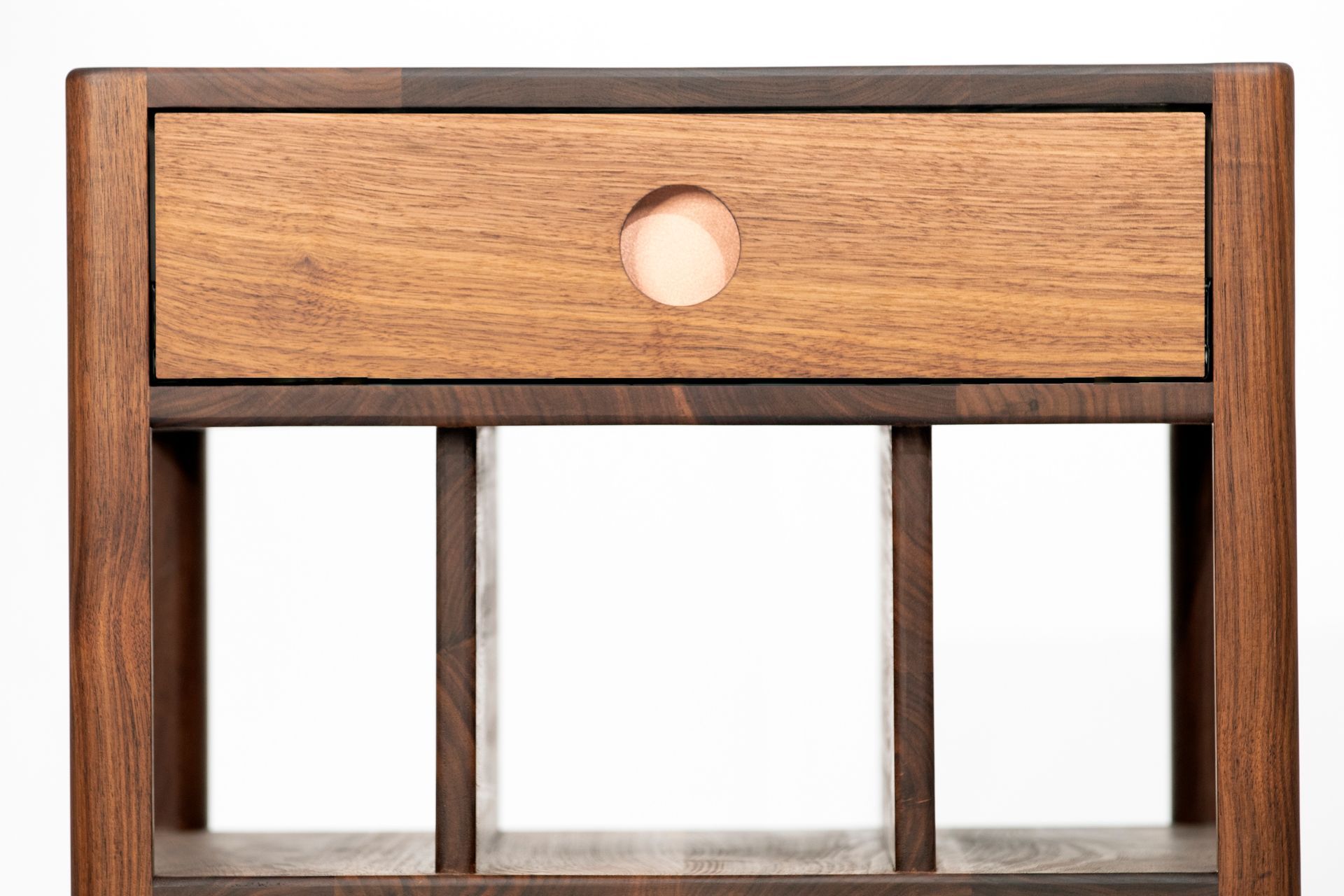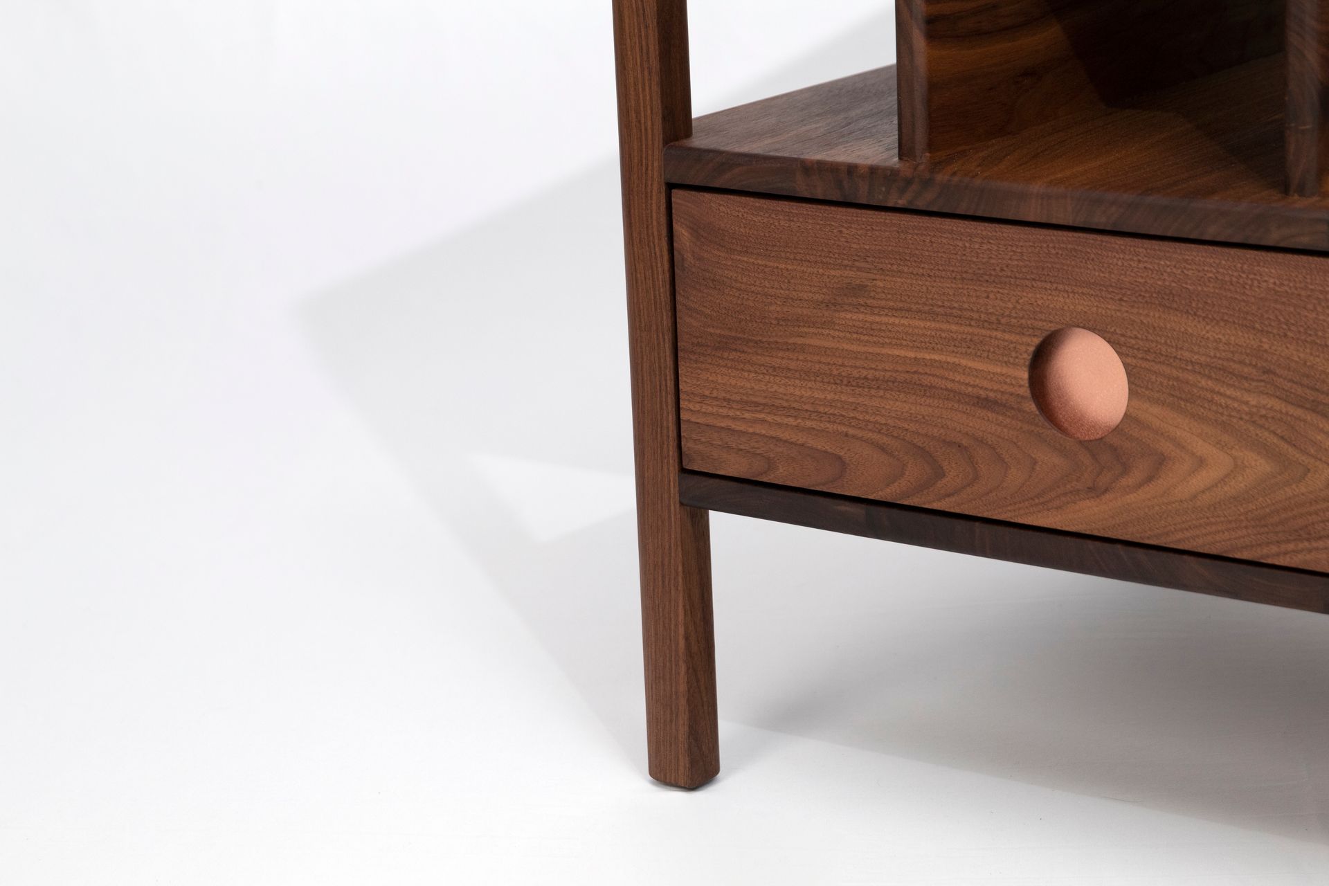 Every design decision is a reflection of purpose including the copper plate, which serves as a signifier for the drawer pull and compliments the warm tones of the black walnut.