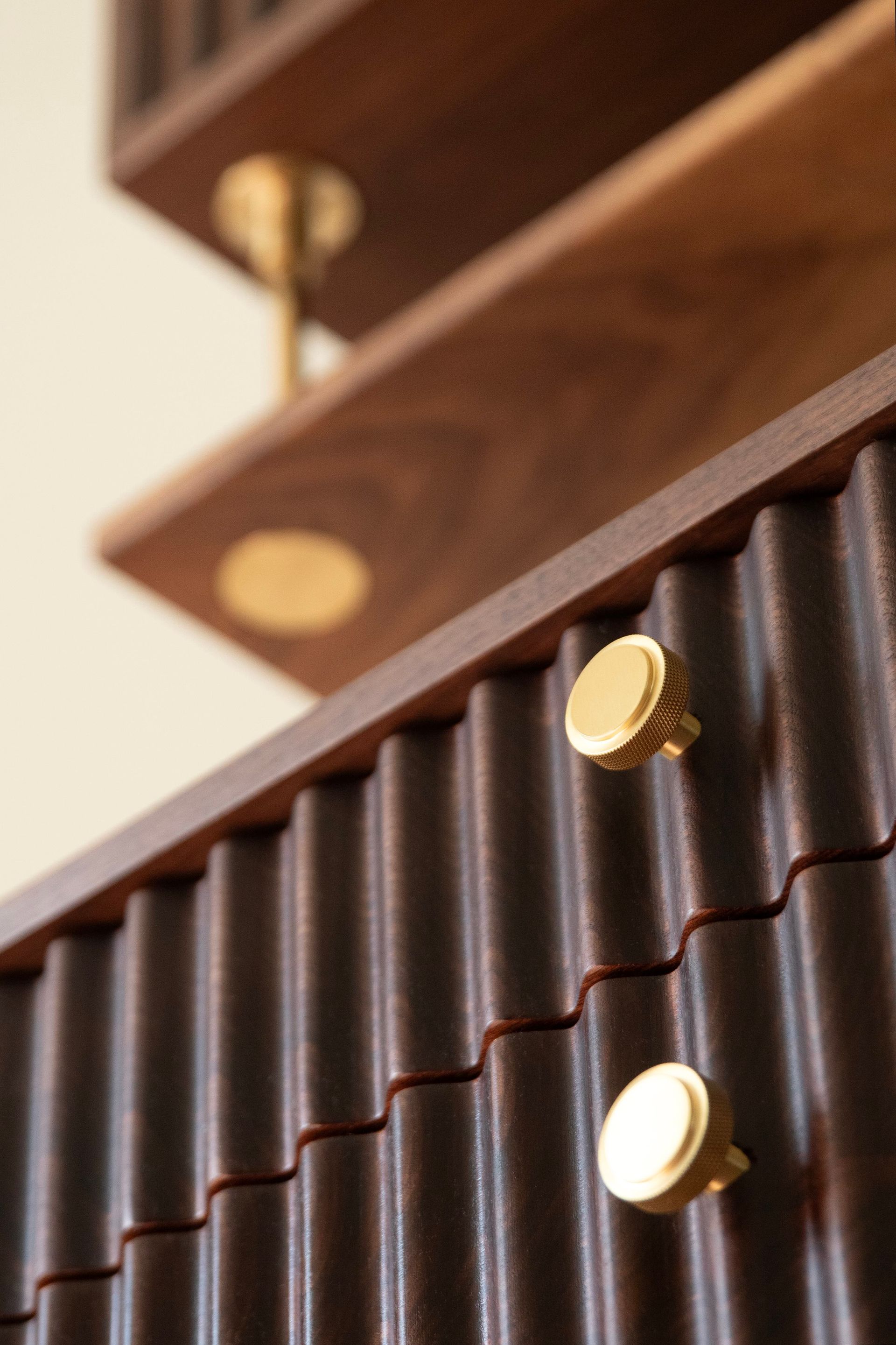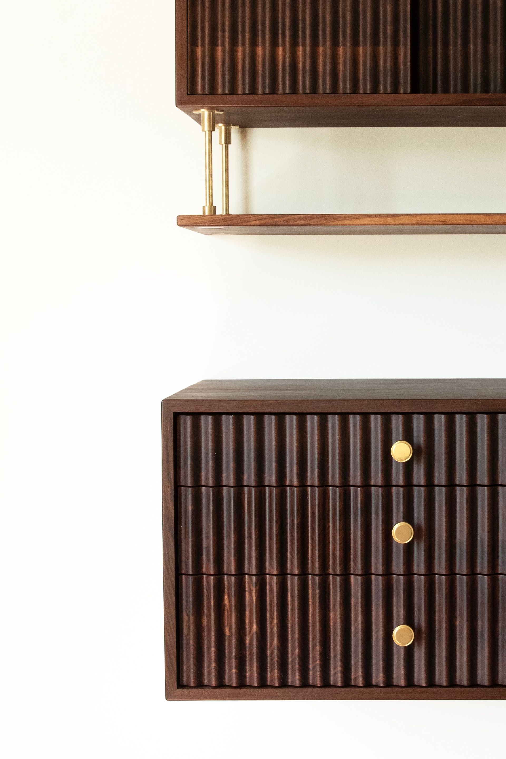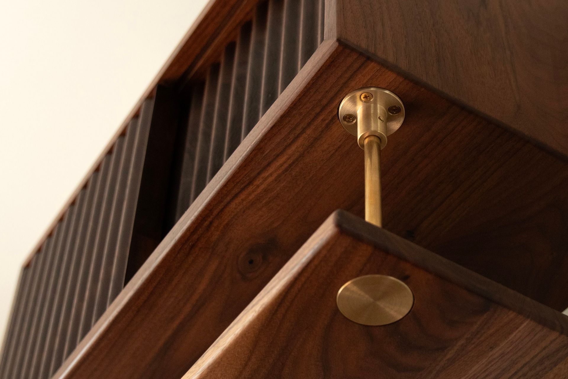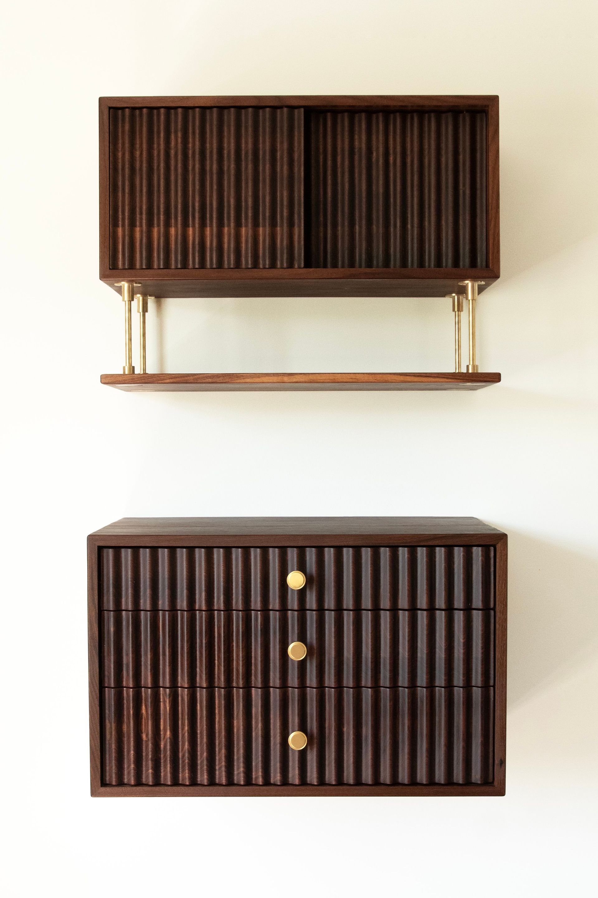 Inspired by the Cado modular wall system originally designed by Poul Cadovius, these cabinets integrate my signature Ruffle pattern across the front facing surfaces. The walnut hardwood is paired with brass hardware, using knurled round knobs and a café-style systems to suspend the shelf. I also used soft close drawers for the ebonized drawer boxes and bearing wheel hardware for the sliding doors. Unlike the original designers rail system, these cabinets mount to the wall using a french cleat system.