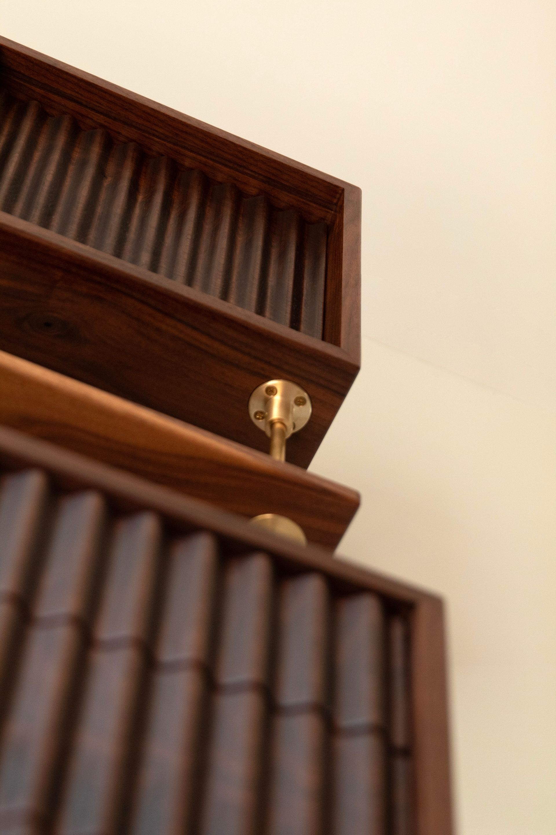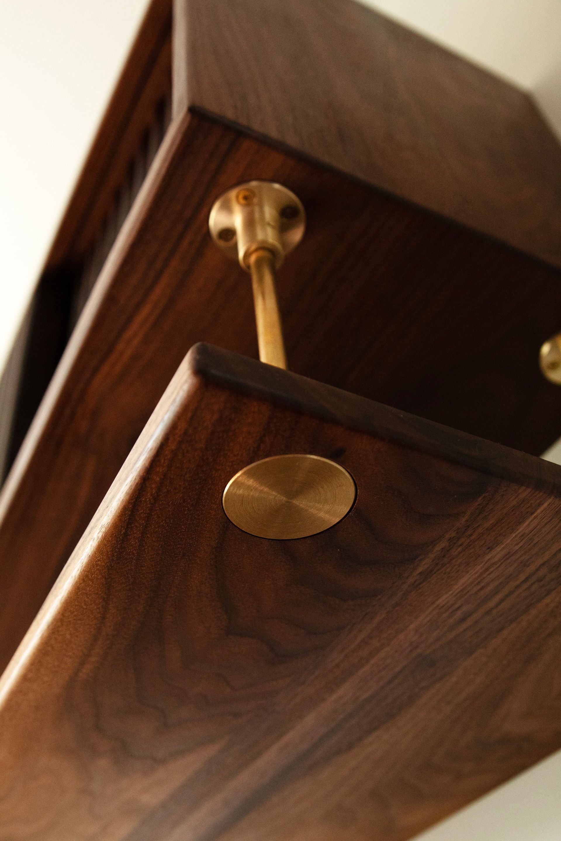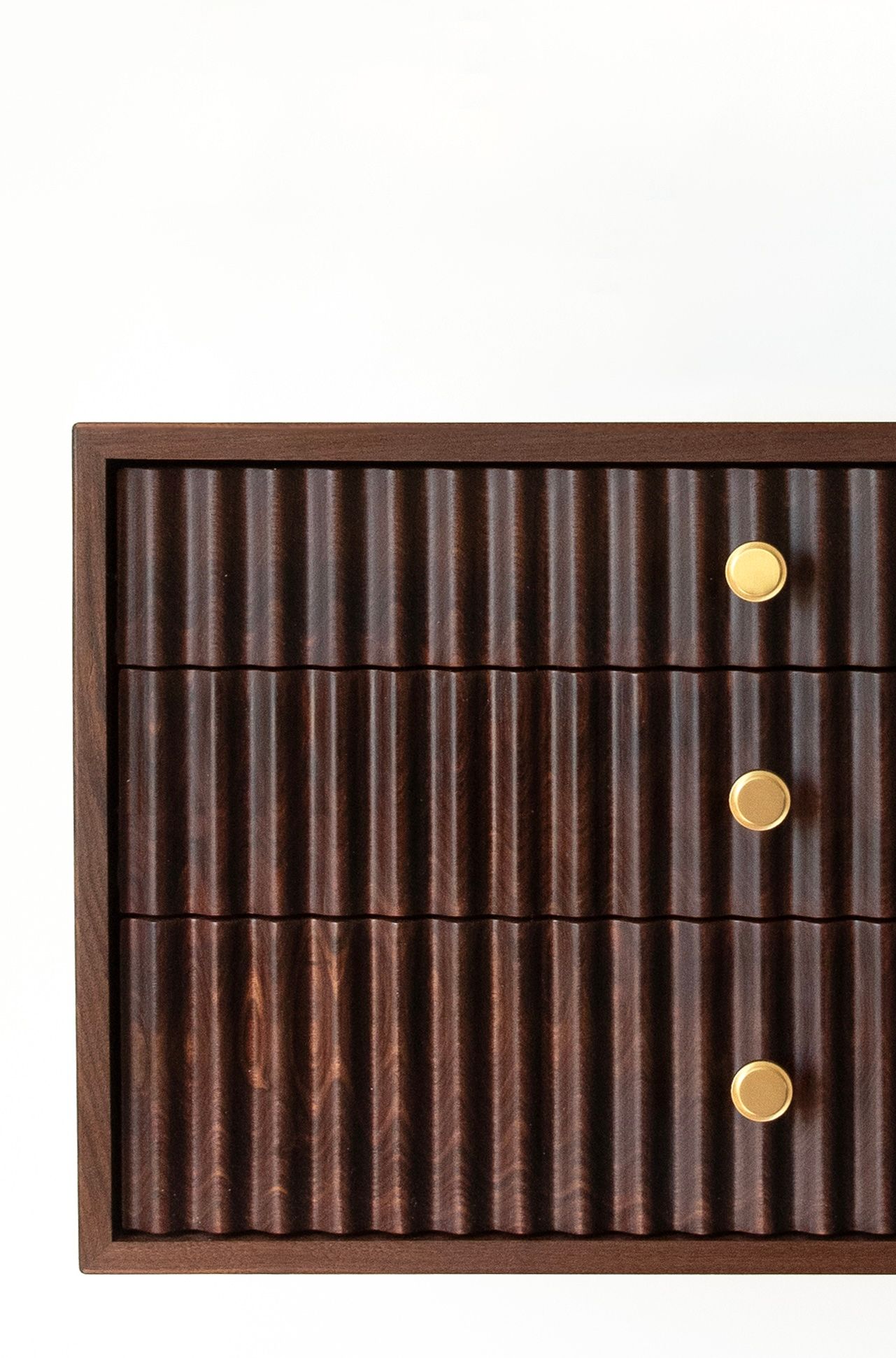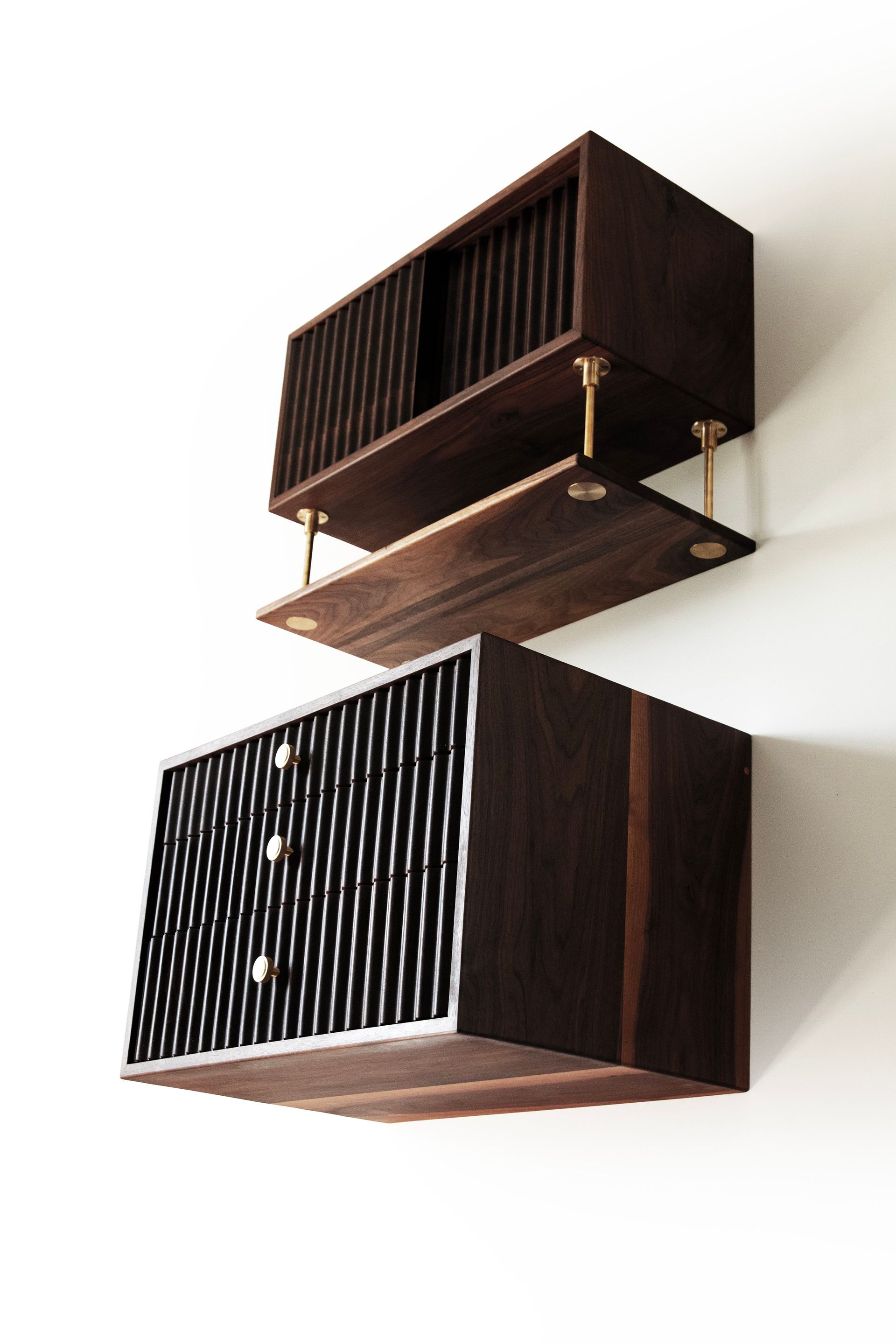 Inspired by the Cado modular wall system originally designed by Poul Cadovius, these cabinets integrate my signature Ruffle pattern across the front facing surfaces. The walnut hardwood is paired with brass hardware, using knurled round knobs and a café-style systems to suspend the shelf. I also used soft close drawers for the ebonized drawer boxes and bearing wheel hardware for the sliding doors. Unlike the original designers rail system, these cabinets mount to the wall using a french cleat system.