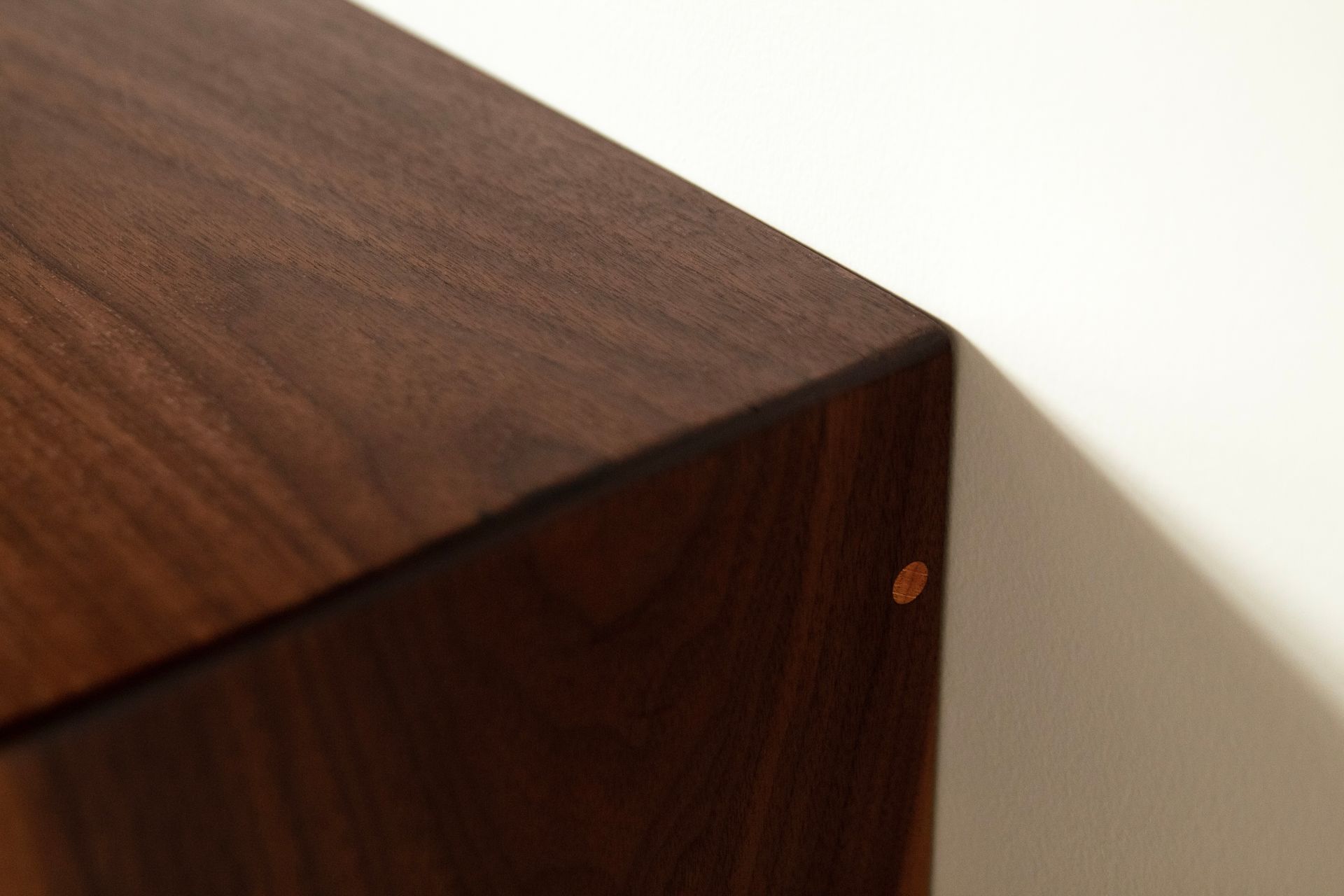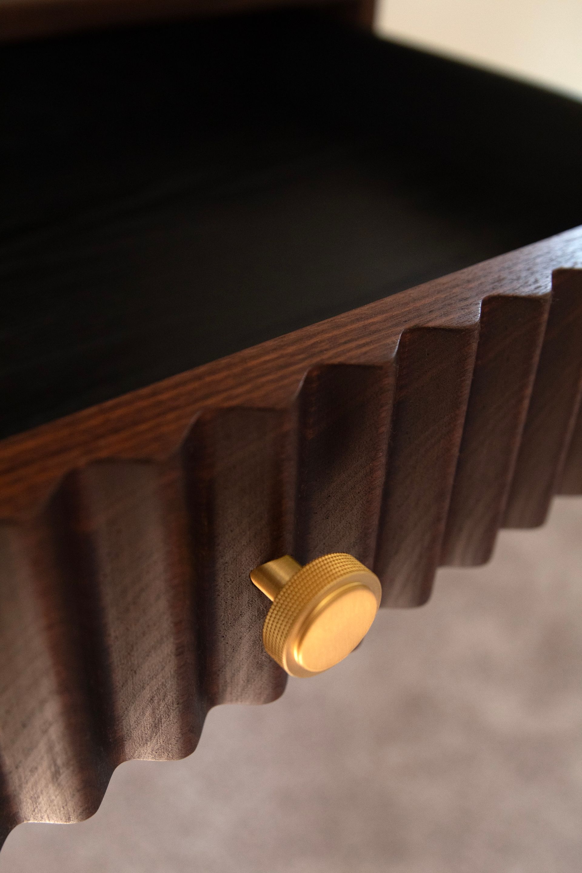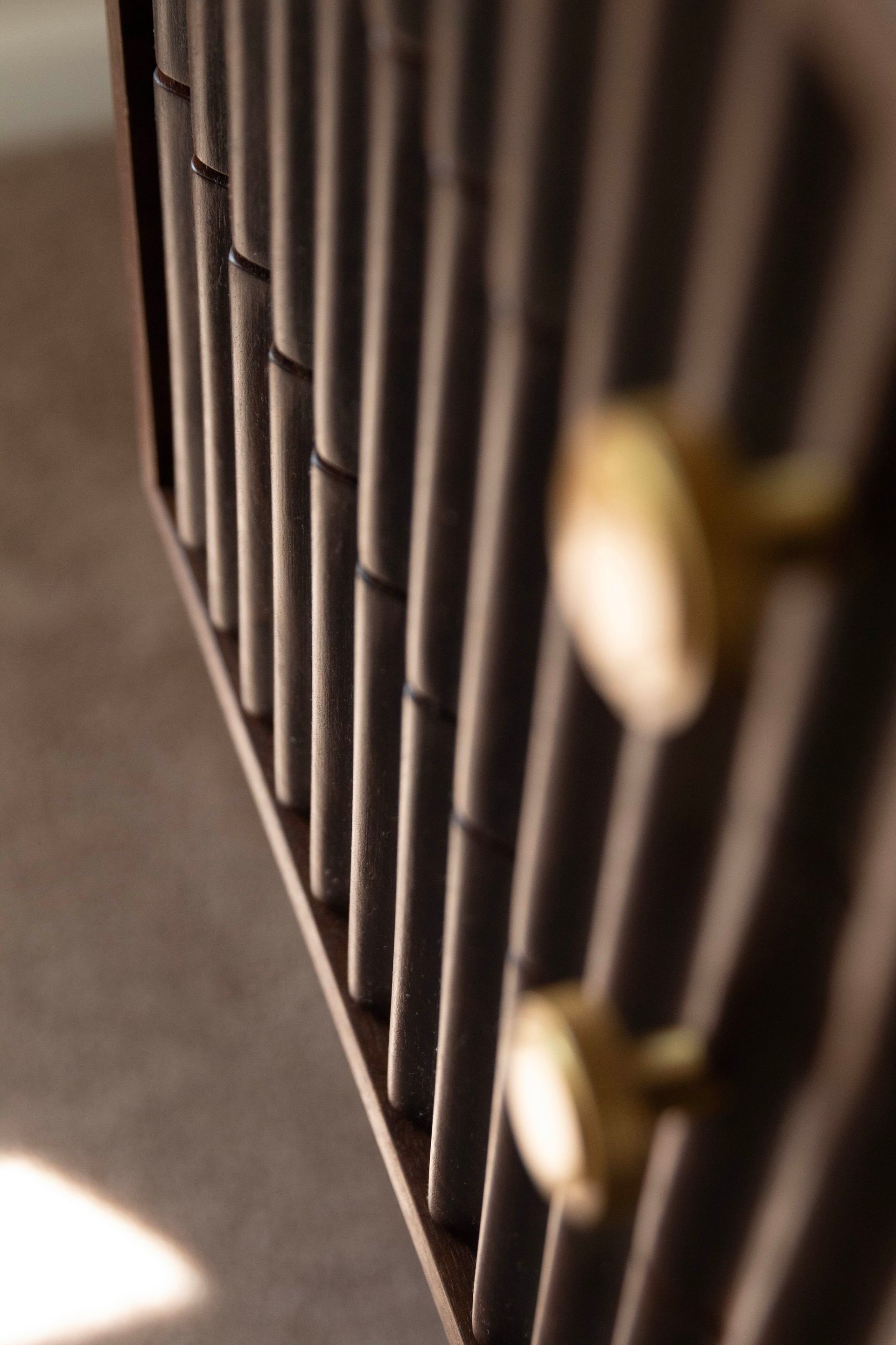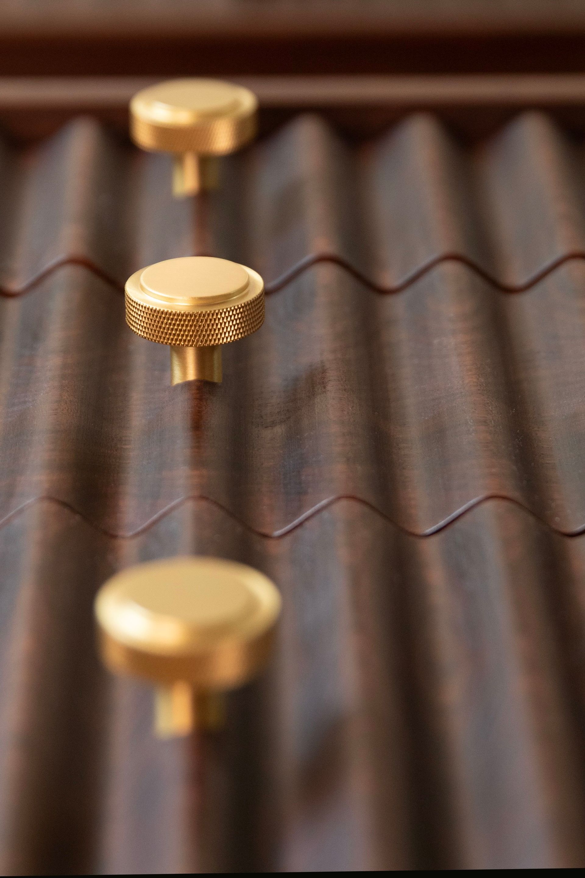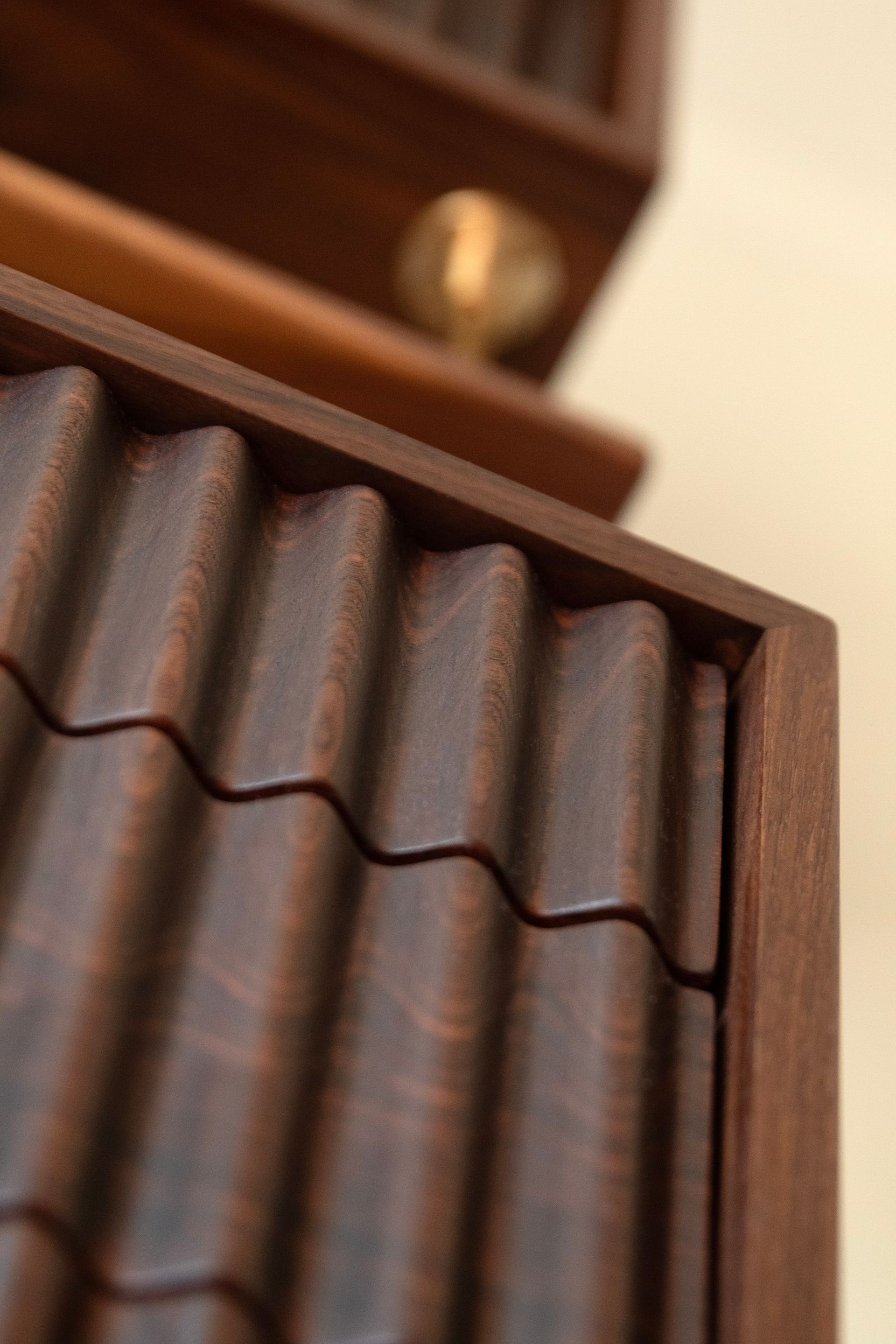 Inspired by the Cado modular wall system originally designed by Poul Cadovius, these cabinets integrate my signature Ruffle pattern across the front facing surfaces. The walnut hardwood is paired with brass hardware, using knurled round knobs and a café-style systems to suspend the shelf. I also used soft close drawers for the ebonized drawer boxes and bearing wheel hardware for the sliding doors. Unlike the original designers rail system, these cabinets mount to the wall using a french cleat system.