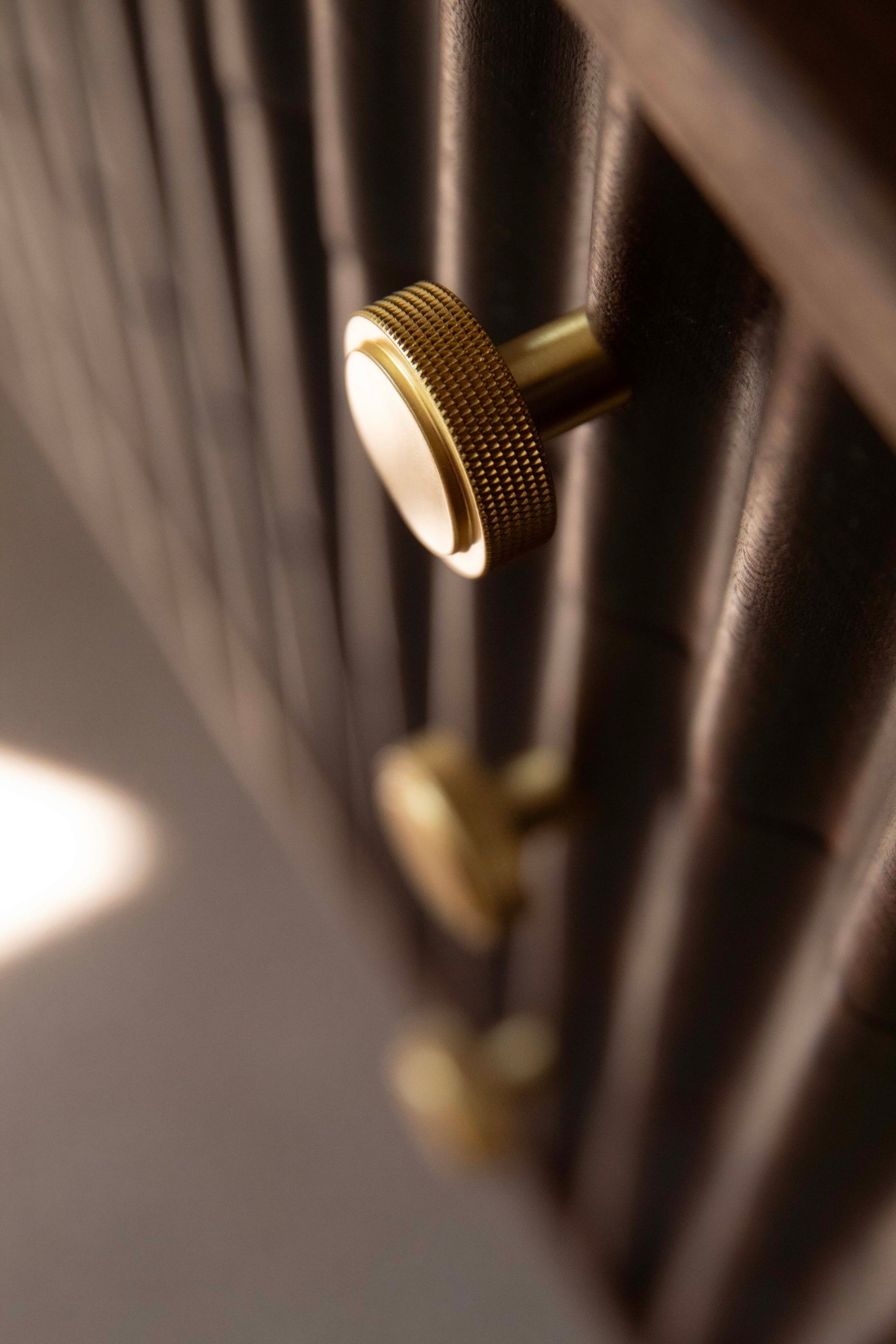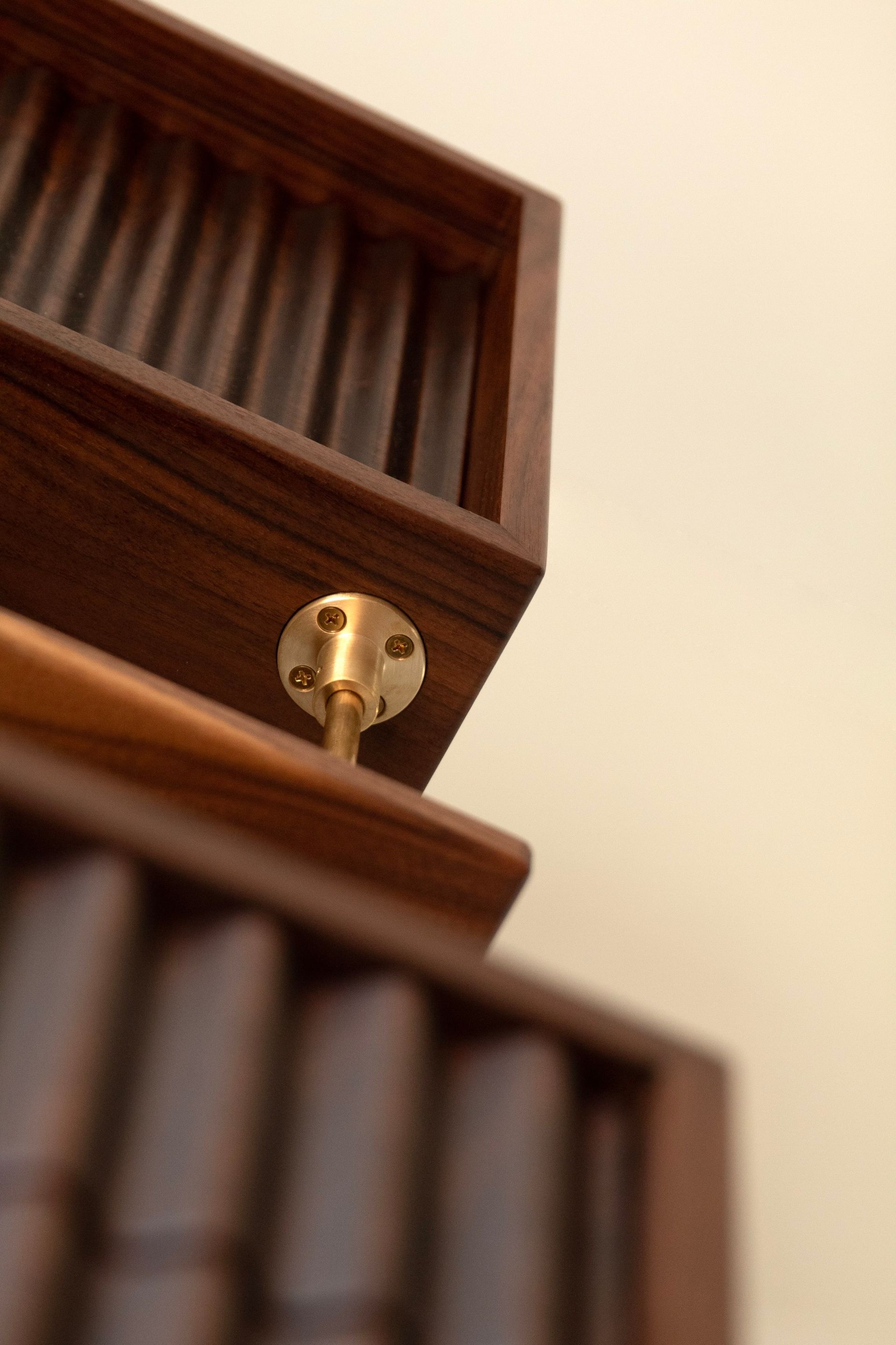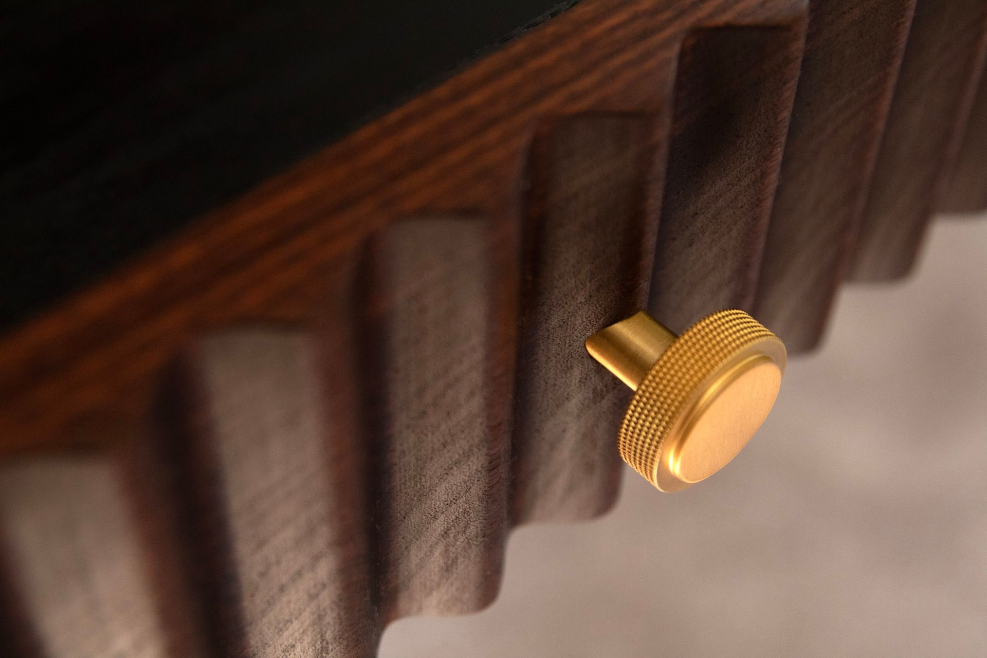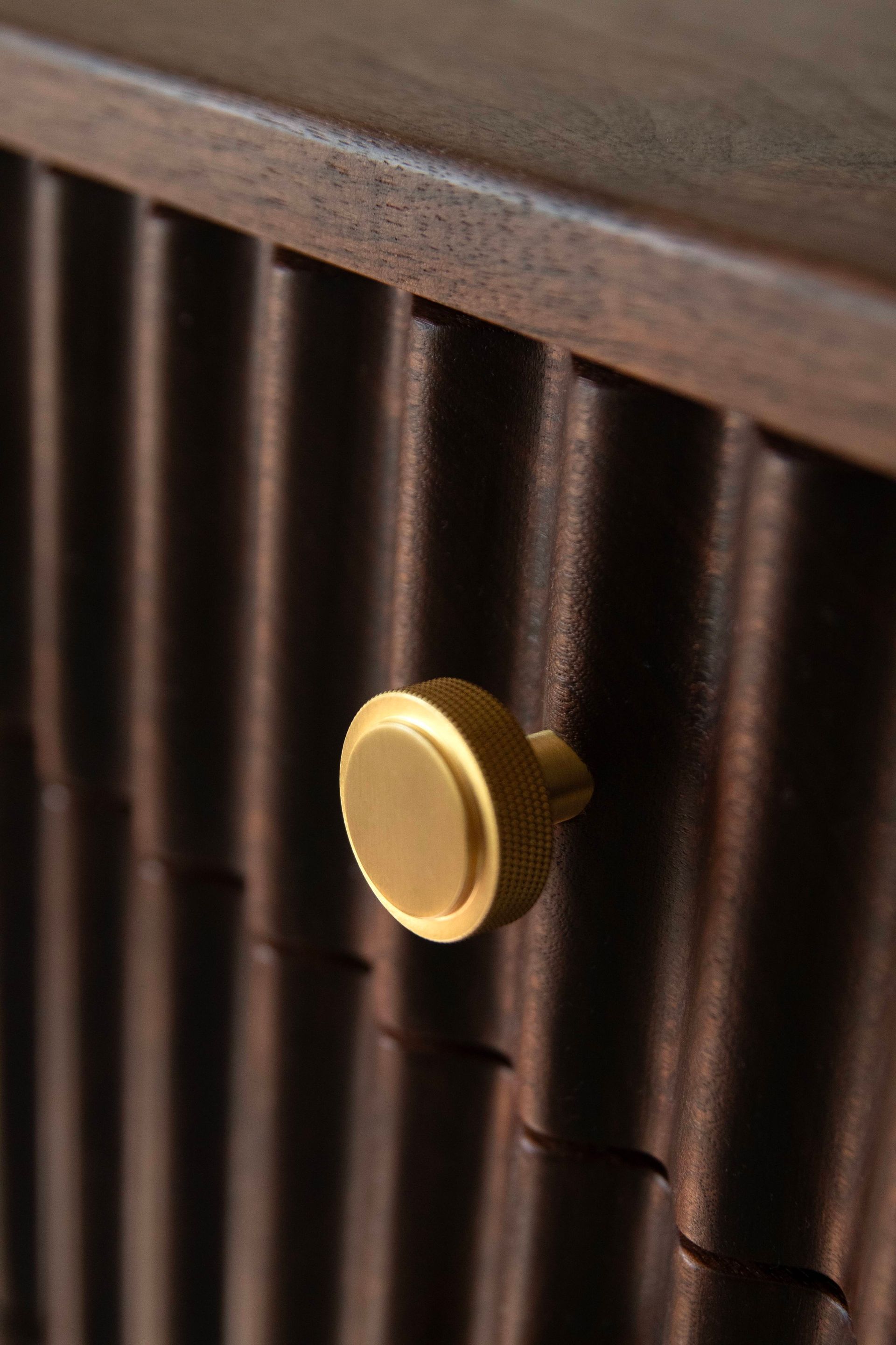 Inspired by the Cado modular wall system originally designed by Poul Cadovius, these cabinets integrate my signature Ruffle pattern across the front facing surfaces. The walnut hardwood is paired with brass hardware, using knurled round knobs and a café-style systems to suspend the shelf. I also used soft close drawers for the ebonized drawer boxes and bearing wheel hardware for the sliding doors. Unlike the original designers rail system, these cabinets mount to the wall using a french cleat system.