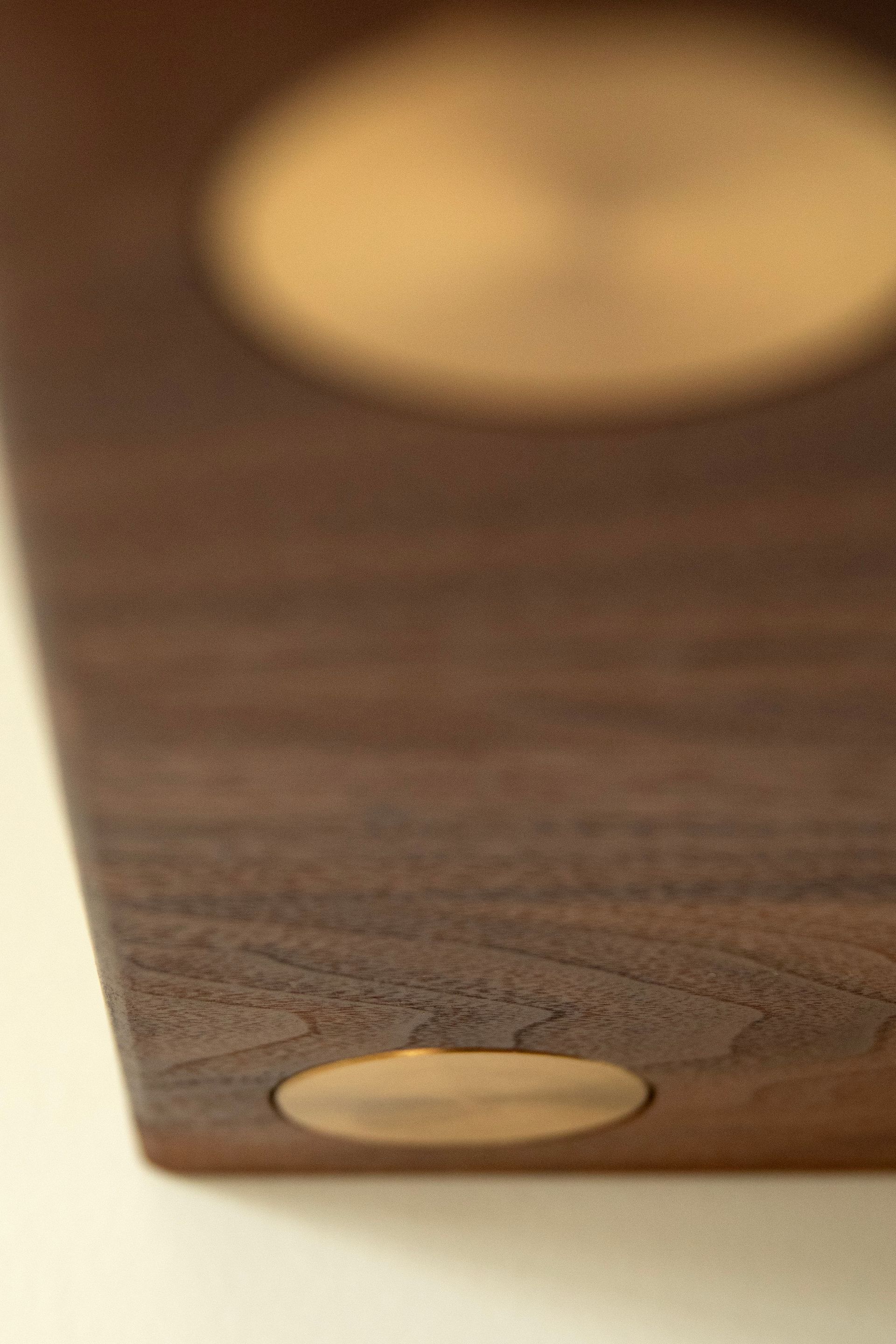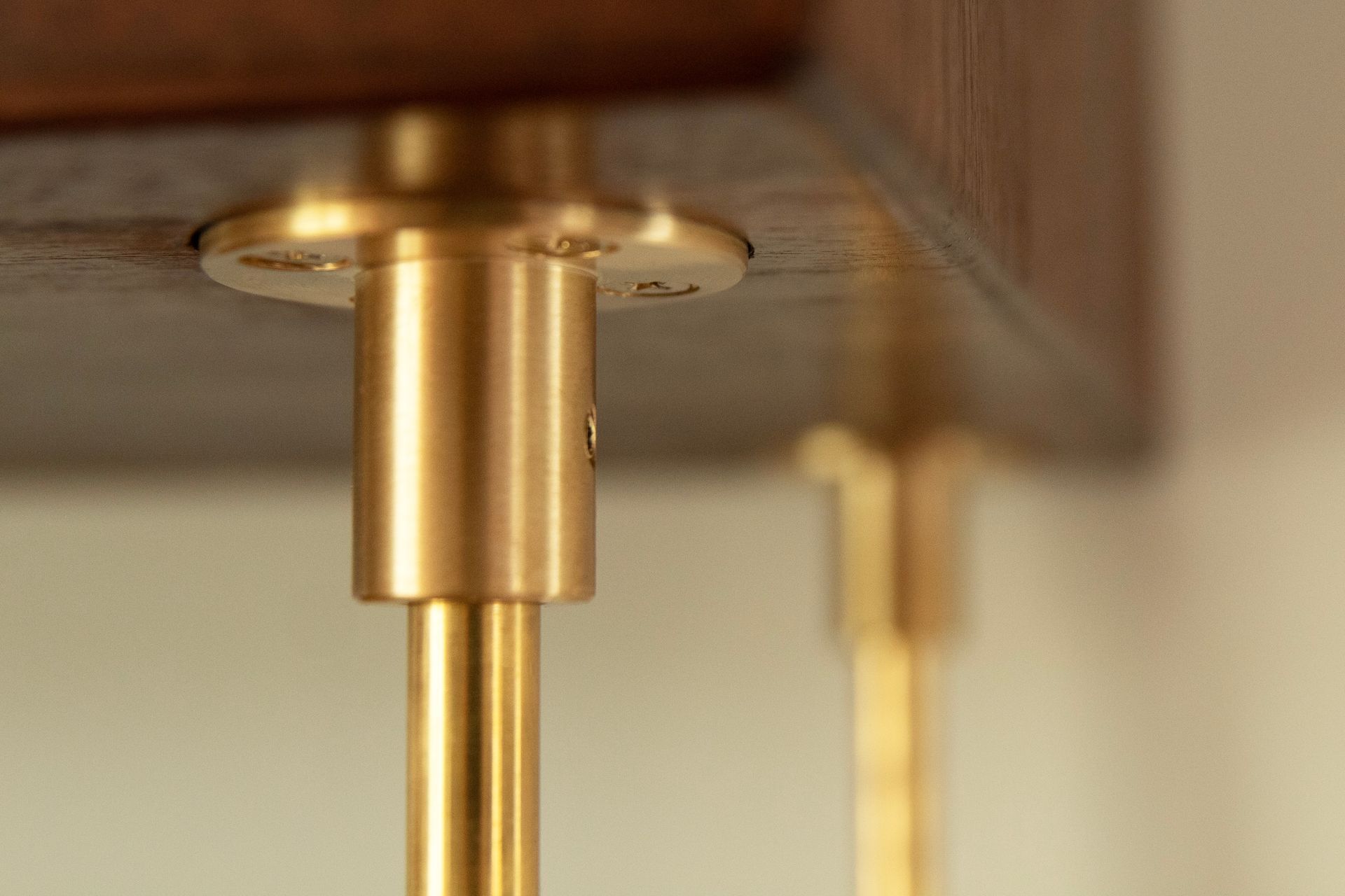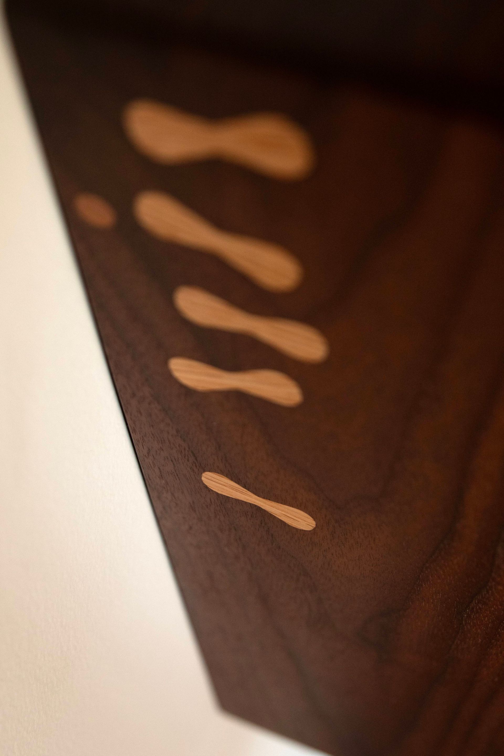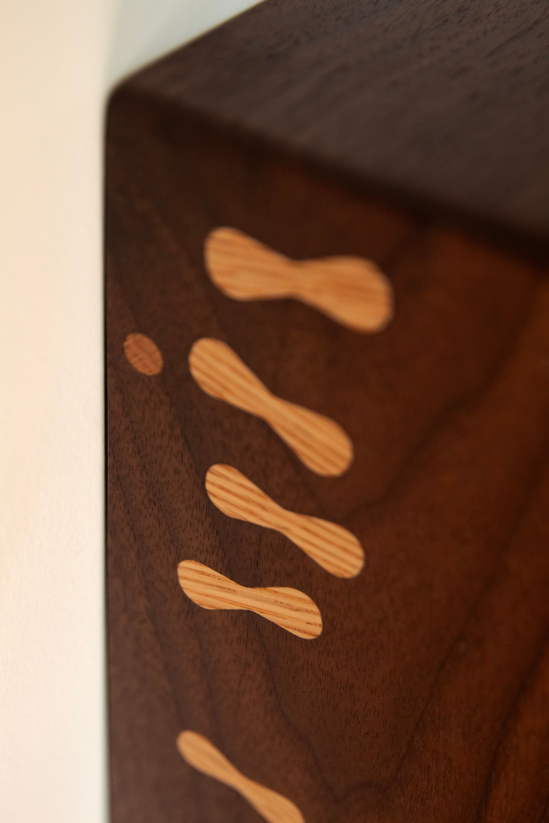 Inspired by the Cado modular wall system originally designed by Poul Cadovius, these cabinets integrate my signature Ruffle pattern across the front facing surfaces. The walnut hardwood is paired with brass hardware, using knurled round knobs and a café-style systems to suspend the shelf. I also used soft close drawers for the ebonized drawer boxes and bearing wheel hardware for the sliding doors. Unlike the original designers rail system, these cabinets mount to the wall using a french cleat system.