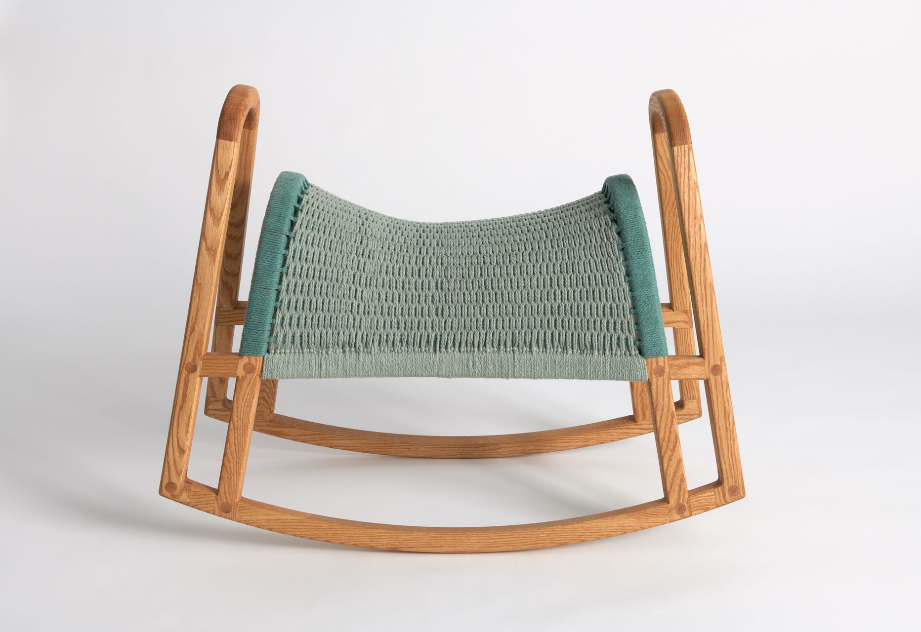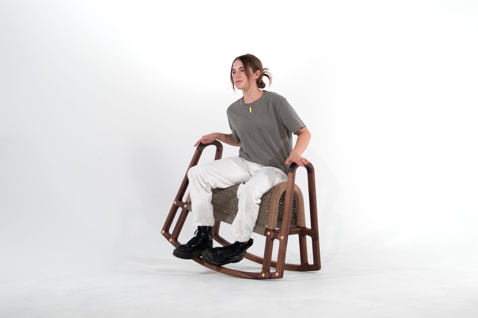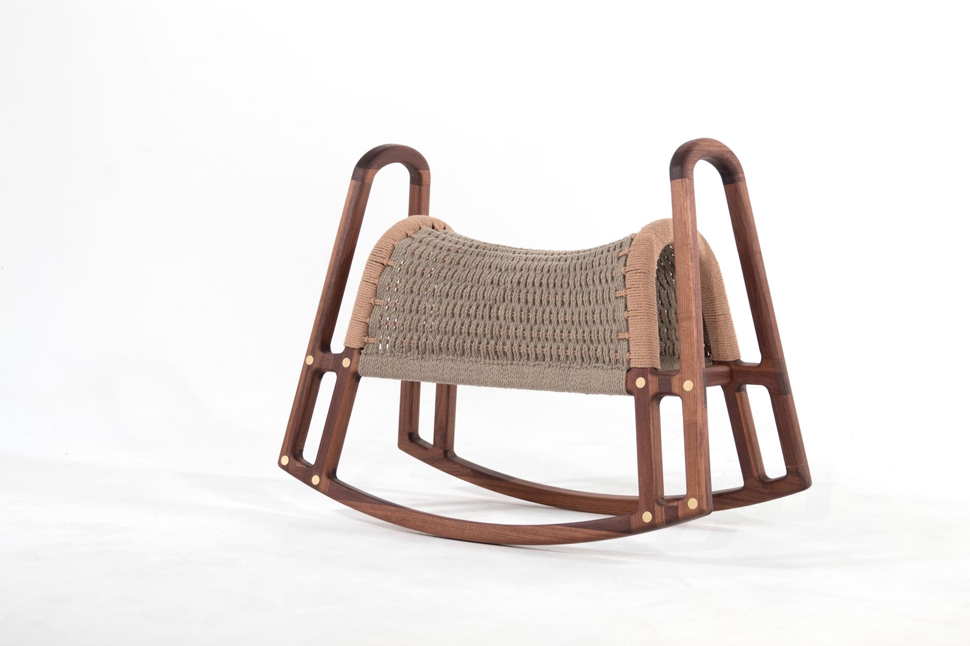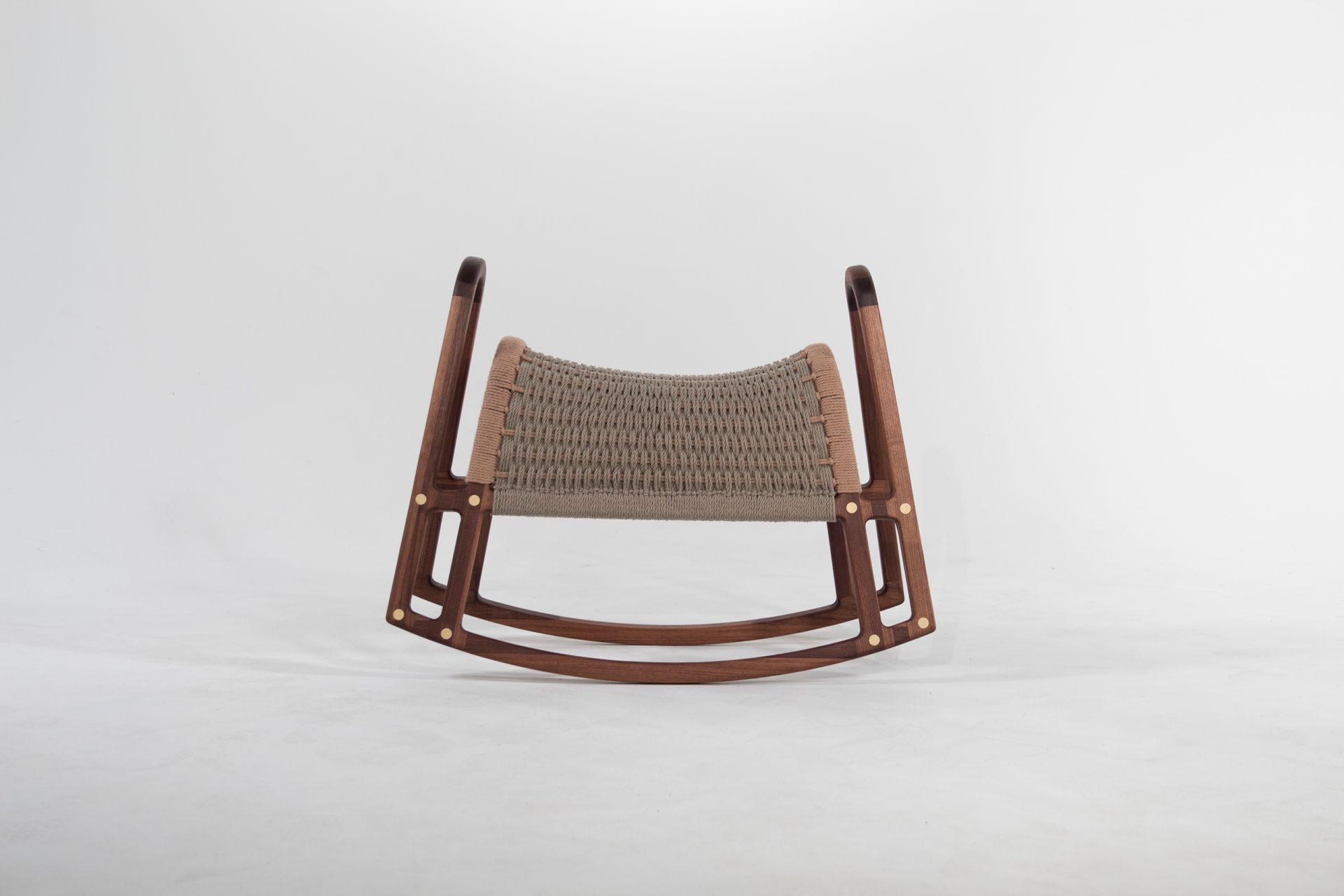 Cotton cording is woven into a saddle which provides a form-fitting comfort as the user rocks or sways. The hardwood black walnut is complimented by brass dowels which guide the eyes around the intersecting joints. Each curve was meticulously planned for body-contour and aesthetic. The material and form are chosen for complementing an interior rather than distracting from.
