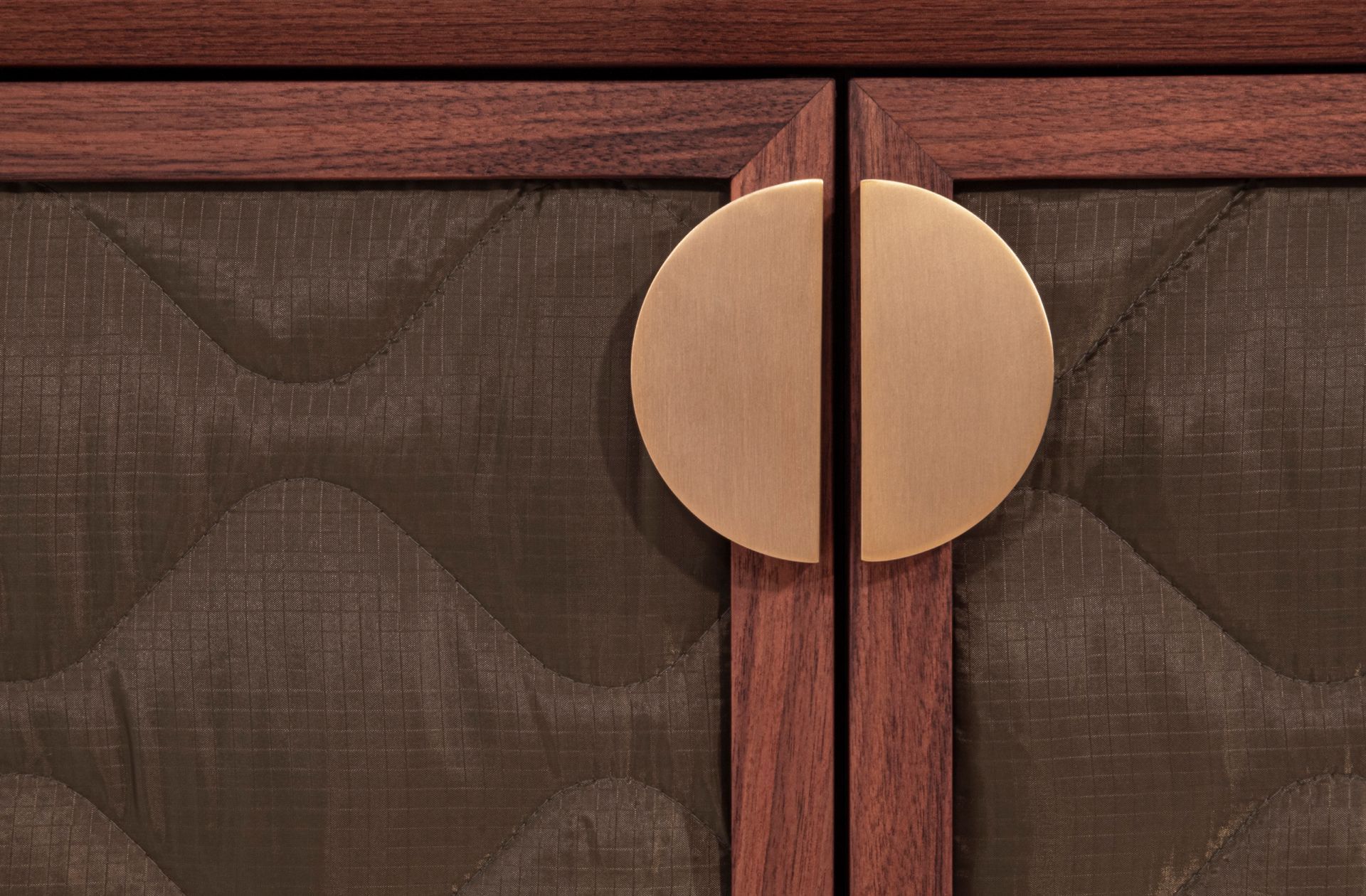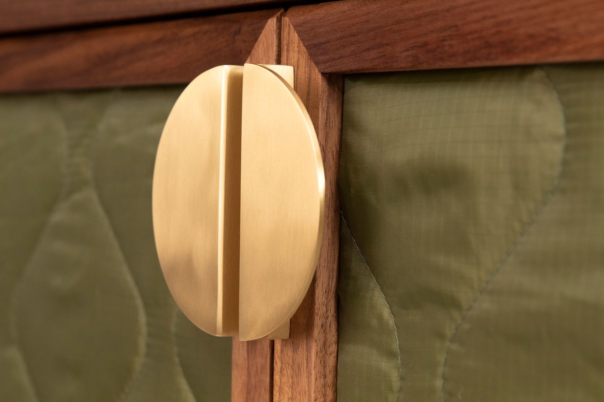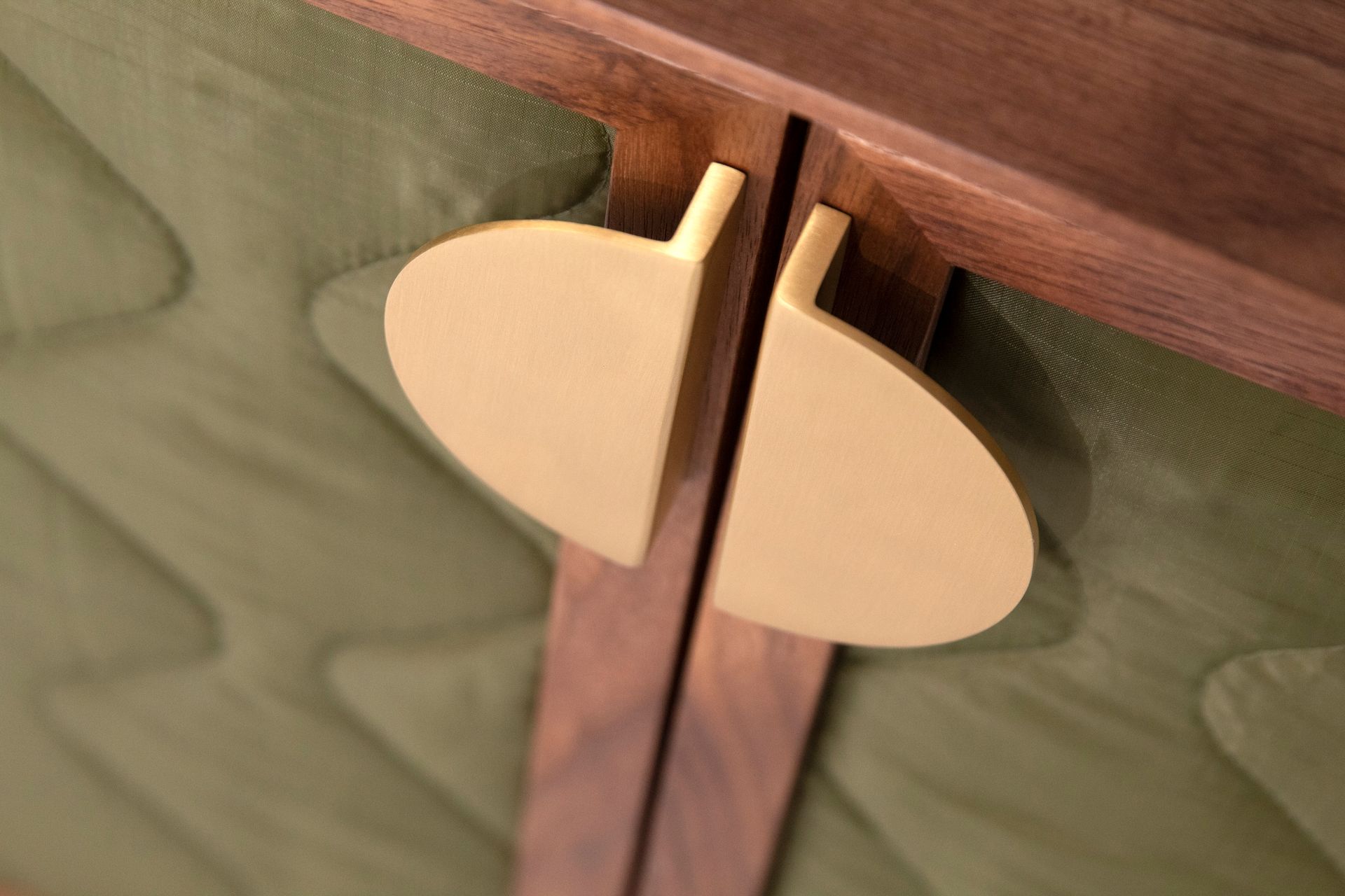 When designing this sideboard credenza, I wanted to reflect on my time in the armed forces. “Woobie” is a military jargon term given to the U.S. issued poncho liner and named for the comfort it provides, similar to that of a child’s security blanket. They are primarily used in field operations and are a staple to every soldiers deployment and training kits. With that, the iconic quilted green fabric would become the primary feature of this piece by filling the cabinet’s door frames with the iconic reflective ripstop.