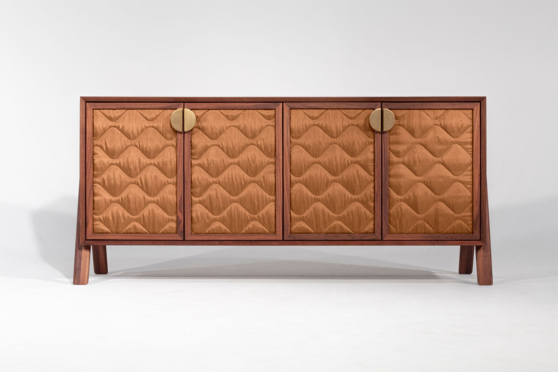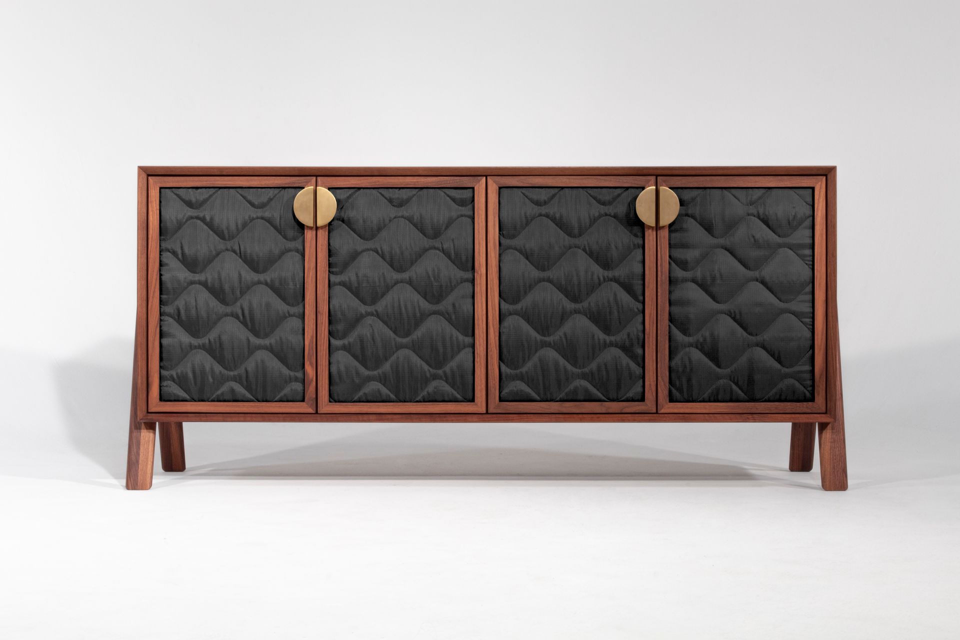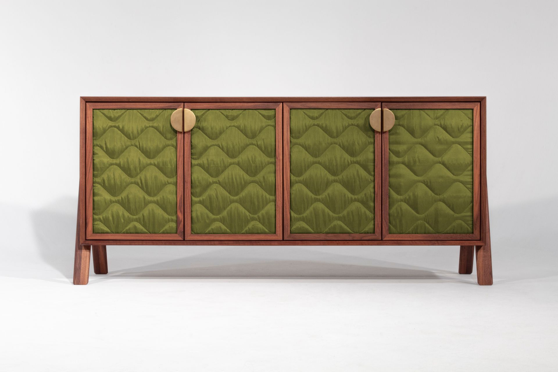 When designing this sideboard credenza, I wanted to reflect on my time in the armed forces. “Woobie” is a military jargon term given to the U.S. issued poncho liner and named for the comfort it provides, similar to that of a child’s security blanket. They are primarily used in field operations and are a staple to every soldiers deployment and training kits. With that, the iconic quilted green fabric would become the primary feature of this piece by filling the cabinet’s door frames with the iconic reflective ripstop.