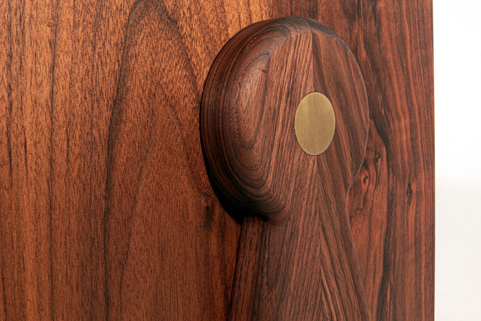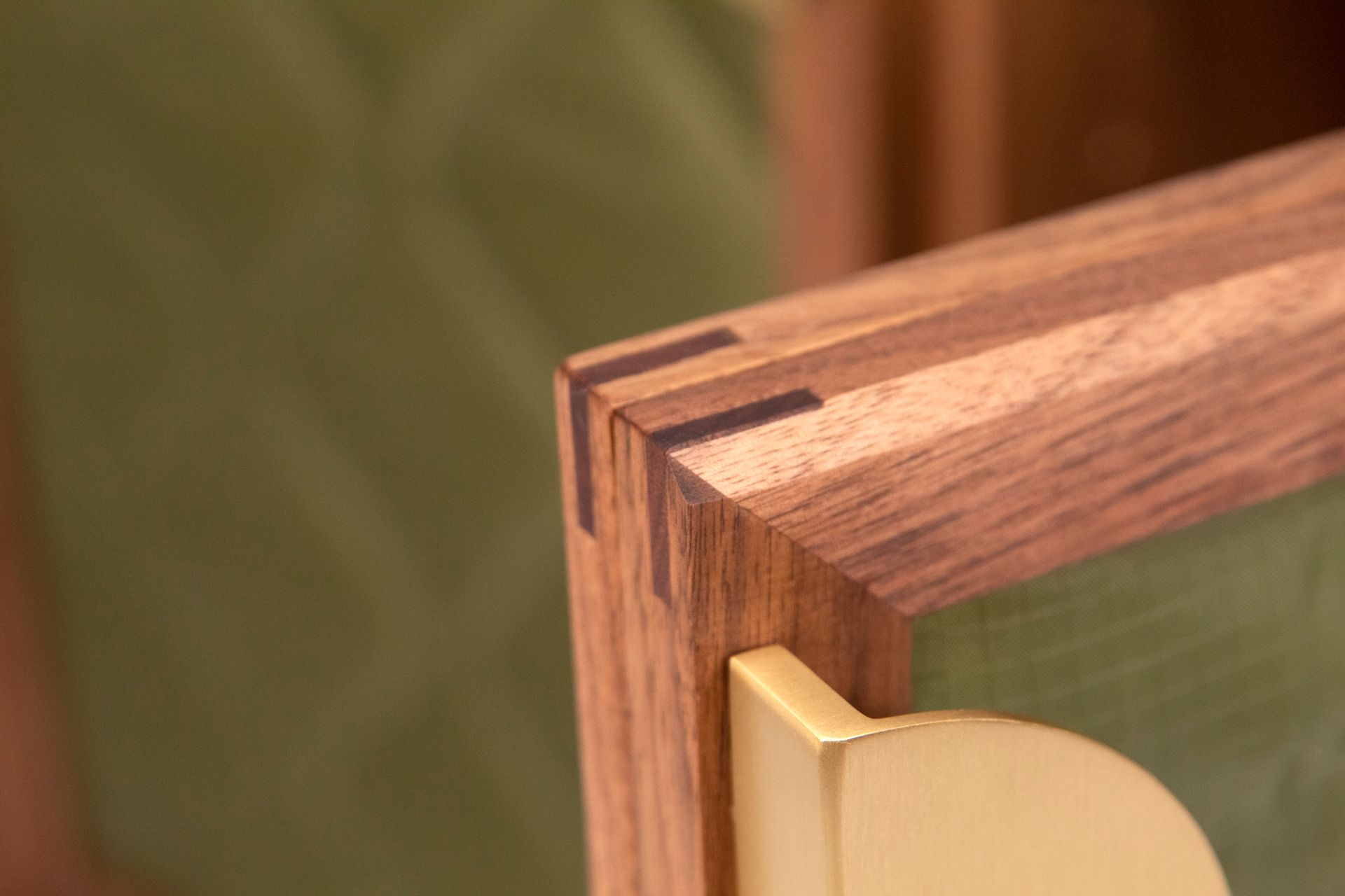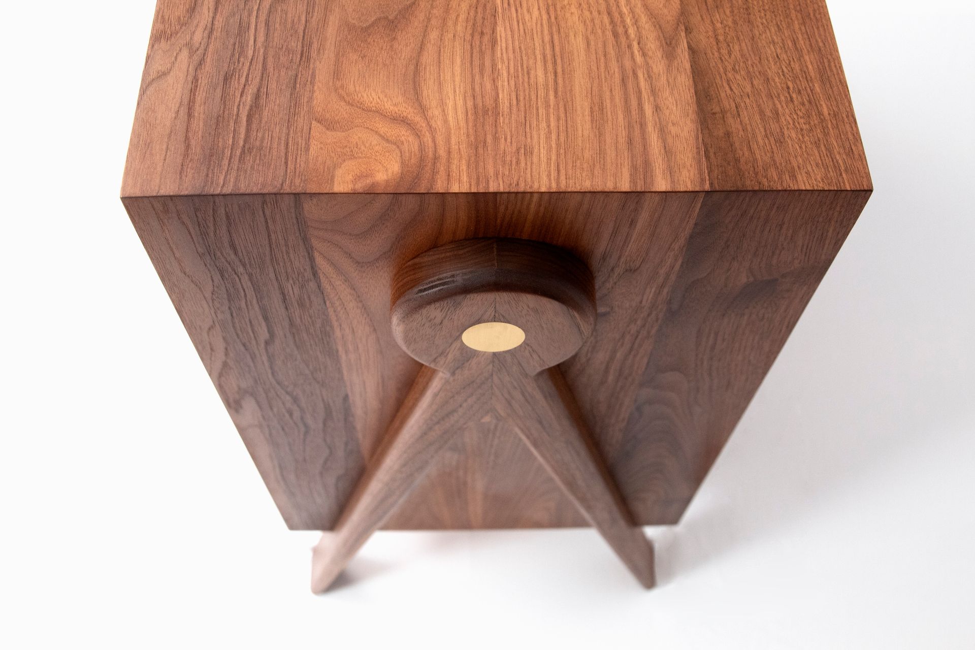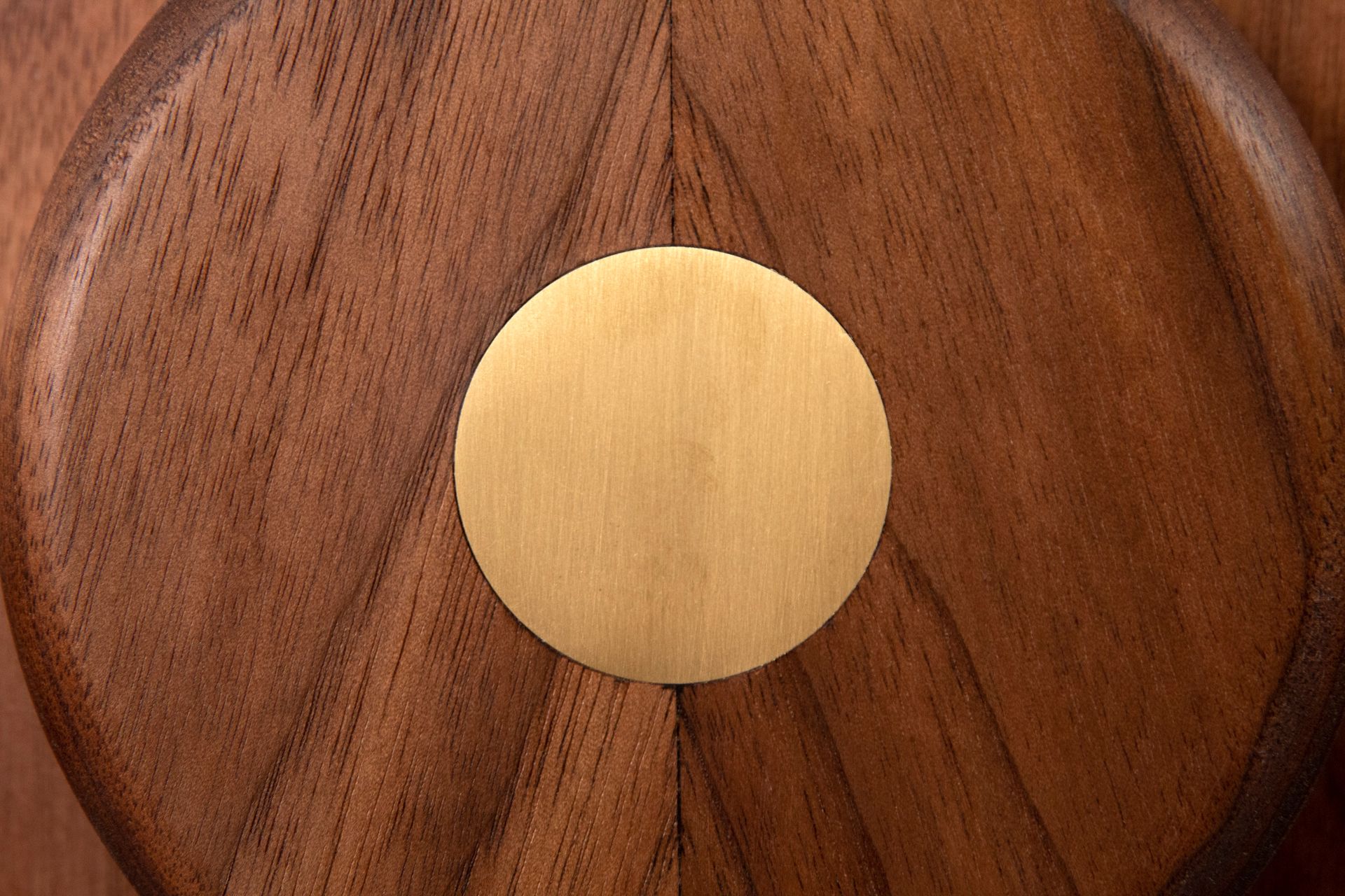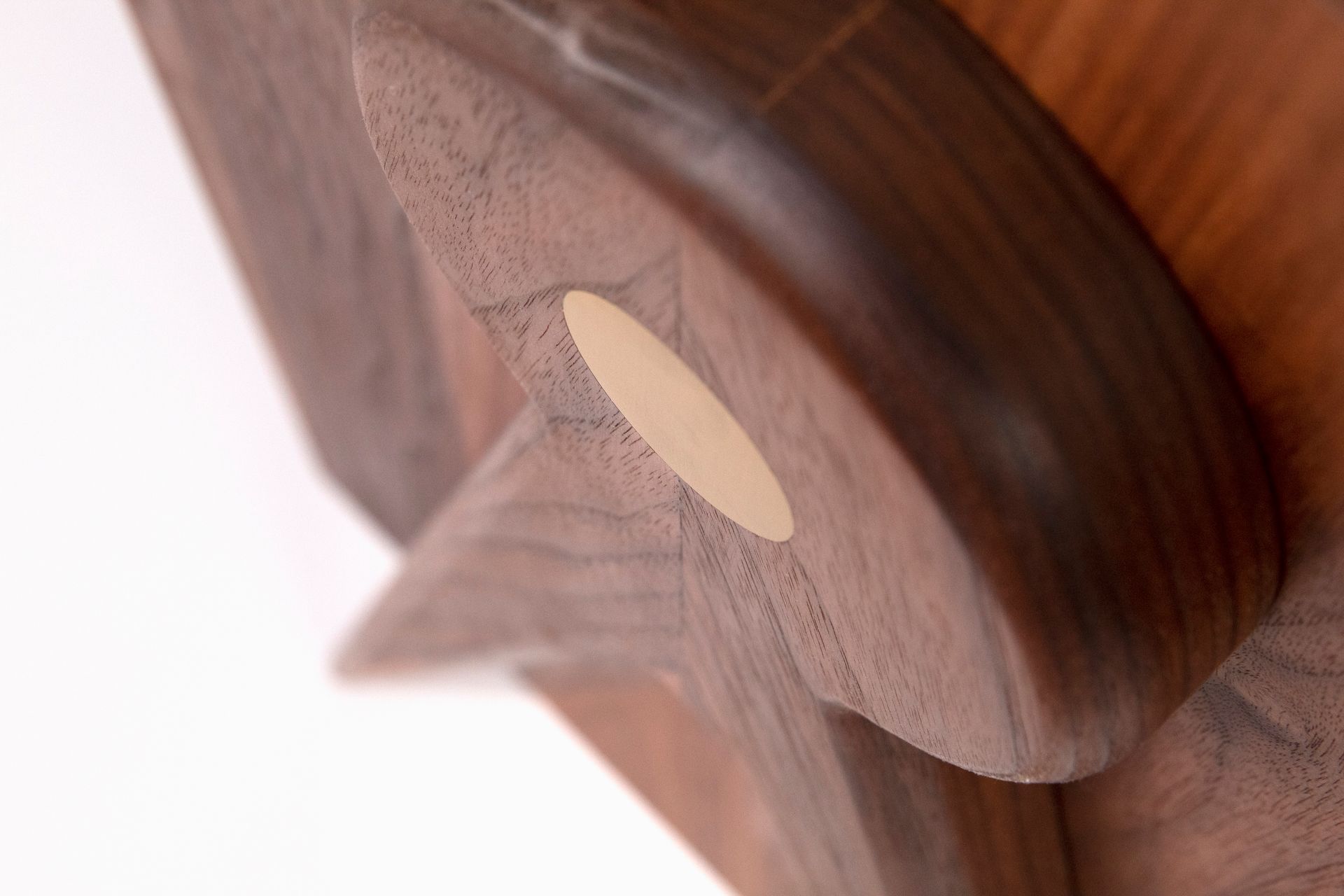 The walnut case is supported with a pair of “compass” legs. These were inspired by a divider compass, which is used in land navigations to help soldiers map distances for navigating different landscapes. This helps ensure we get our comrades home. Embellished with brass dowel, the leg profile elevates this piece to reflect an appreciation for my invaluable time in the U.S. Army.