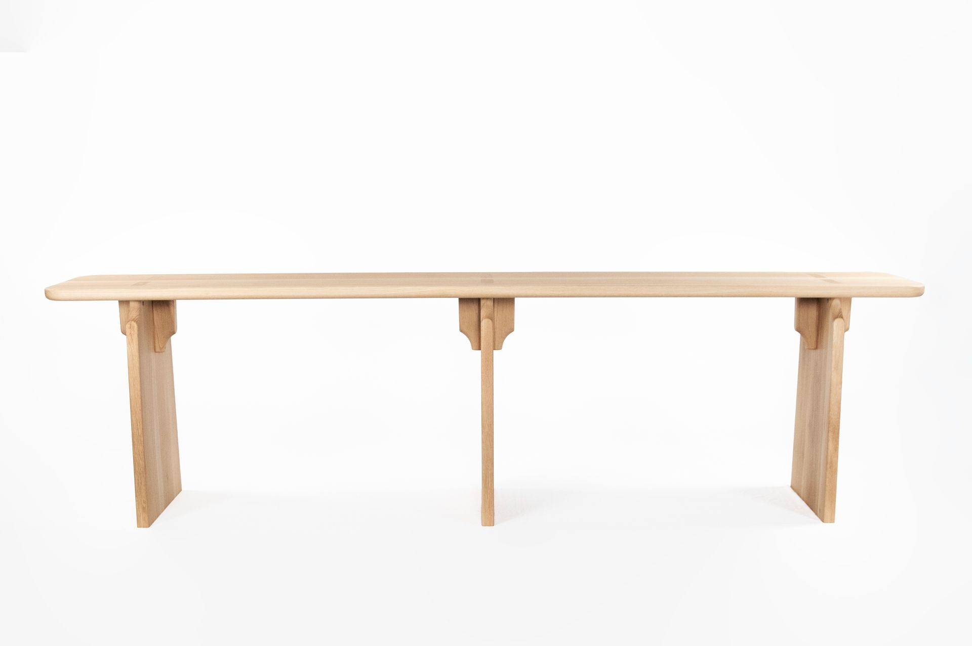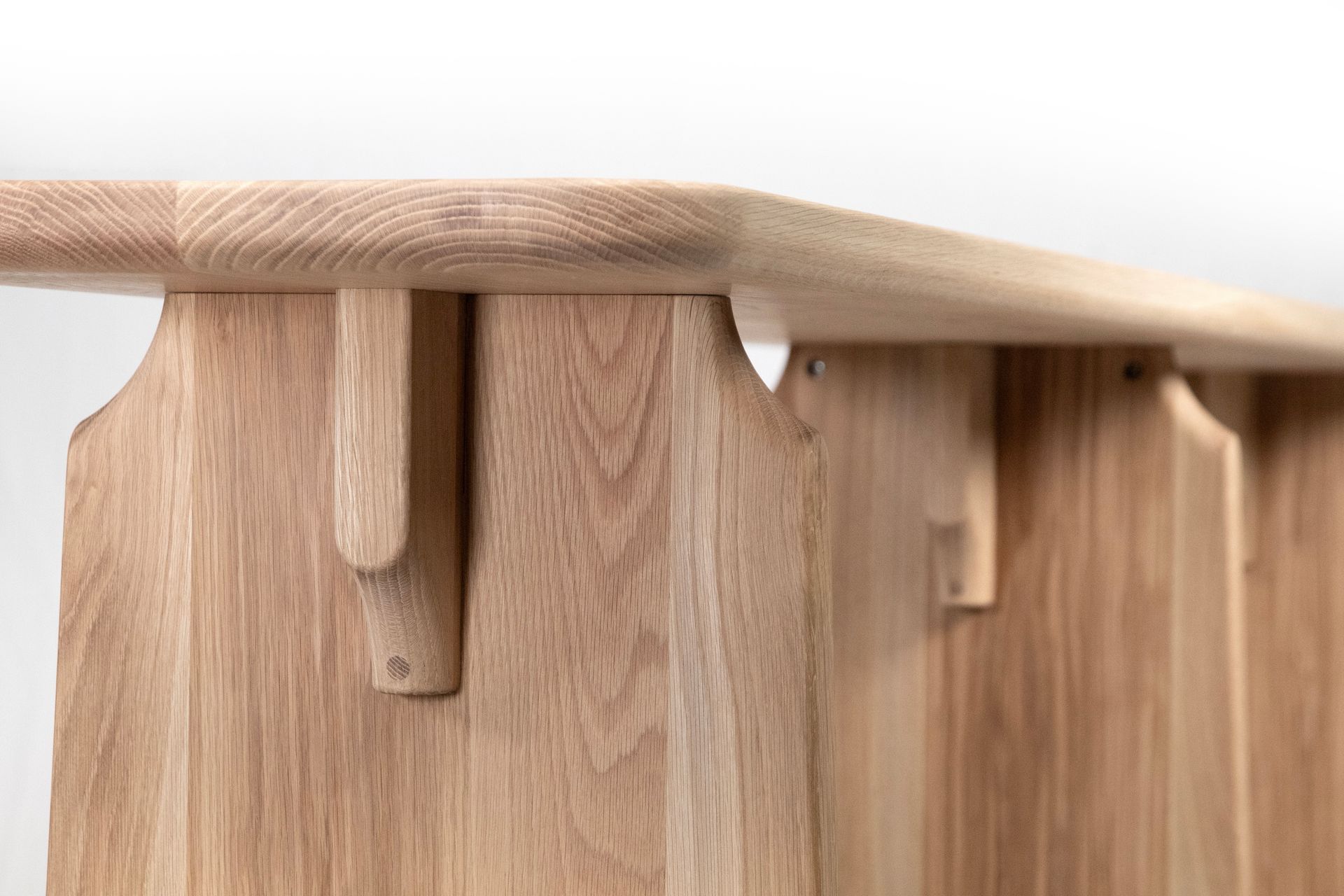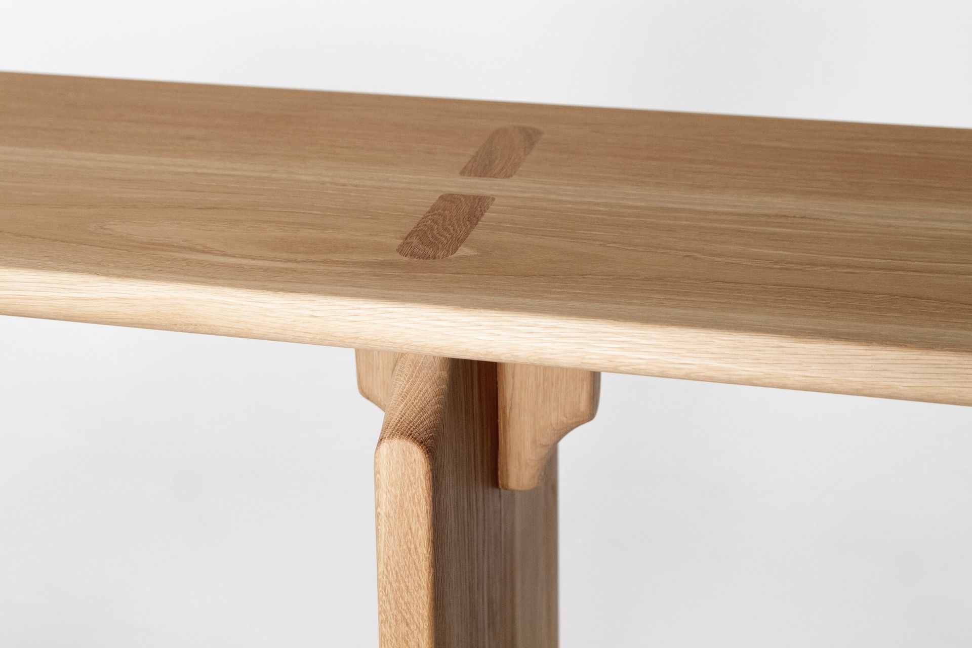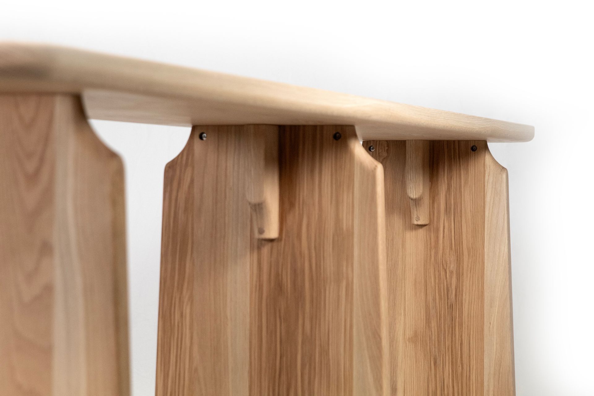 This console table fuses ancient mystery and contemporary design through a Stonehenge-inspired table. This magnificent piece, stretching a massive ten feet in length and supported by pillar-like bases hopes to create awe for its inhabited space. Crafted from solid white oak and coated with a raw-matte plant-based oil, the table aims to replicate the enduring strength of the famous stones. The leg bases are tapered in towards the top and have a soft shoulder before intersecting the bottom of the table surface. Whether sparking conversations about neolithic history or standing as a decorative marvel, this Stonehenge-inspired table invites you to immerse yourself in the enigma of the past while enjoying the functionality of the present.