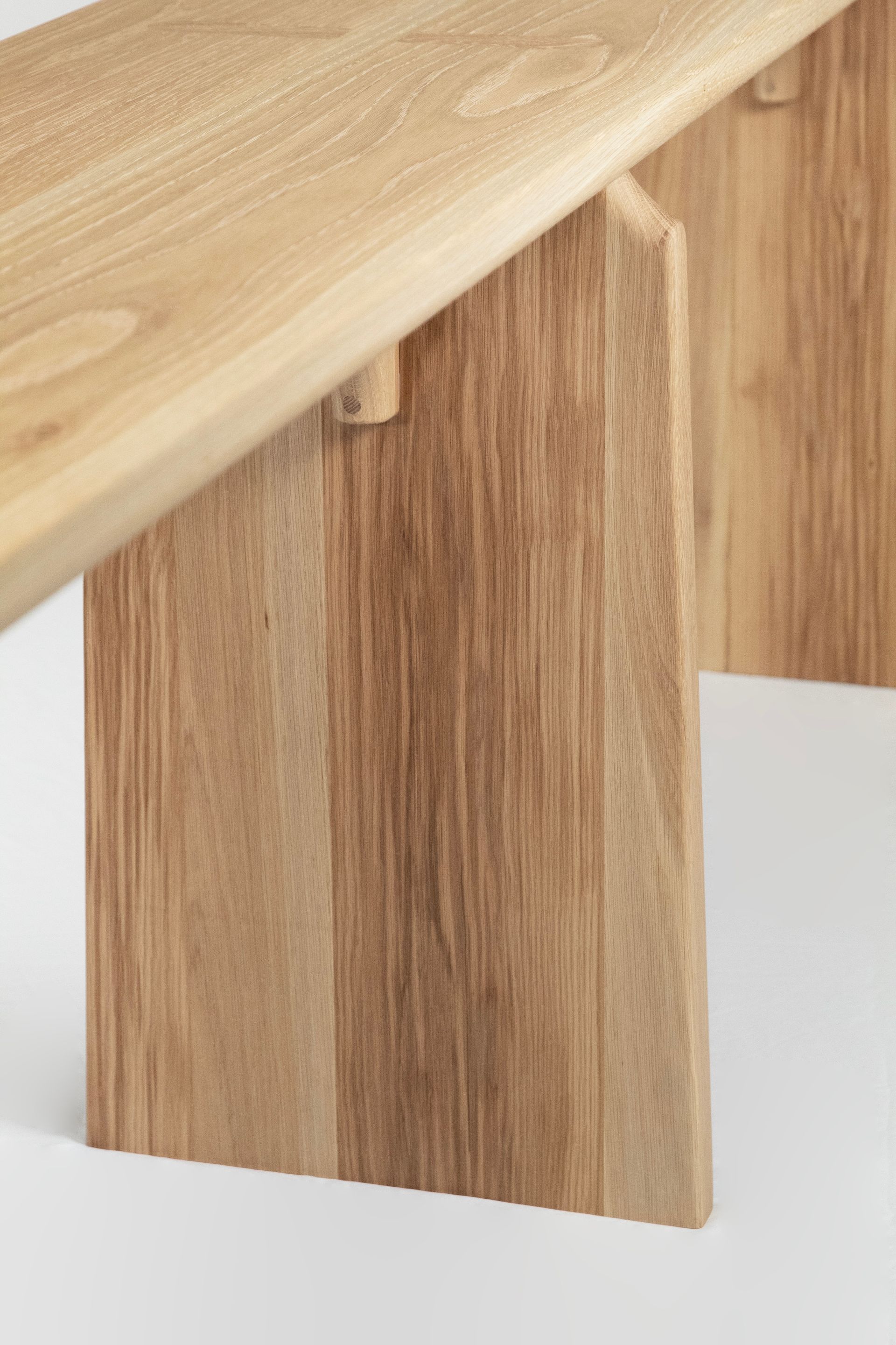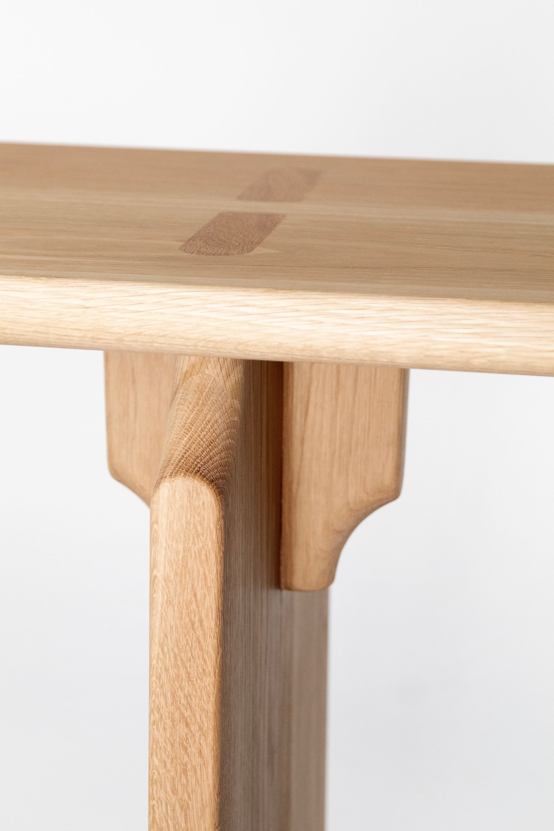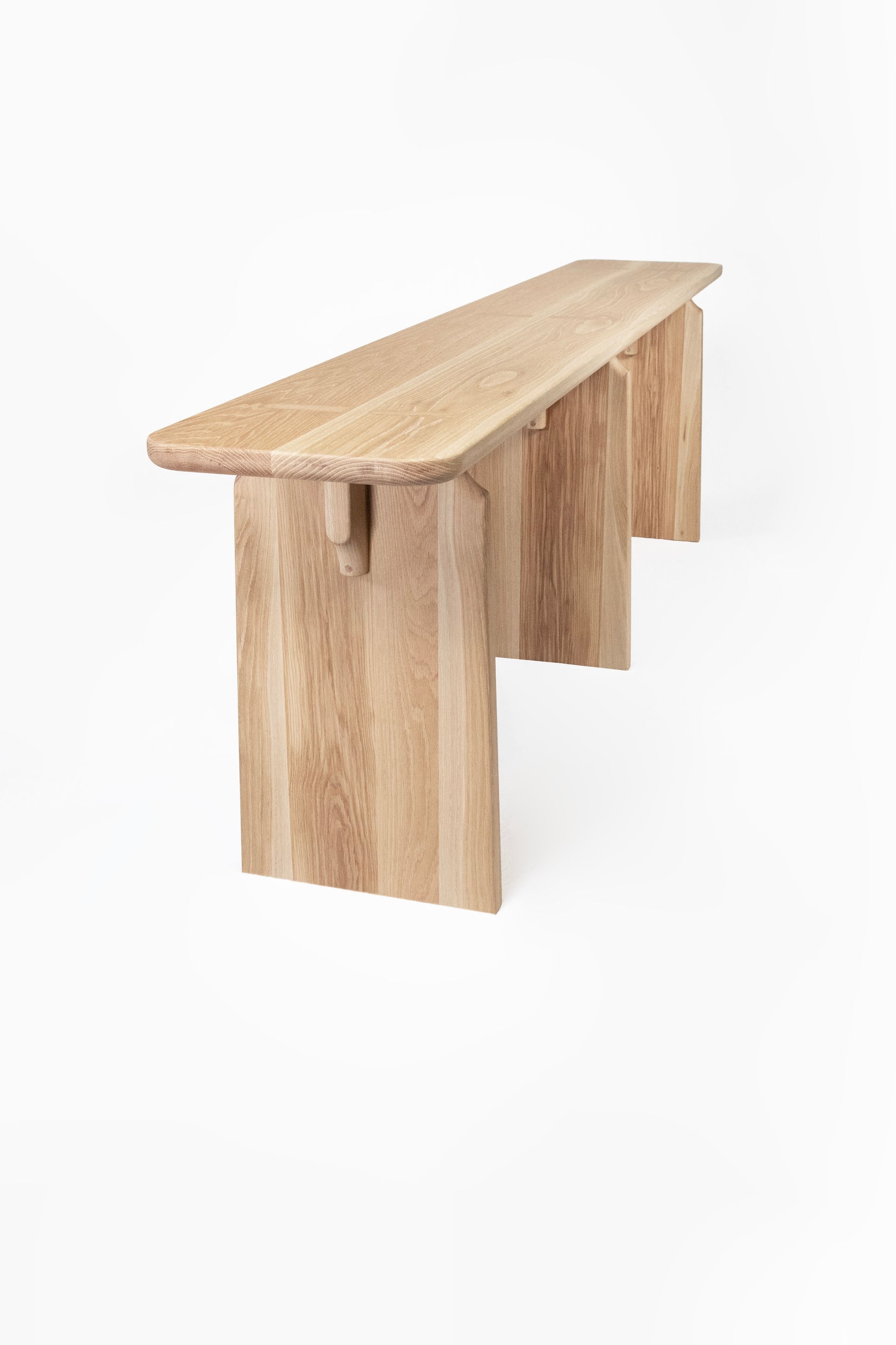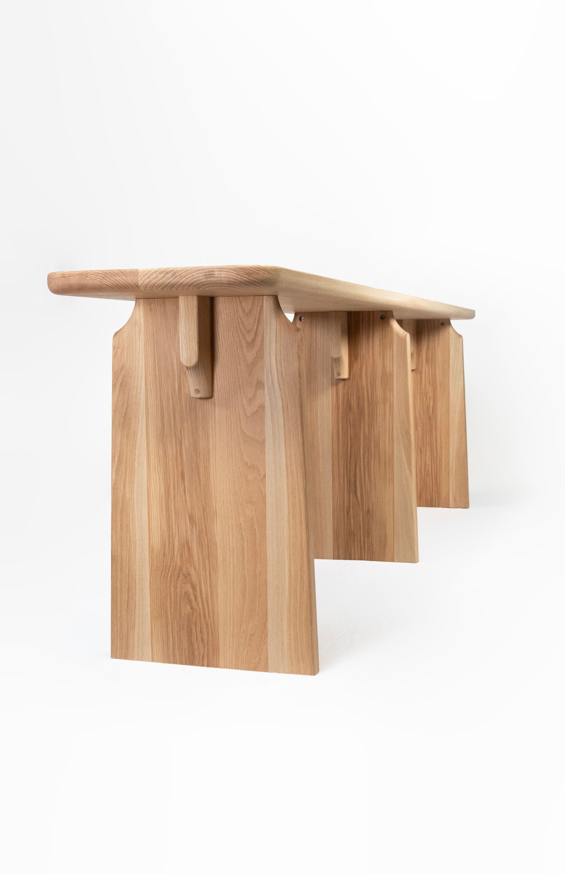 This console table fuses ancient mystery and contemporary design through a Stonehenge-inspired table. This magnificent piece, stretching a massive ten feet in length and supported by pillar-like bases hopes to create awe for its inhabited space. Crafted from solid white oak and coated with a raw-matte plant-based oil, the table aims to replicate the enduring strength of the famous stones. The leg bases are tapered in towards the top and have a soft shoulder before intersecting the bottom of the table surface. Whether sparking conversations about neolithic history or standing as a decorative marvel, this Stonehenge-inspired table invites you to immerse yourself in the enigma of the past while enjoying the functionality of the present.