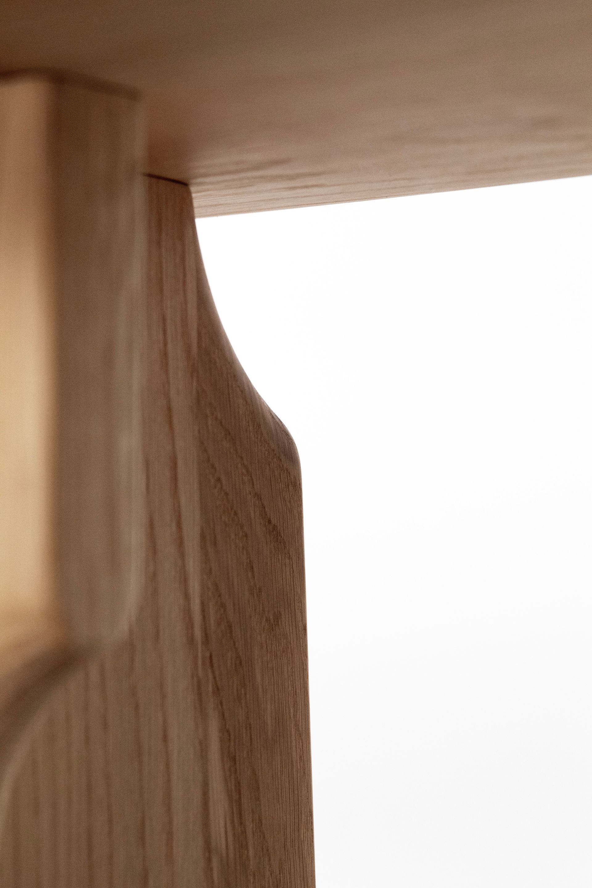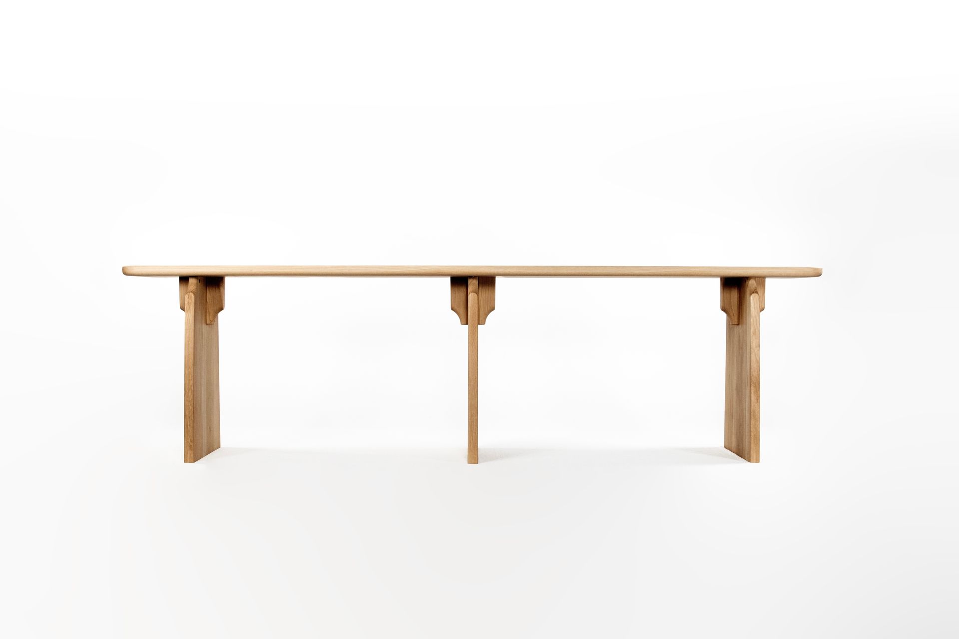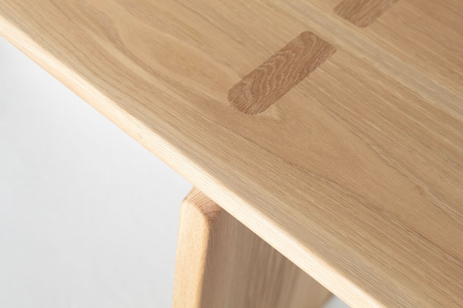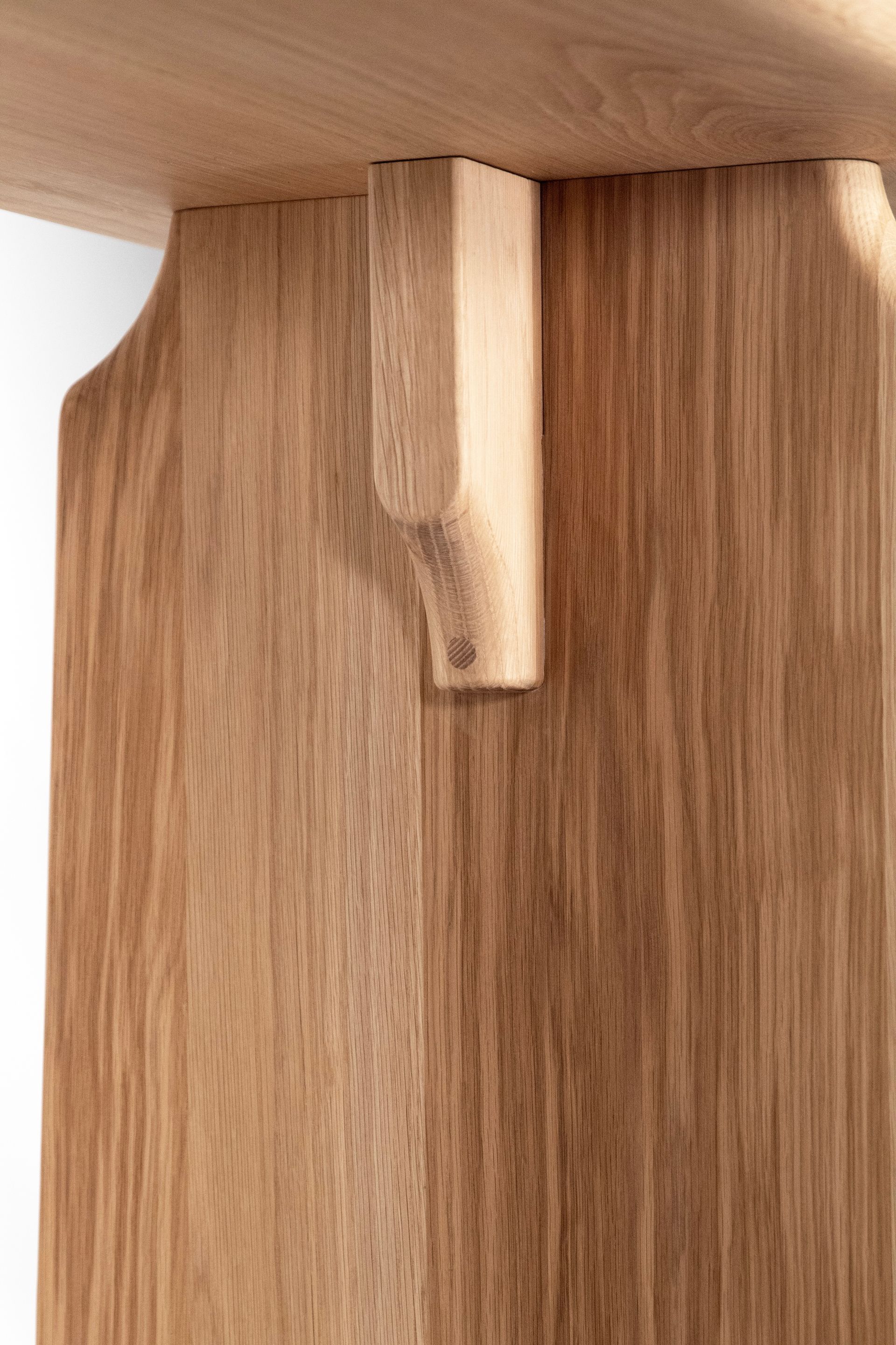 This console table fuses ancient mystery and contemporary design through a Stonehenge-inspired table. This magnificent piece, stretching a massive ten feet in length and supported by pillar-like bases hopes to create awe for its inhabited space. Crafted from solid white oak and coated with a raw-matte plant-based oil, the table aims to replicate the enduring strength of the famous stones. The leg bases are tapered in towards the top and have a soft shoulder before intersecting the bottom of the table surface. Whether sparking conversations about neolithic history or standing as a decorative marvel, this Stonehenge-inspired table invites you to immerse yourself in the enigma of the past while enjoying the functionality of the present.
