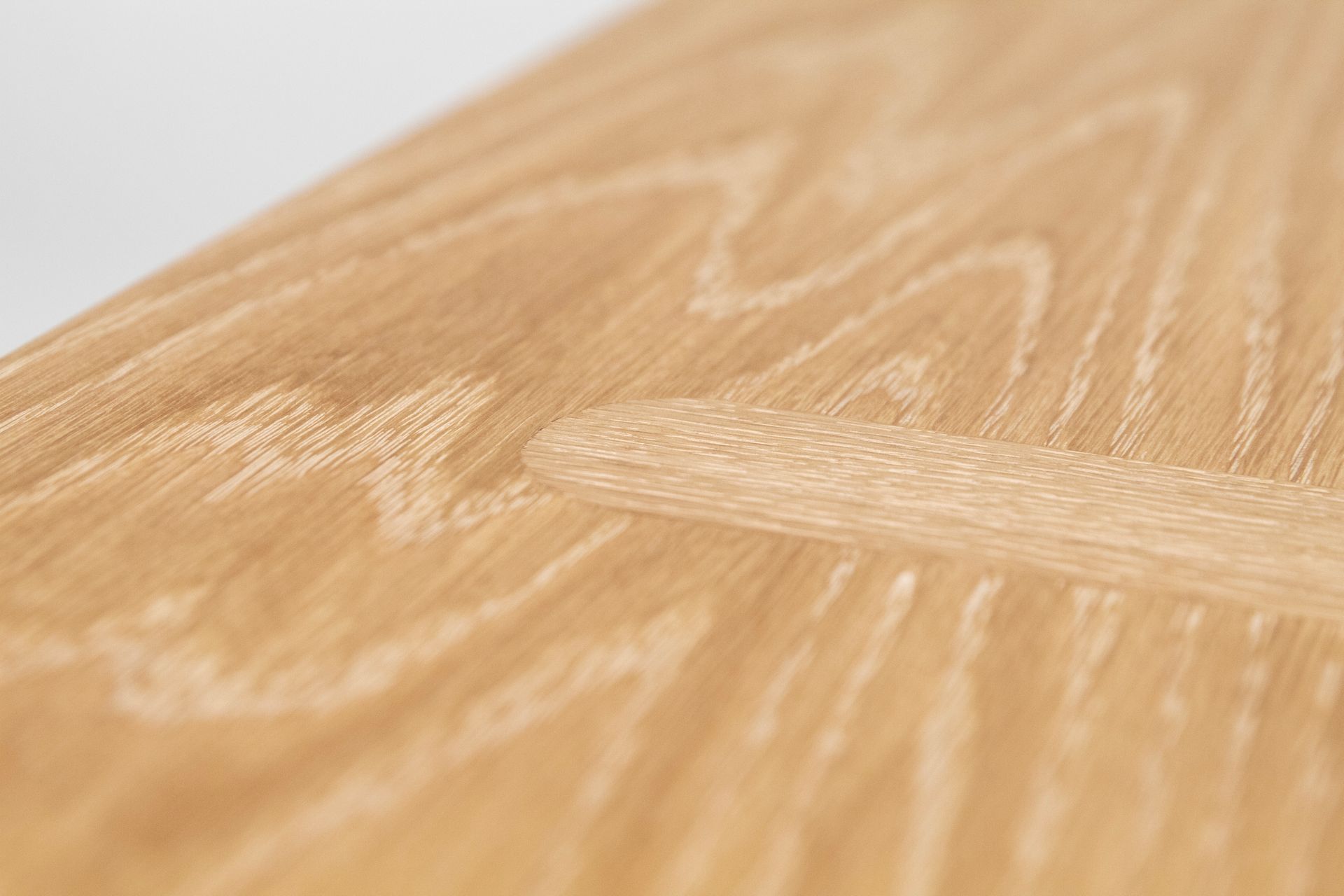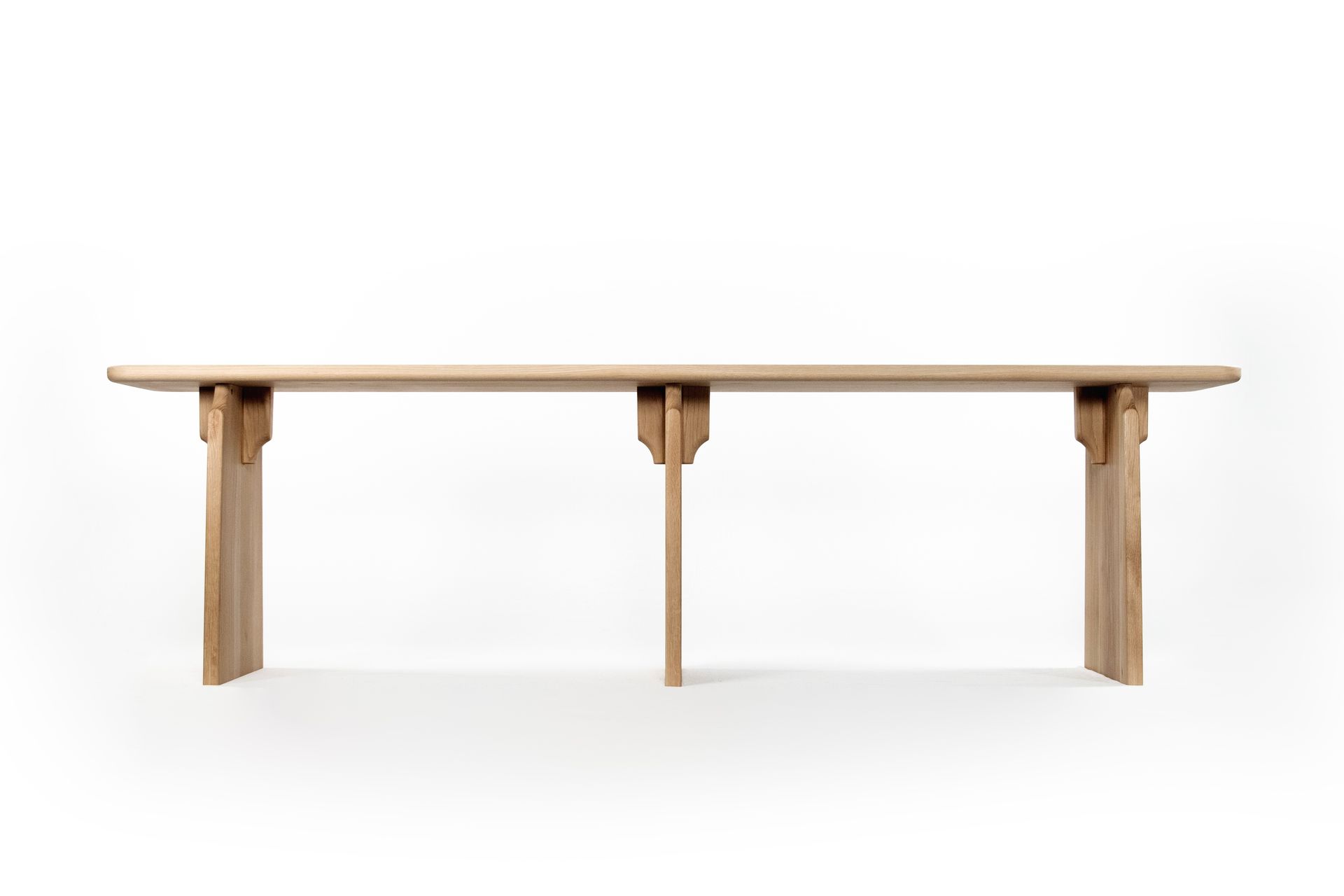 The Wood Henge table is simple in form, but complex in how the parts interact with each other. The base pieces (legs and support) have mirroring profiles that relate and play together as interlocking pieces. The top has inlays that project the shape of the legs underneath. The form is visually heavy yet soft on the eyes. This contrasting echo is possible through the harmonies of curvature.