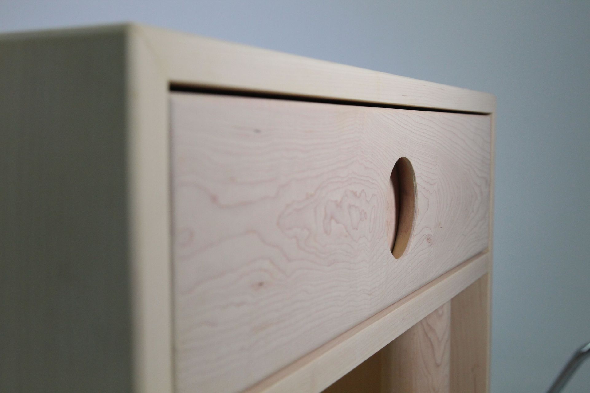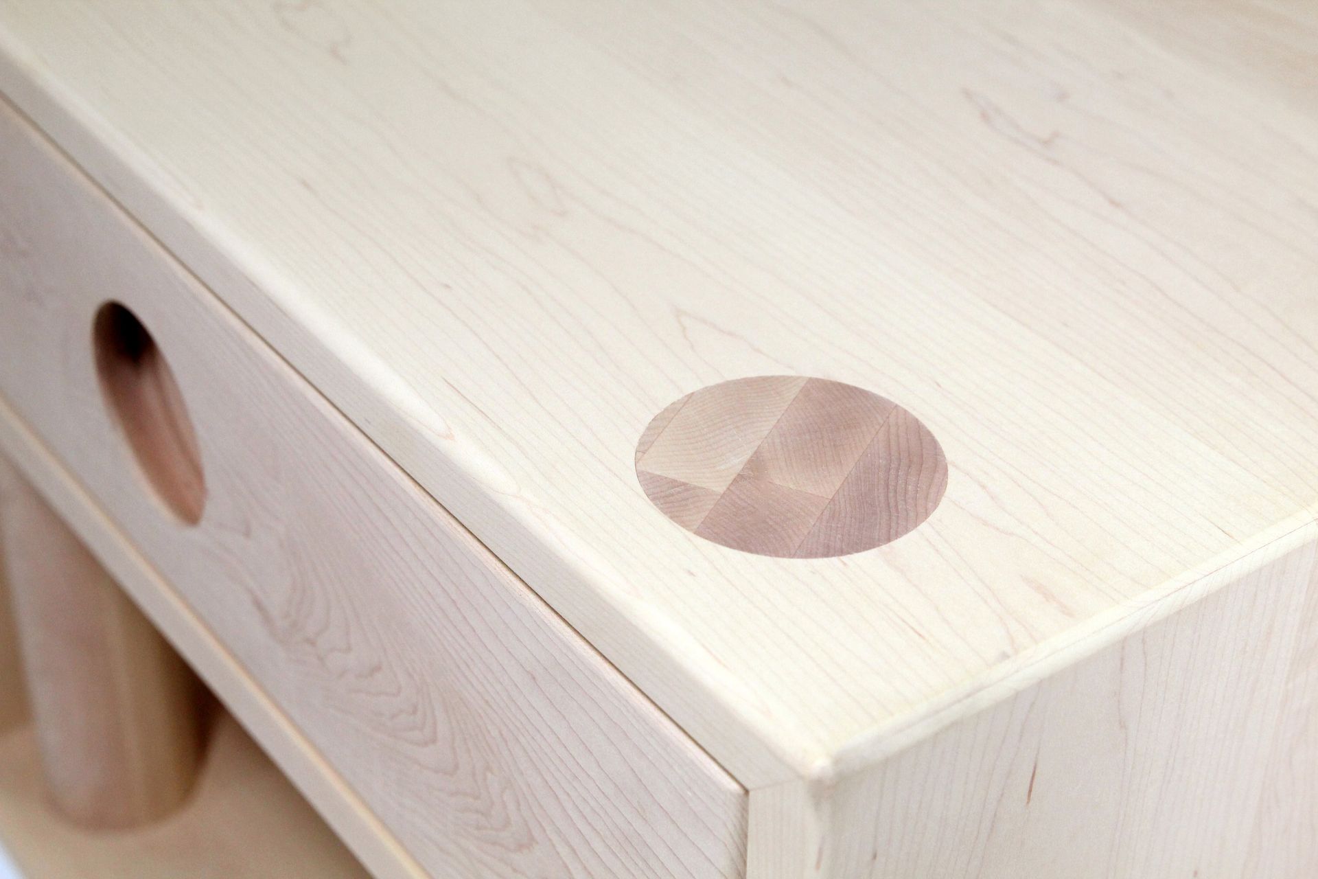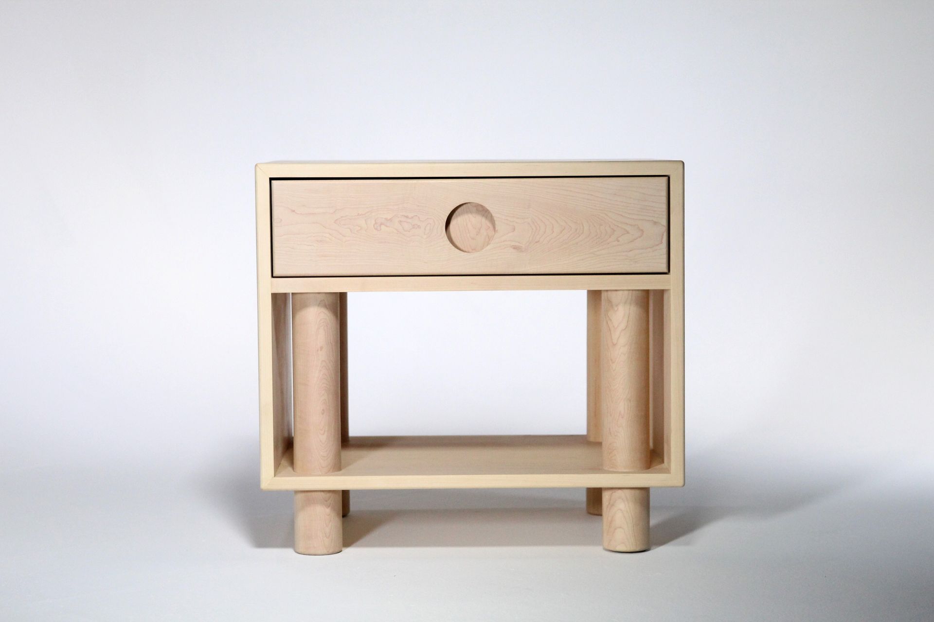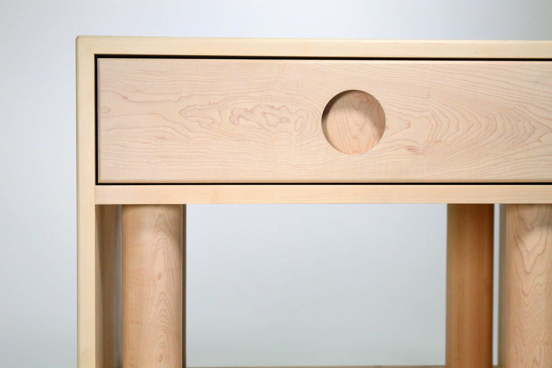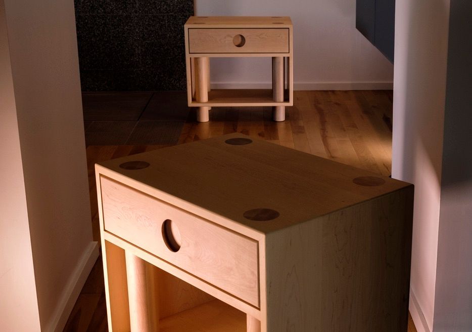 The Barracks bedside was designed with simple architectural principles using clean lines and balanced geometries, similar to housing blocks on military bases. I over-emphasized the support for this piece by enlarging the dowel through-legs. The exaggerated pillars add a playful interaction with the mitered casework, but still lend well to storage and function.
