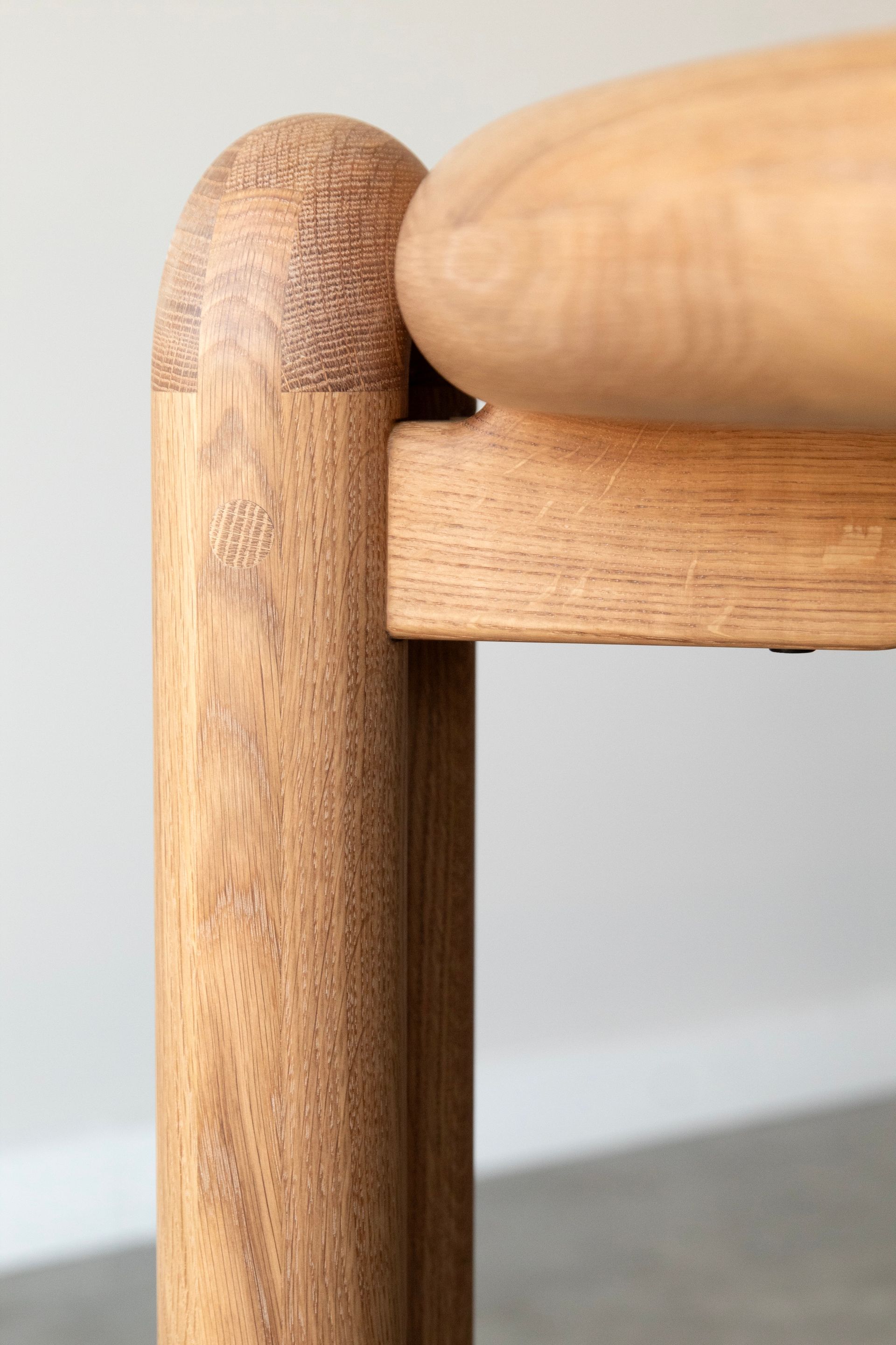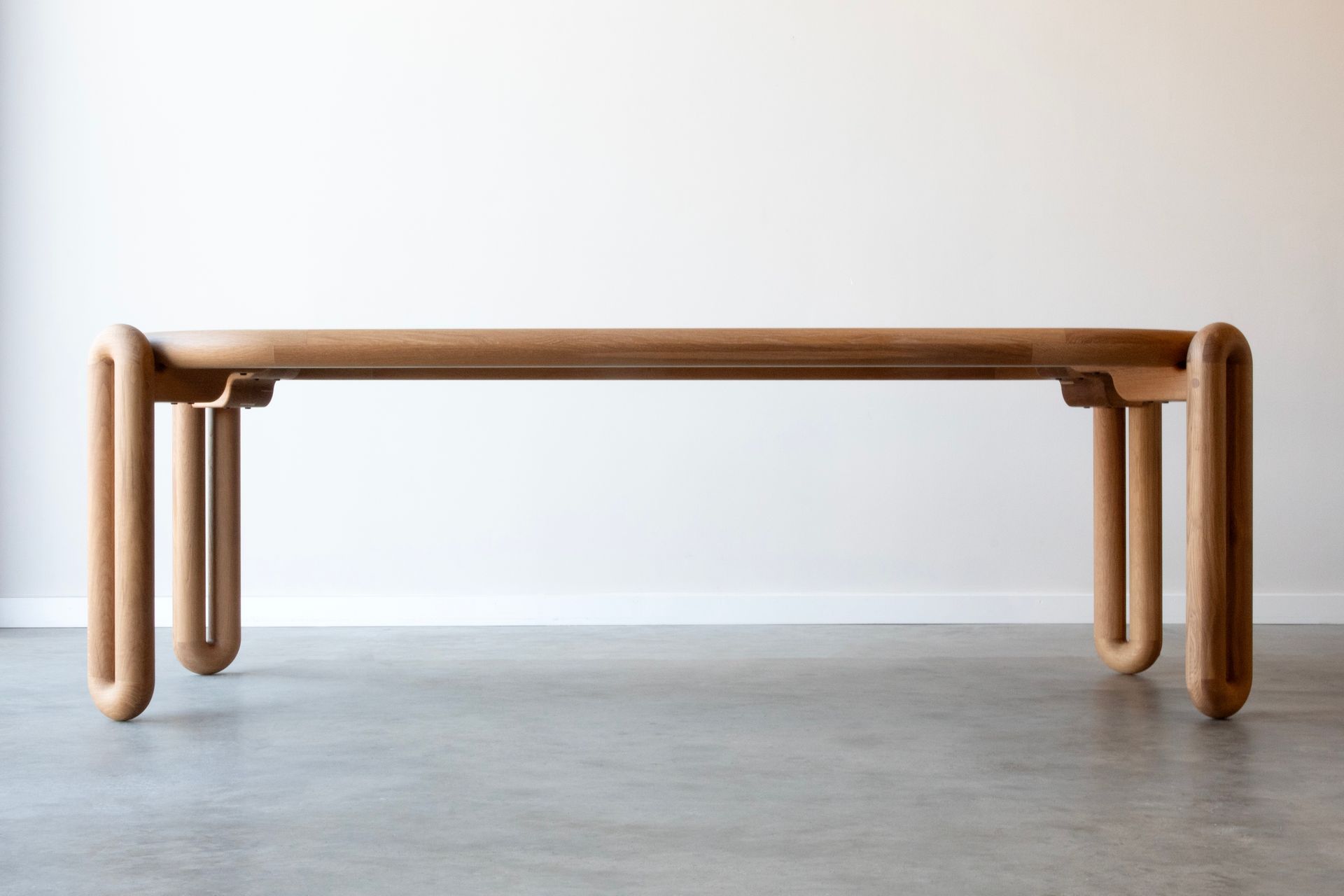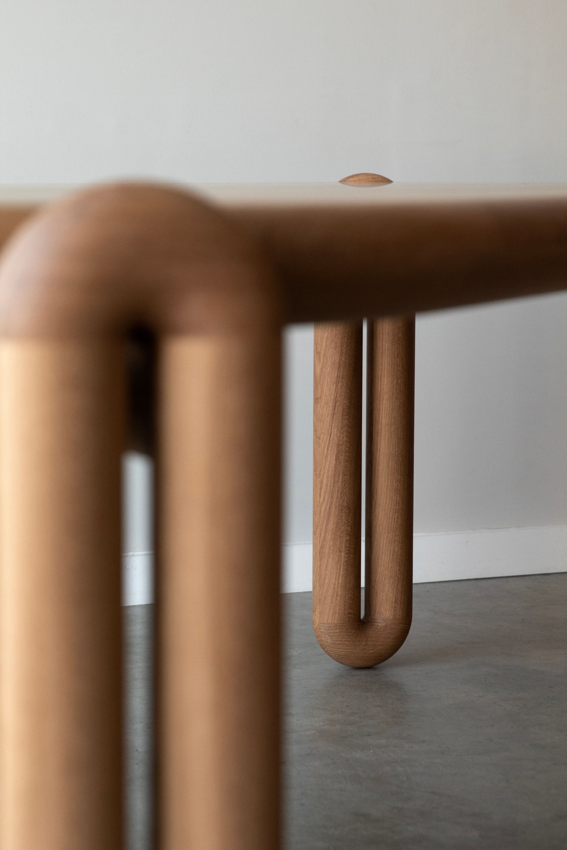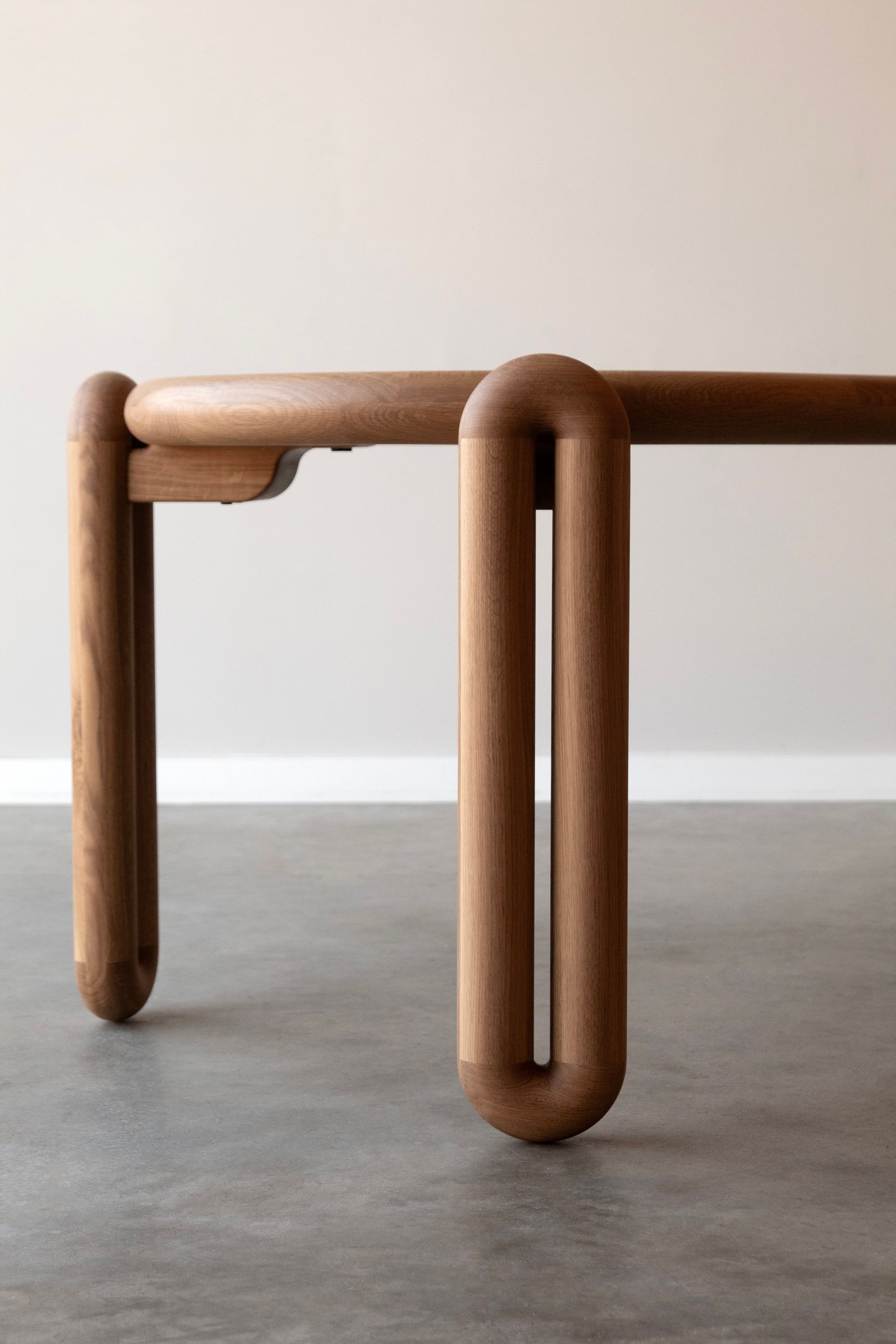 The design is defined by its legs whereby each one takes shape by extruding a torus. A stout gusset is then mortised into each tube of a single leg and then mounted into a register at each corner of the racetrack shaped surface. A diameter of three inches is what guides the thickness of the parts. All of these factors give this unique design a fun, sturdy, and a meticulously simple form.